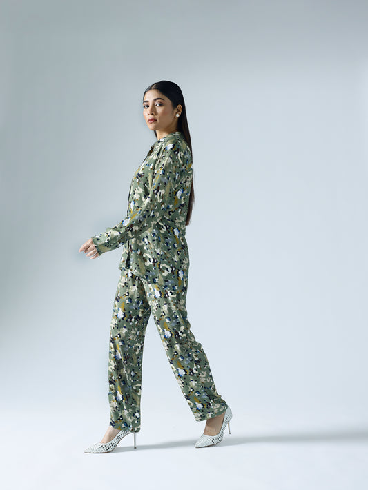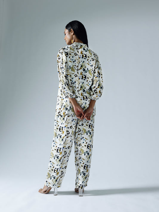 Vivid White Zipped Jacket Set With Pixelated White Pants