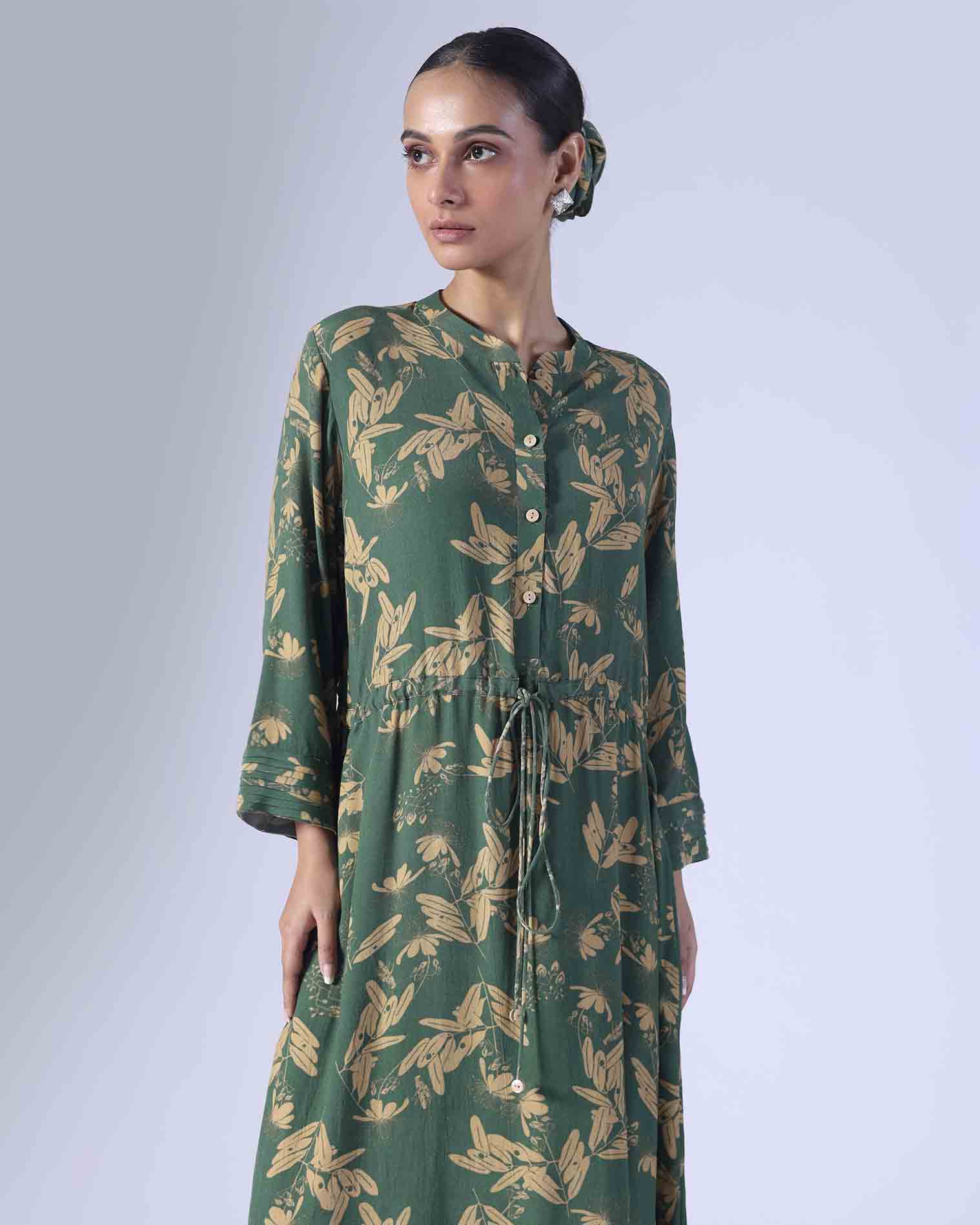 Printed long dress with drawstring around the waist, with pockets. Sold as one set. Three fourth sleeves with pleated detailing. Chinese collar with front open with buttons till torso. Side slits. Regular fit.