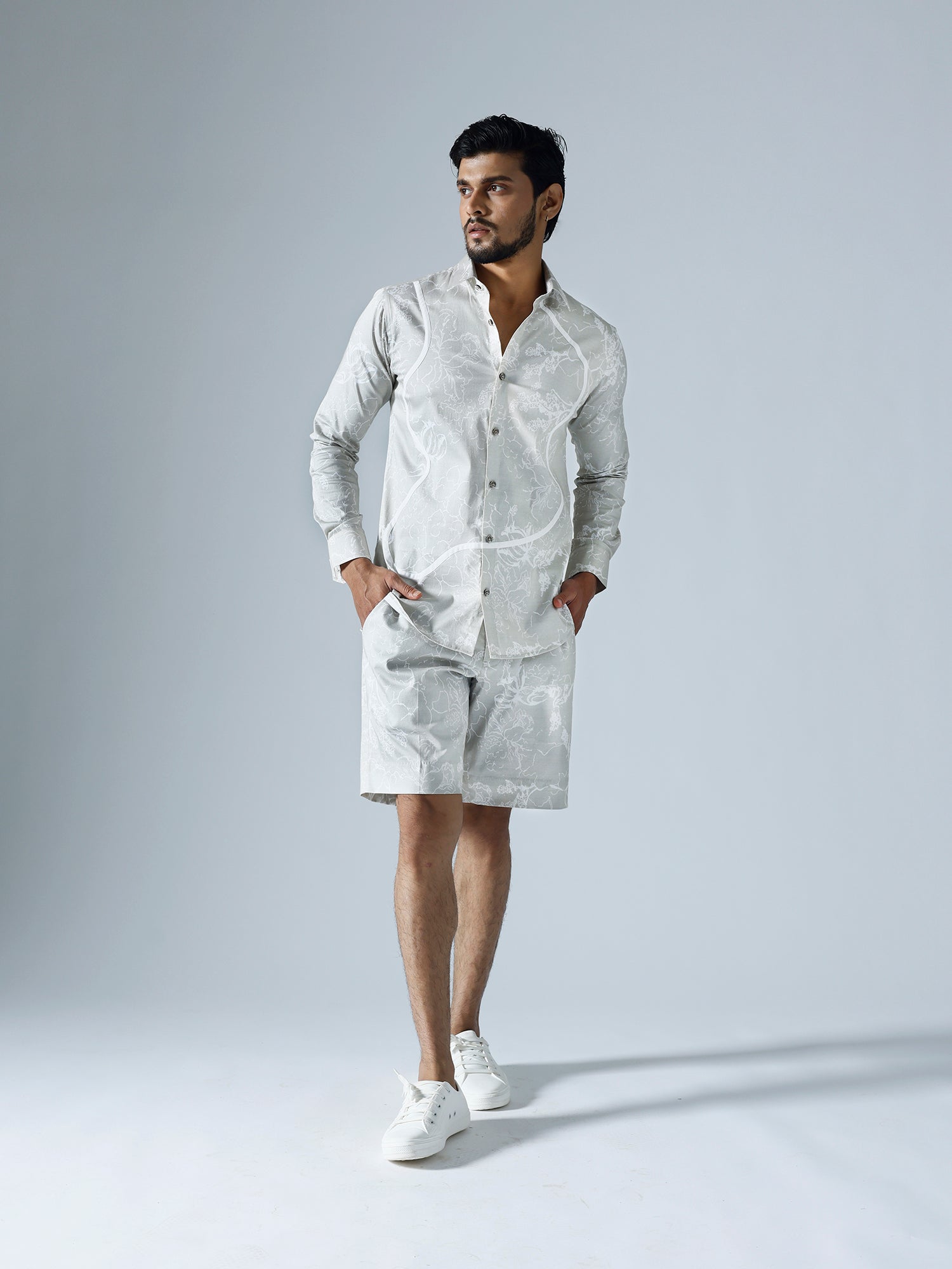 Light grey printed co-ord set for Men with a button-up cuff, spread out collar and white highlighted feature on the shirt. Paired with a half pant in the same print .