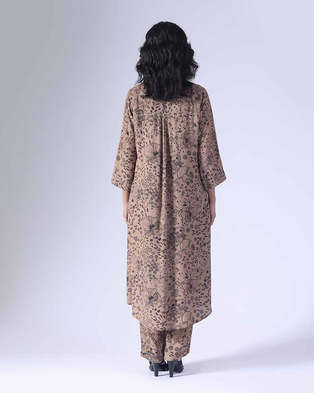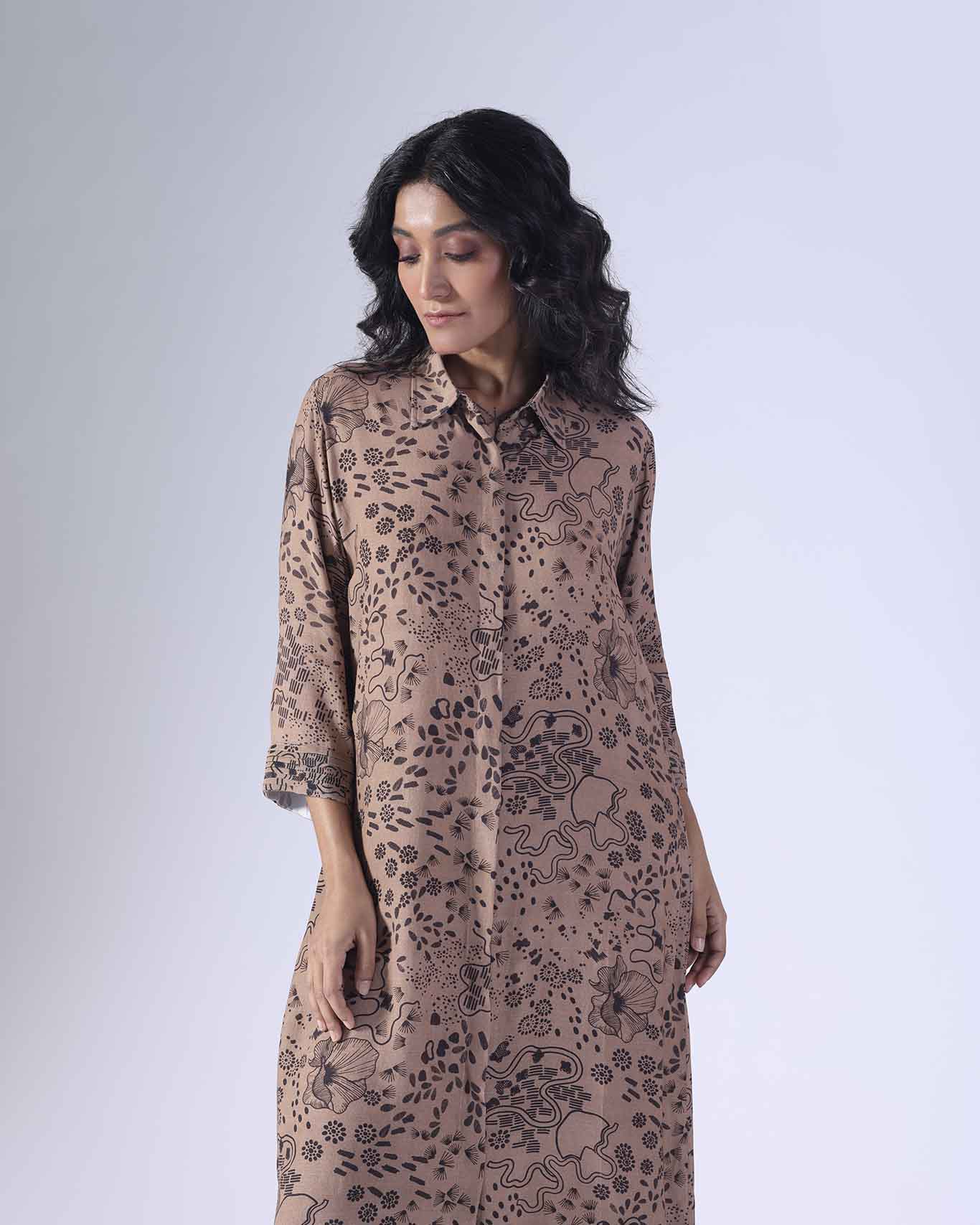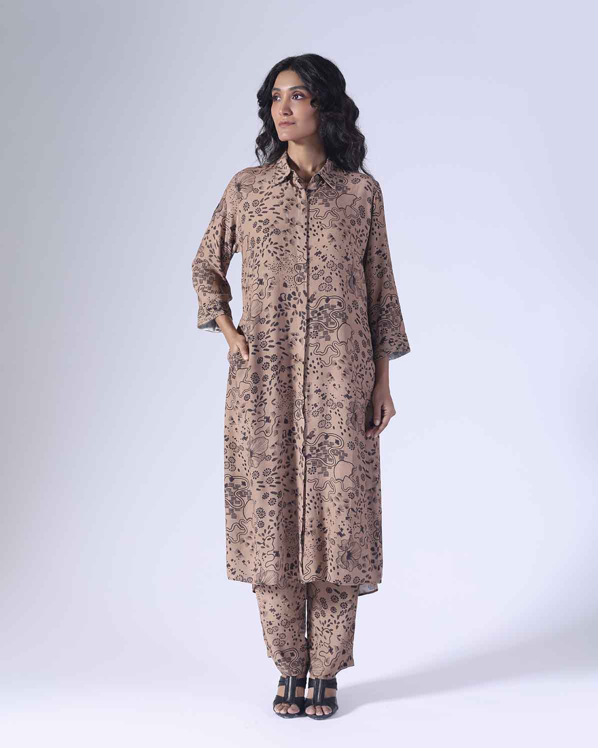 Printed long co-ordinated set. Sold as a set of 2. Shirt collar with front concealed buttons. Three fourth pleated sleeves. Back with thin pleats. Pants with pocket and back elastic. Zip fly fastening with a single hook opening on one side. Mid rise. Regular fit.