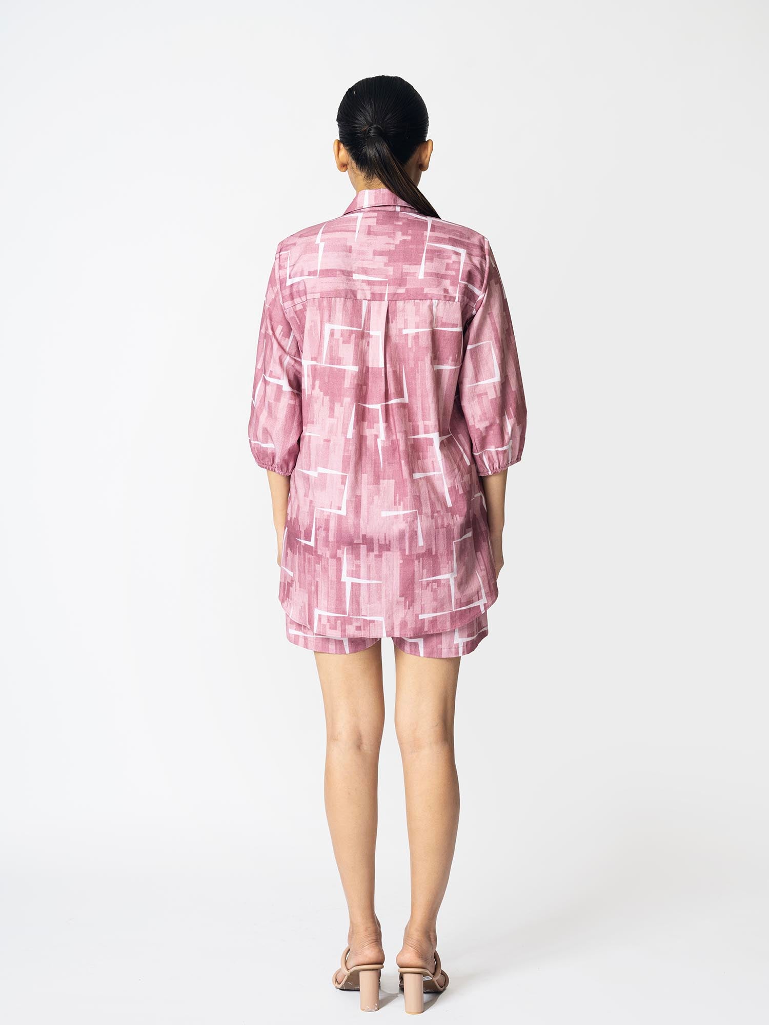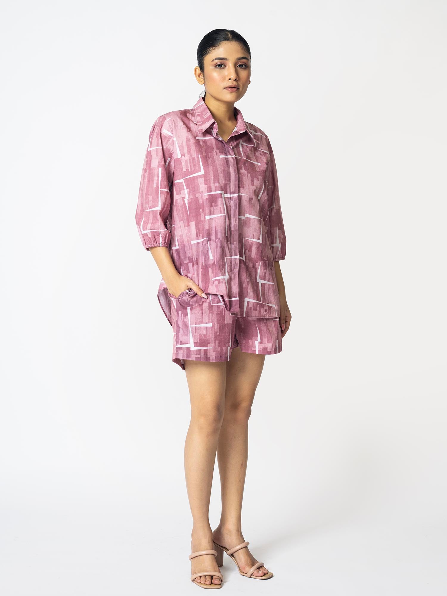 Three fourth elastic sleeve high low shirt with front concealed buttons, and back box pleat. Shorts with pocket and back elastic. Zip fly fastening with a single hook fastening on one side. Mid rise. Regular fit.