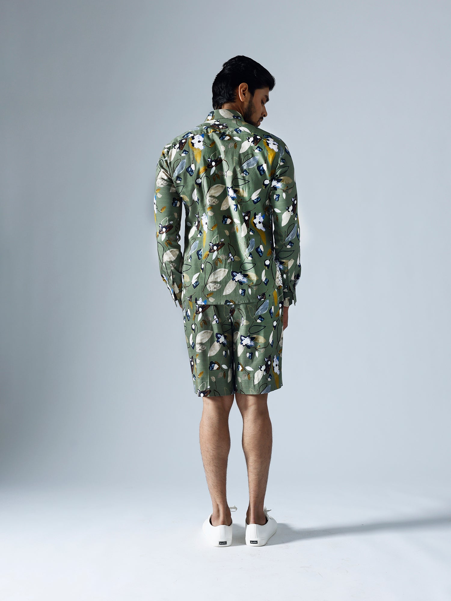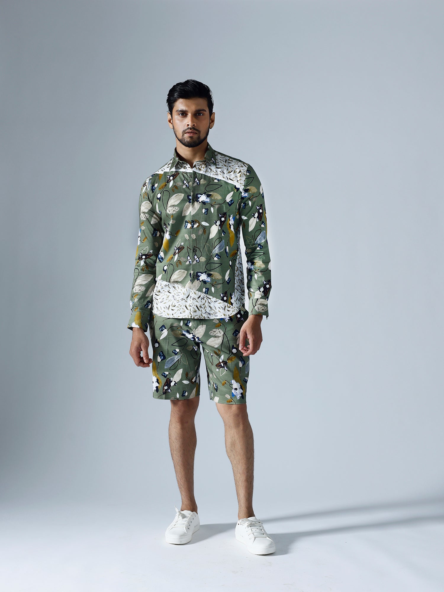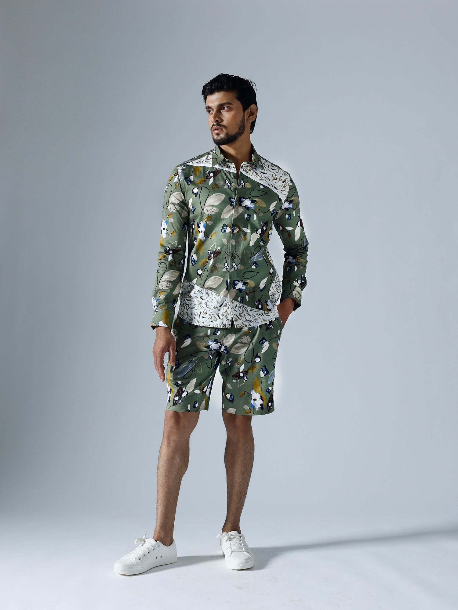 Printed Full sleeve Shirt with button up cuff. This co-ord set features a smart half and half print mish mash at front of the shirt .