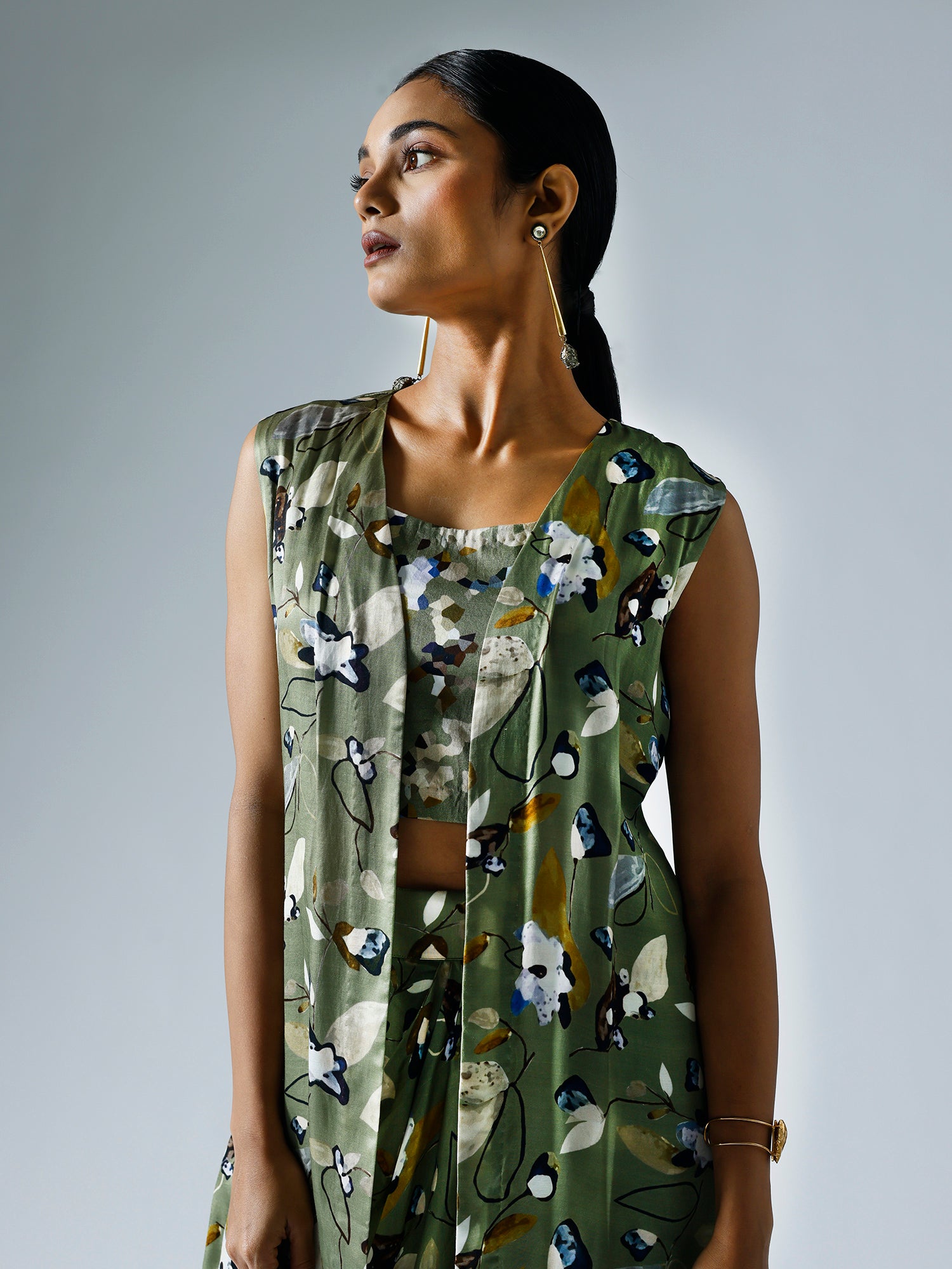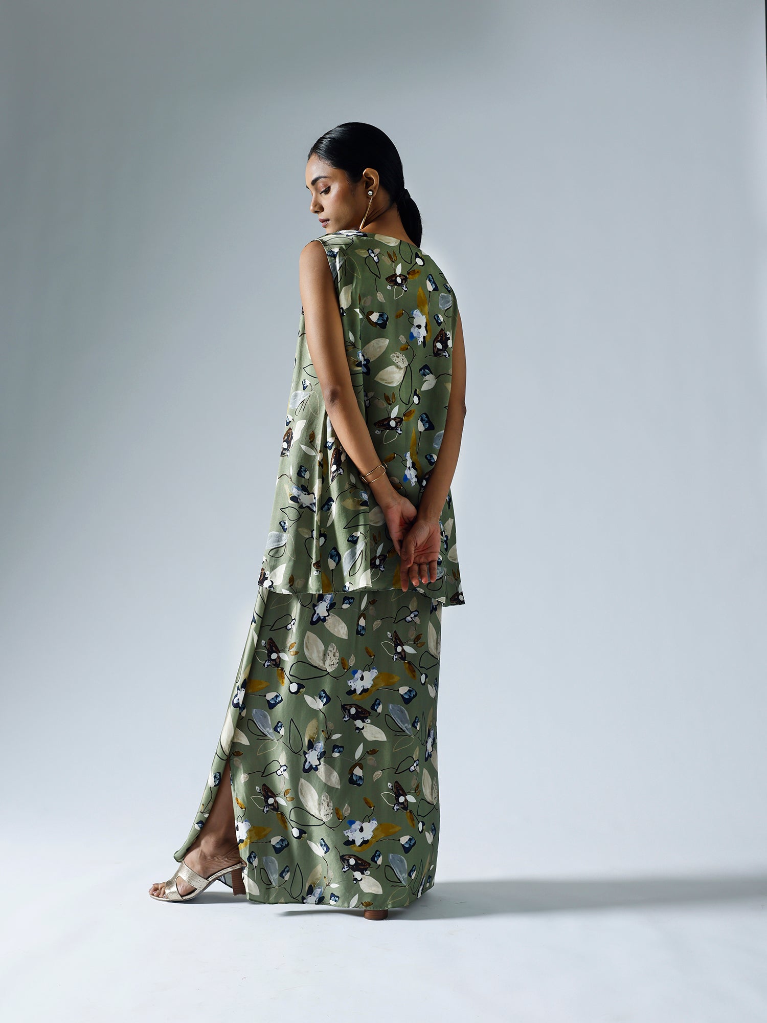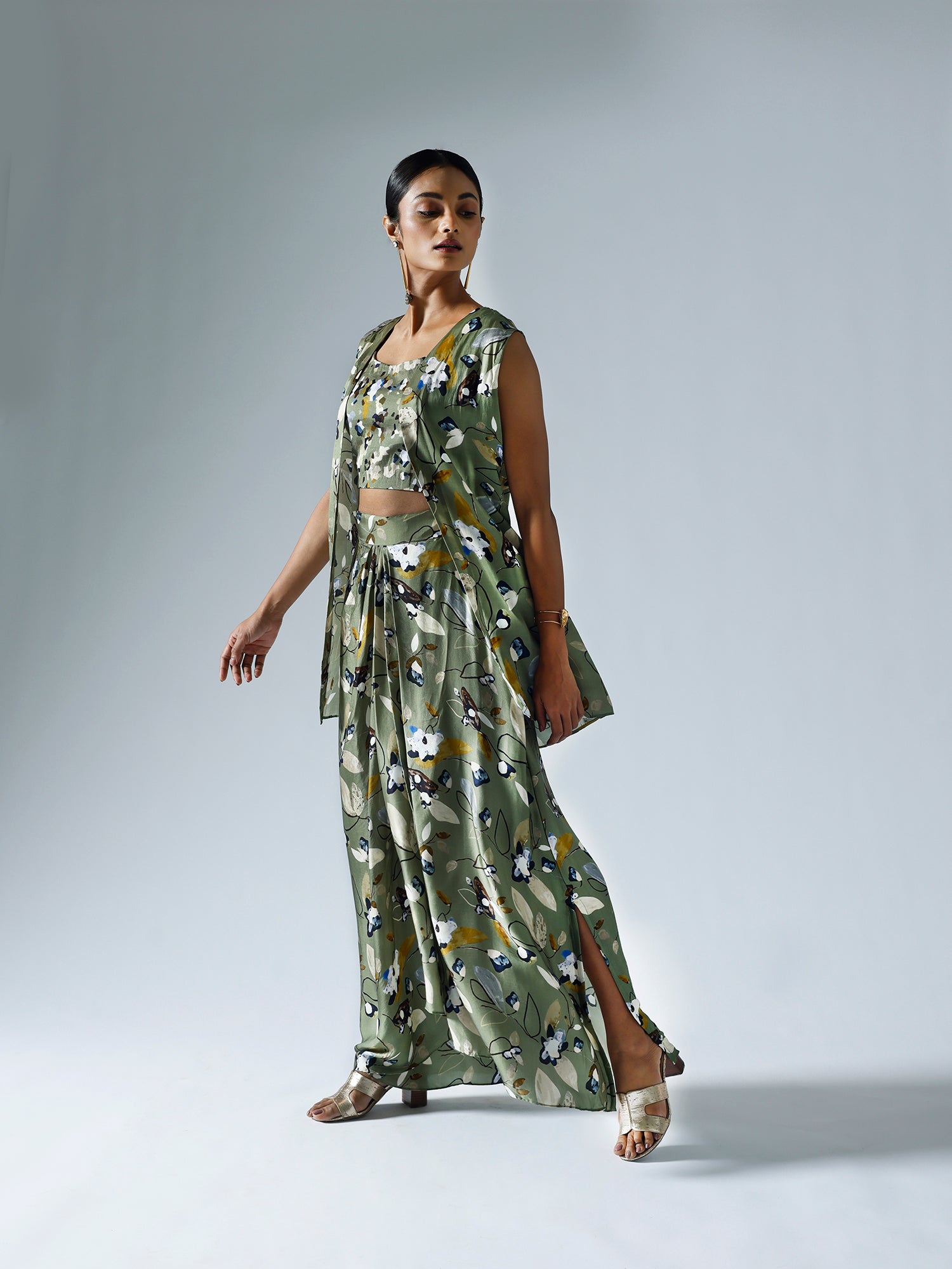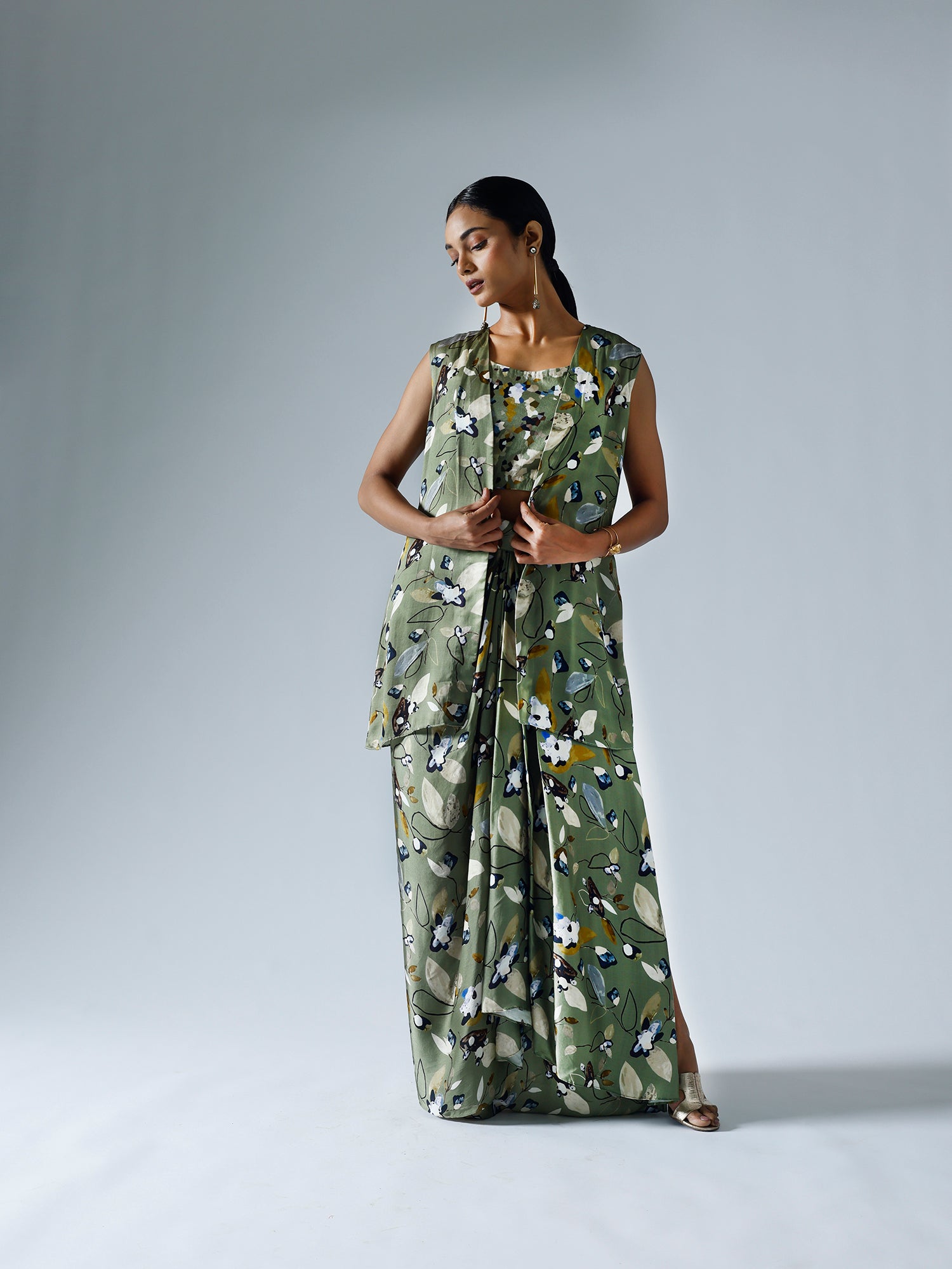 Three fourth sleeve jacket. Inner is sleeveless. Draped skirt, with side slit and back elastic. Zip fly fastening with a single hook fastening on one side. Mid rise. Regular fit.