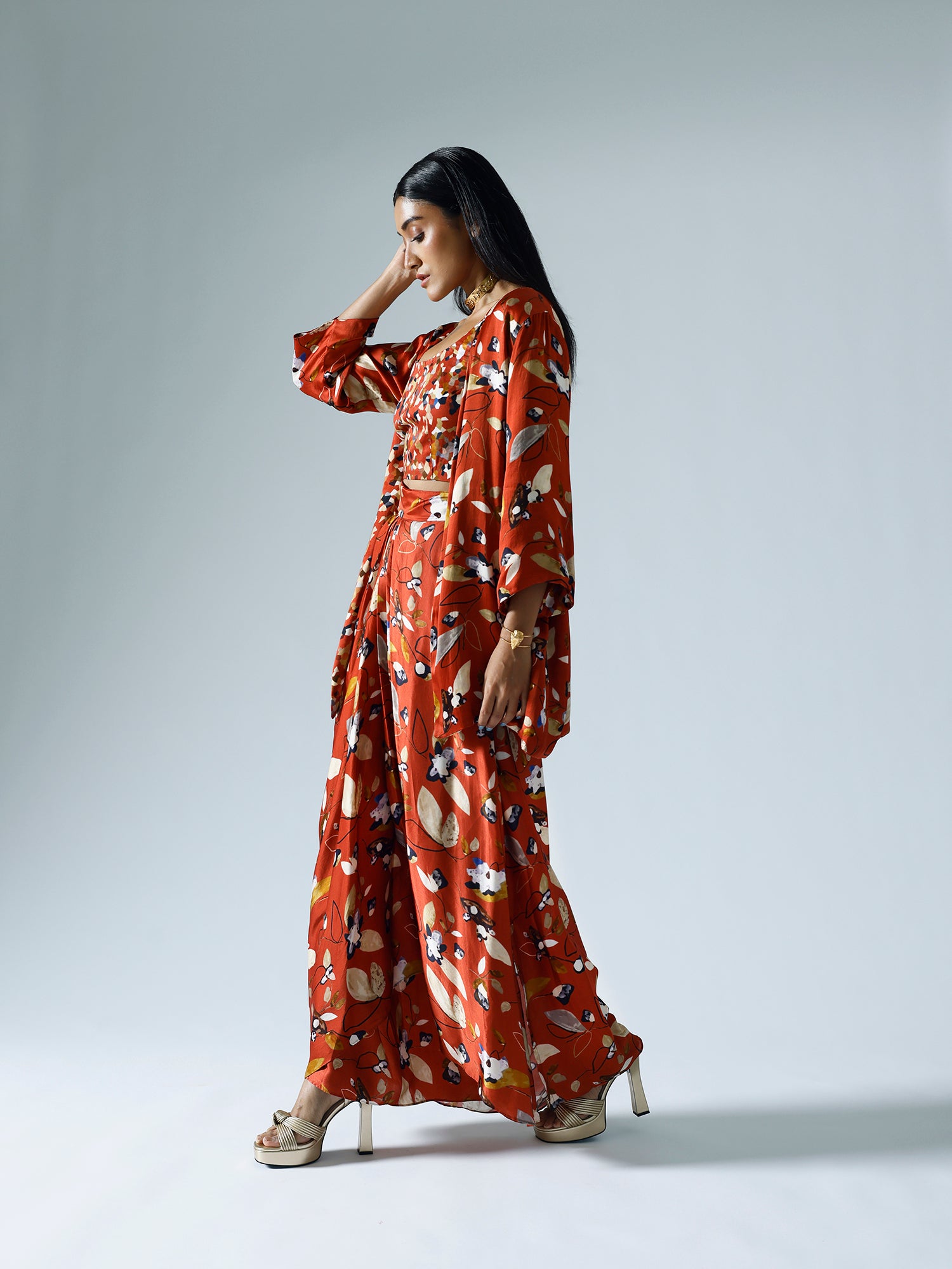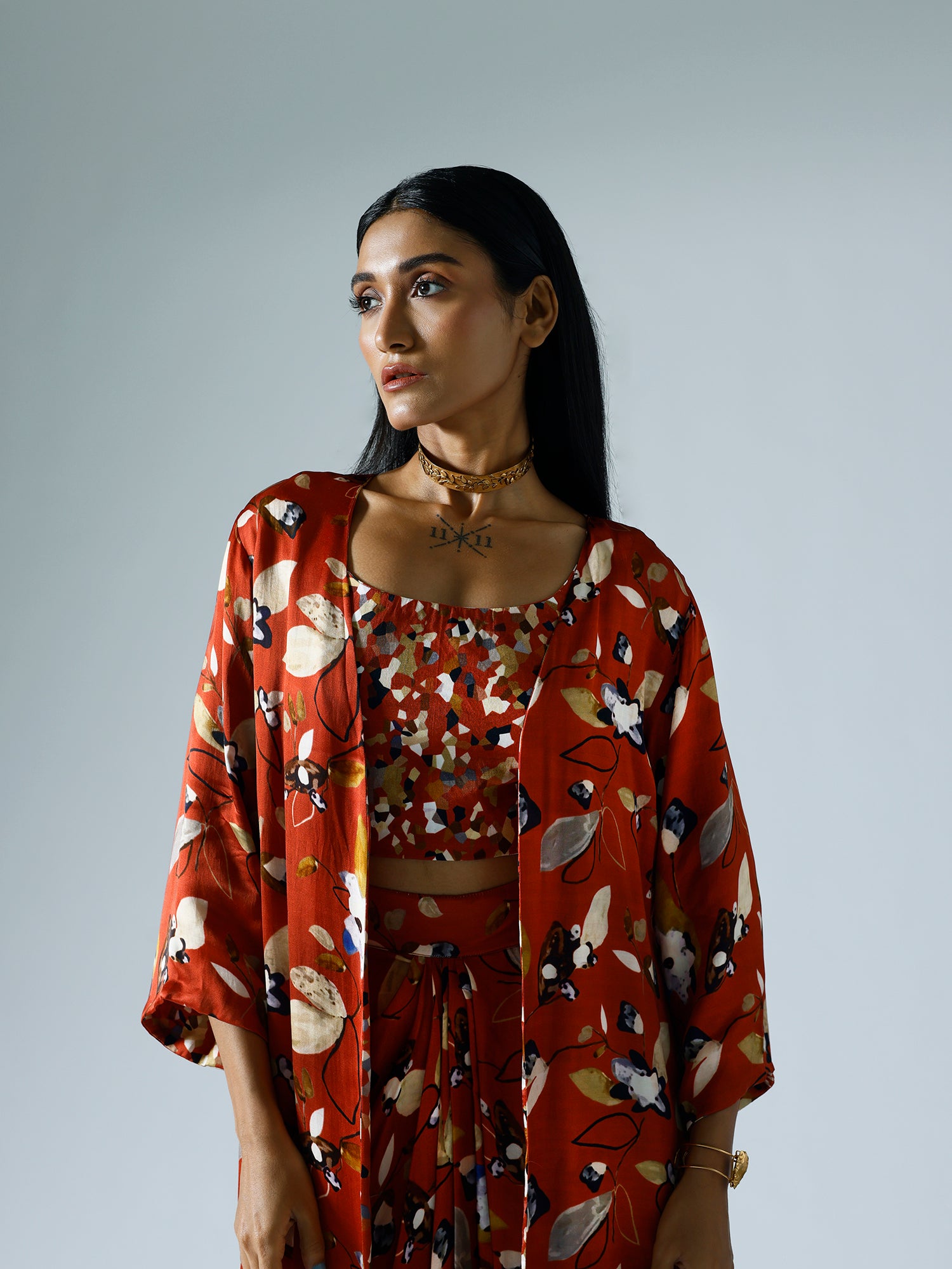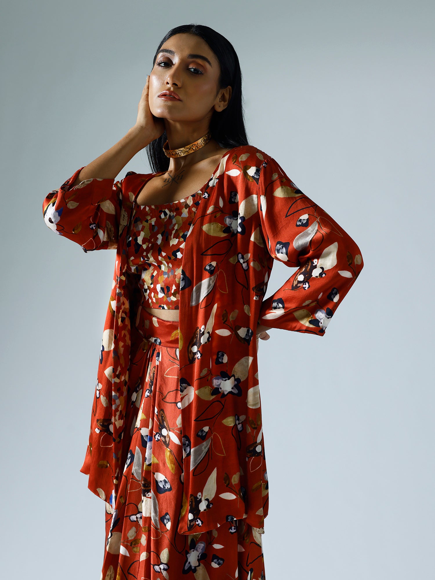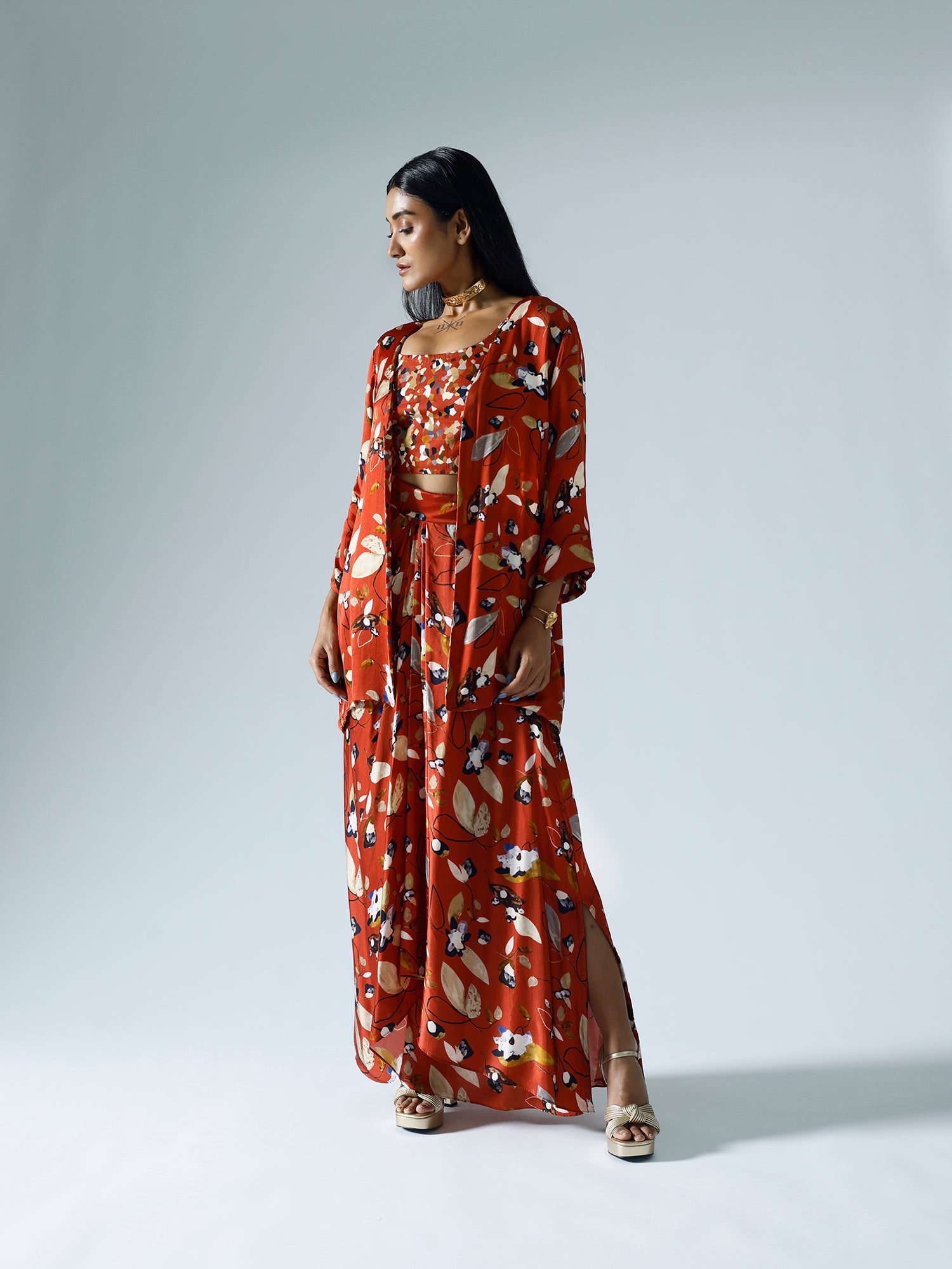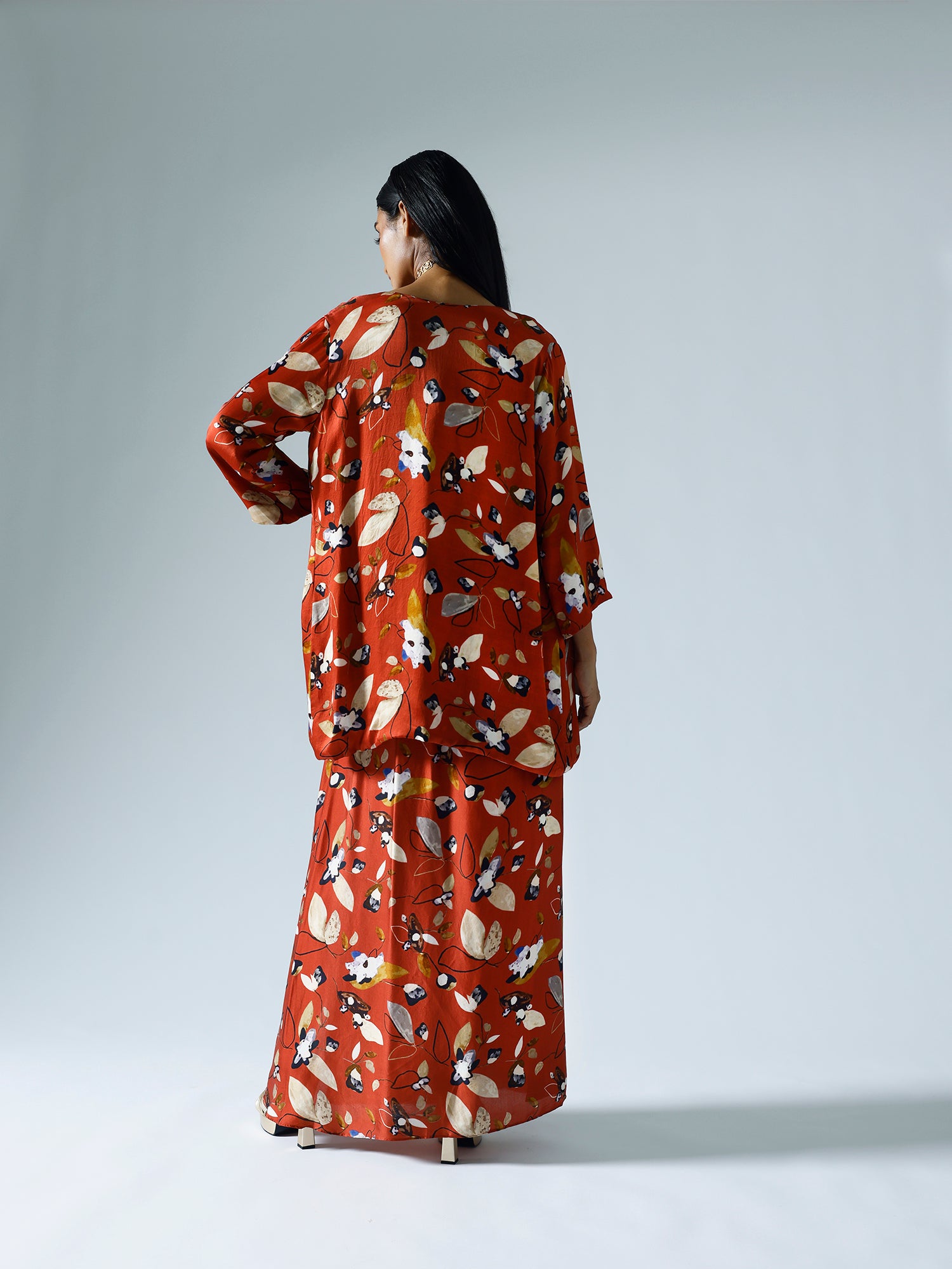 Three fourth sleeve jacket. Inner is sleeveless. Draped skirt, with side slit and back elastic. Zip fly fastening with a single hook fastening on one side. Mid rise. Regular fit.