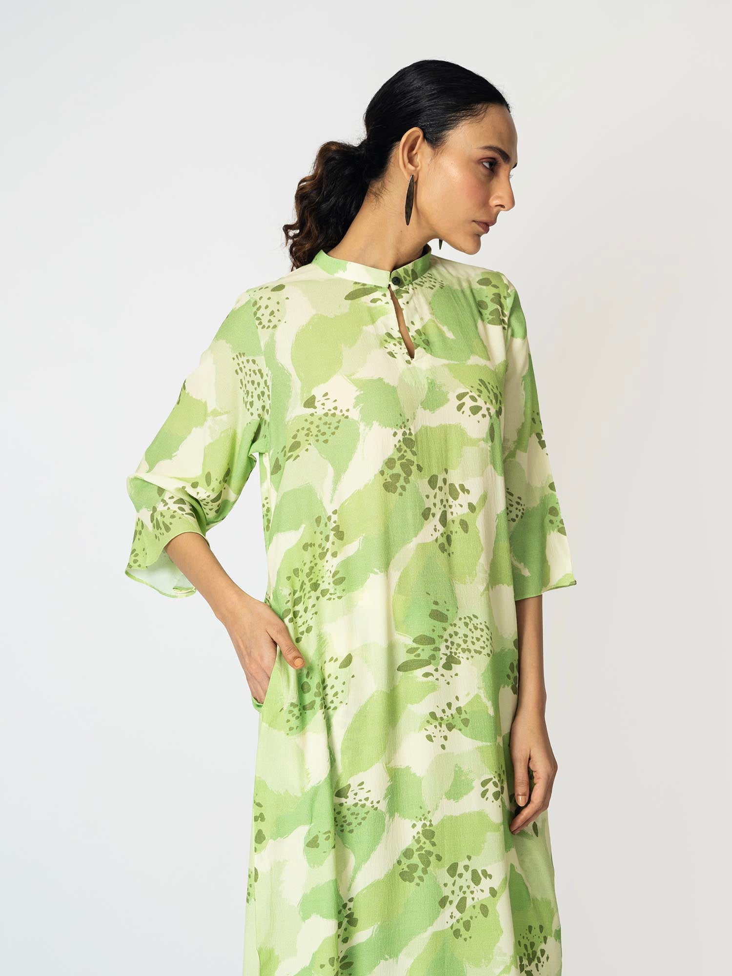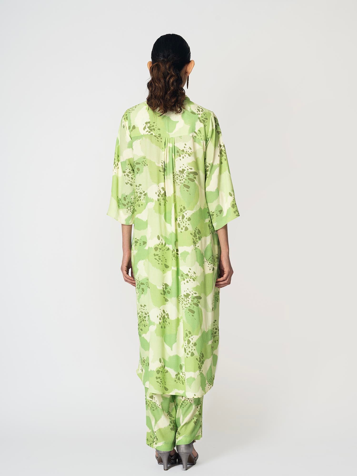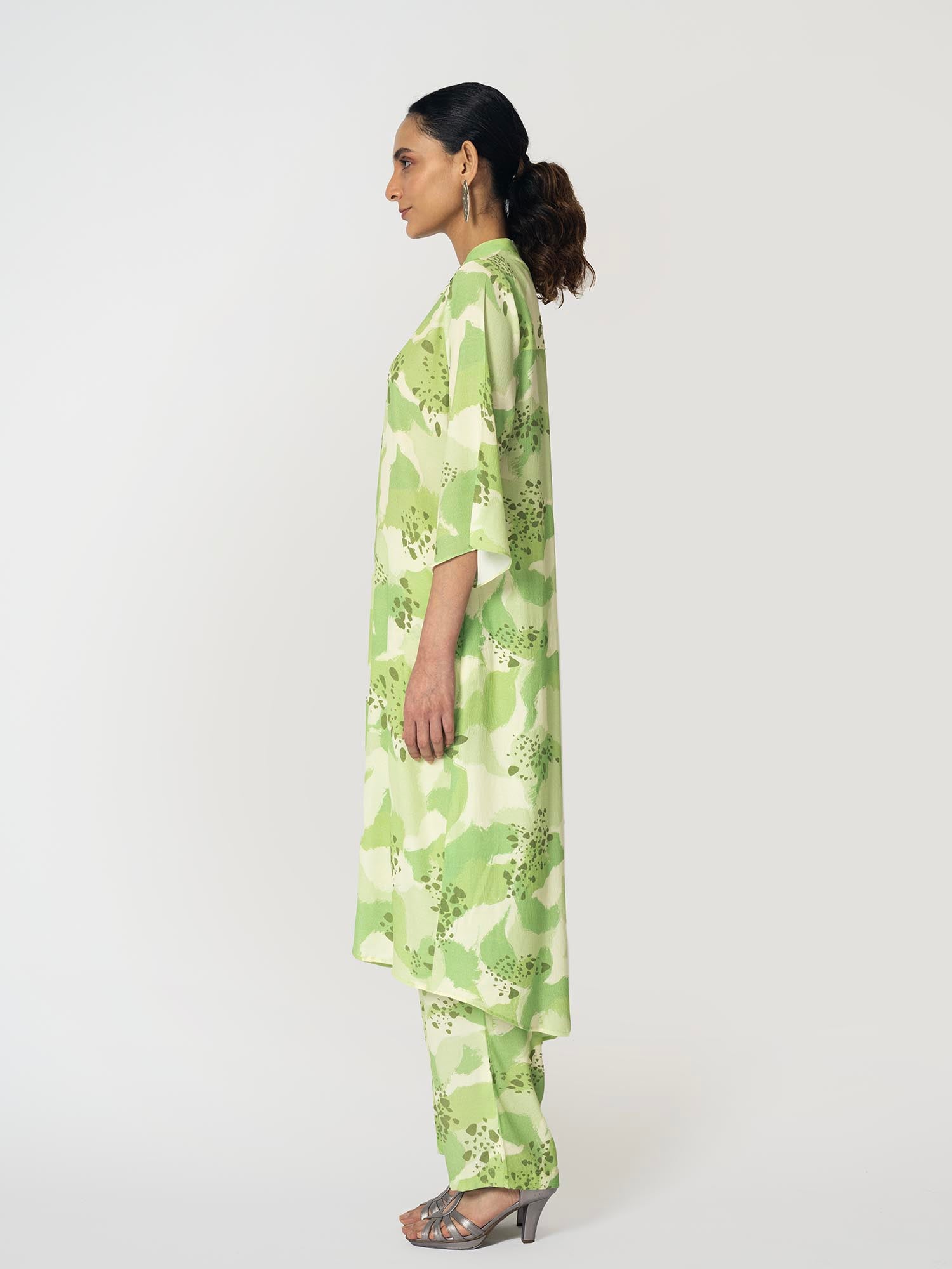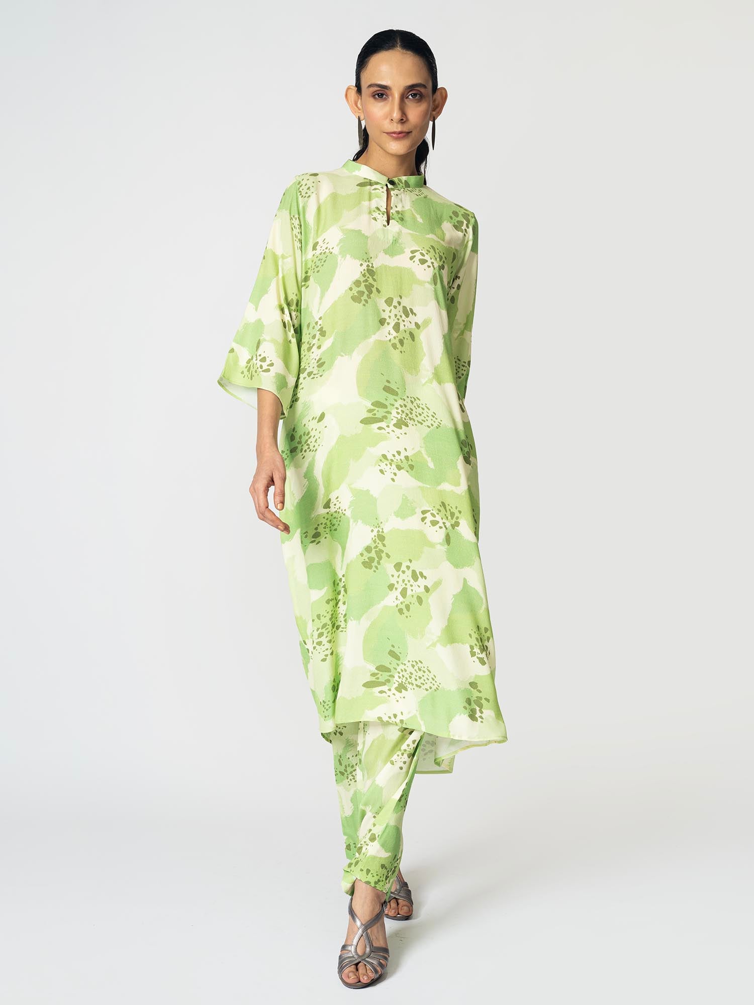 Three fourth plain sleeve. Back with thin pleats. Front open with one button. Button on the back collar to remove the scarf. Scarf is separate. Pant with pocket and back elastic. Zip fly fastening with a single hook fastening on one side. Mid rise. Regular fit.