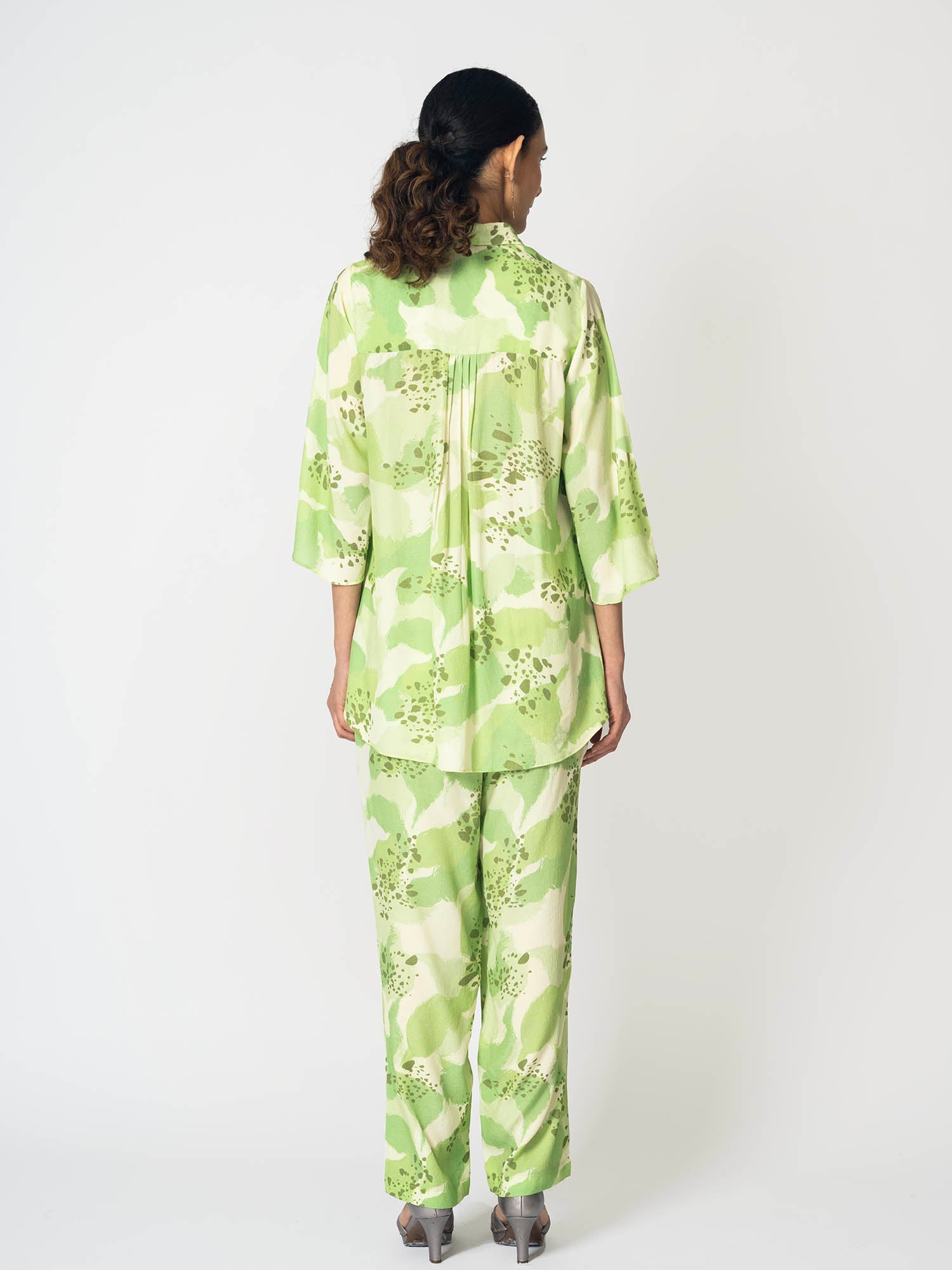 Three-fourth bell sleeve shirt with front buttons. Back with thin pleats. Regular fit.