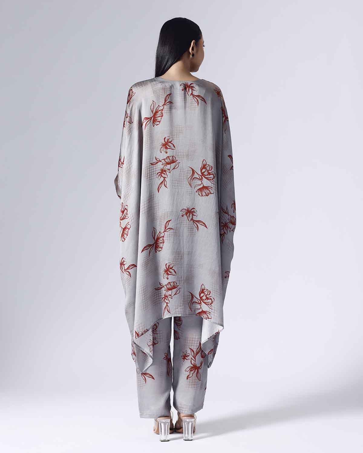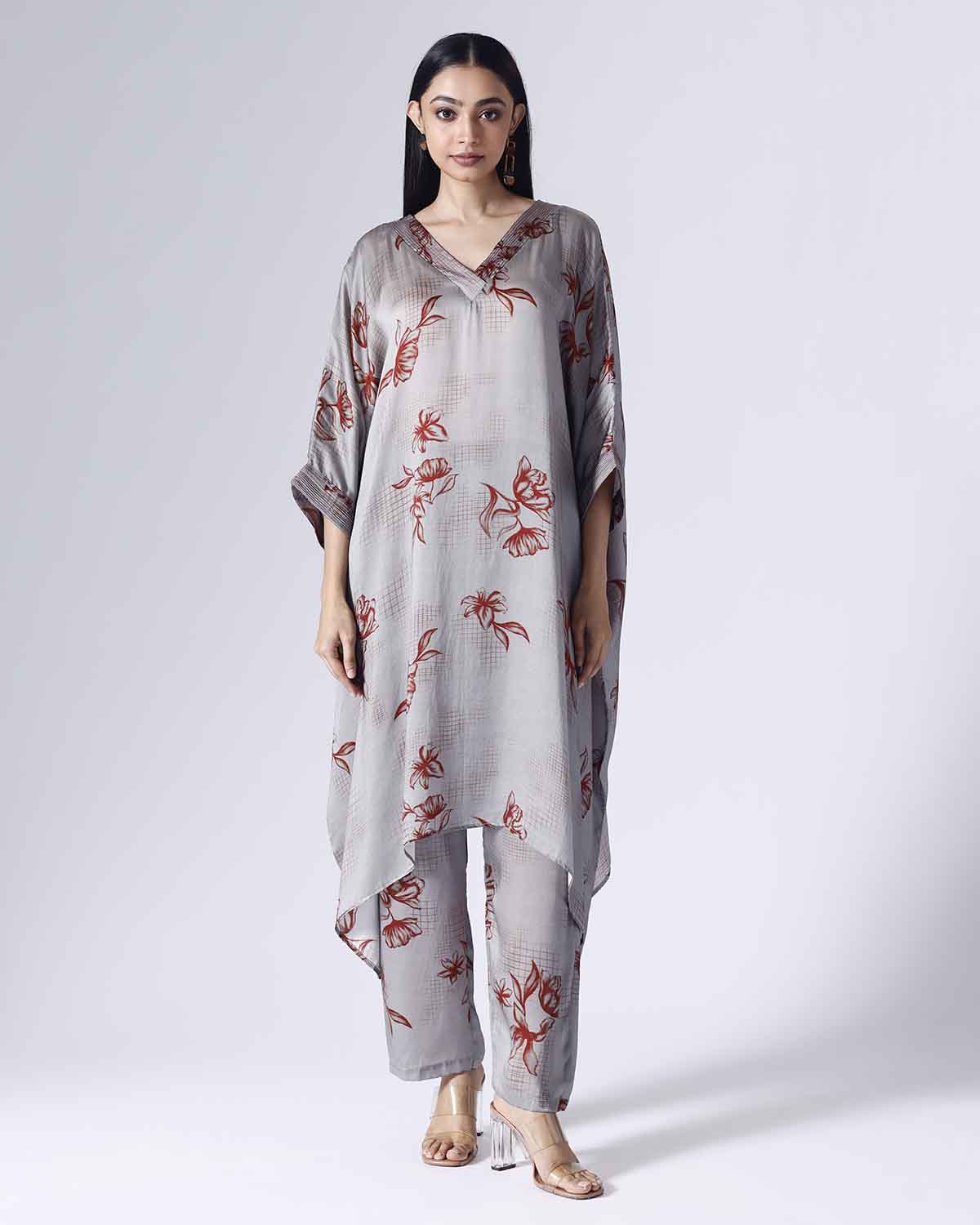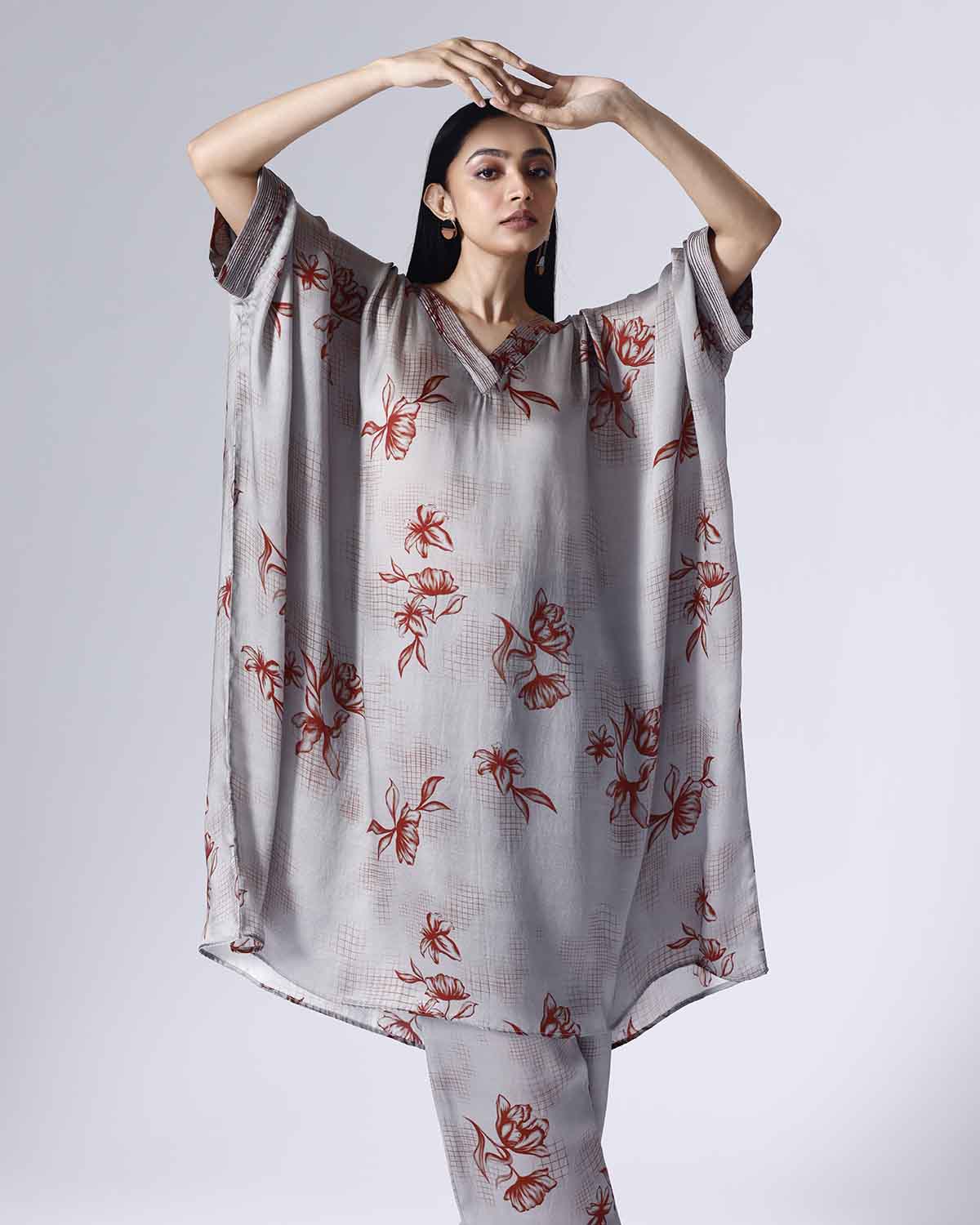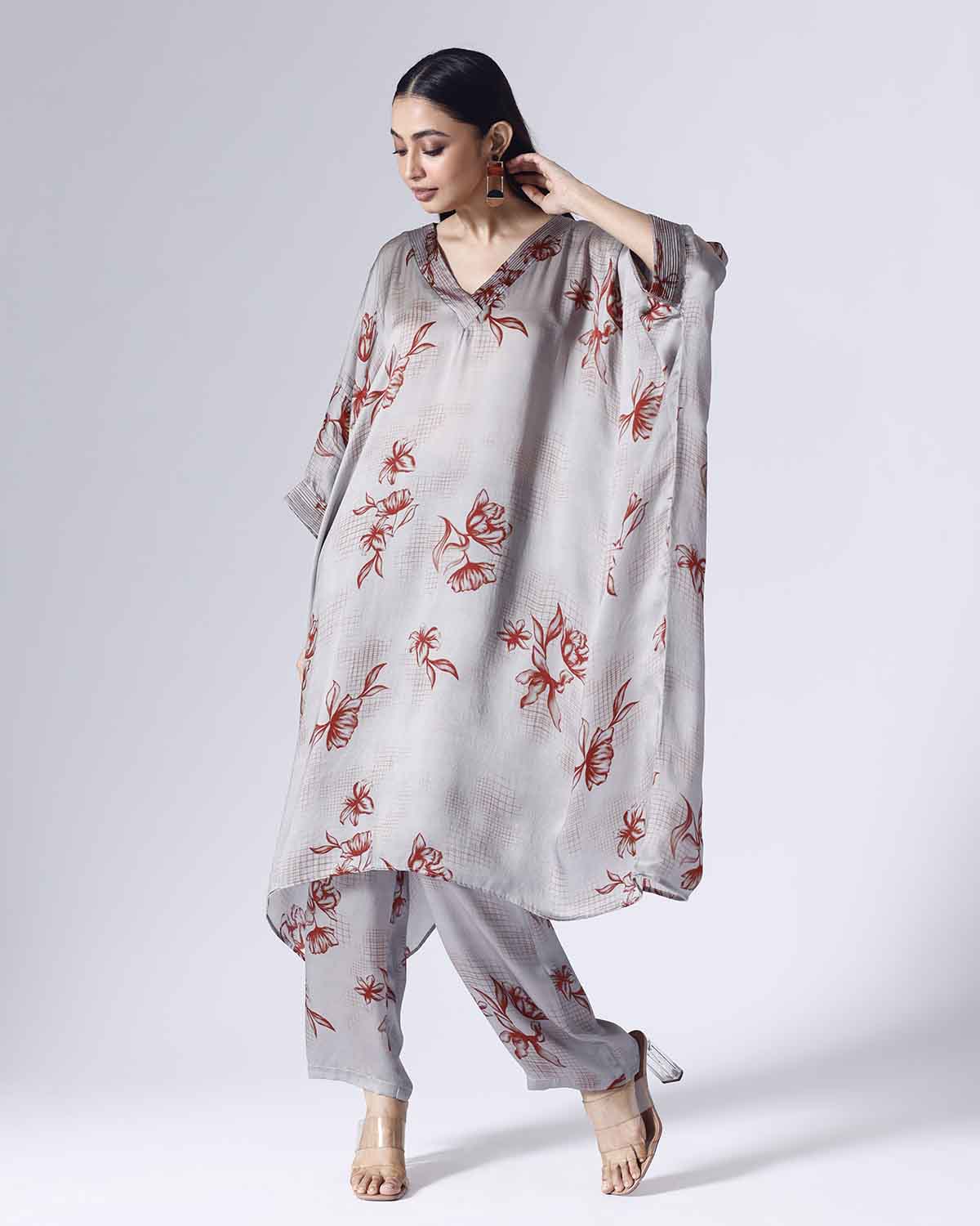 Printed co-ordinated set. Sold as a set of 2. Kaftaan style free slowing top with detailing around neck and sleeves. Pants with pocket and back elastic. Zip fly fastening with a single hook opening on one side.