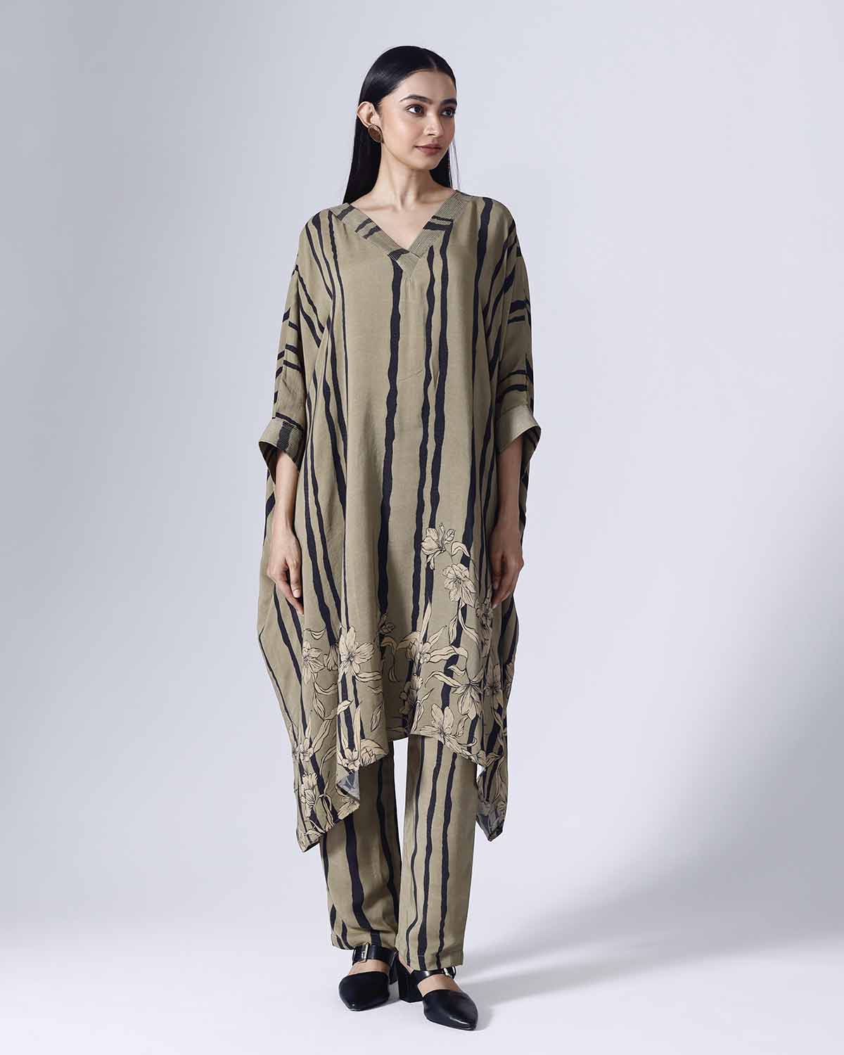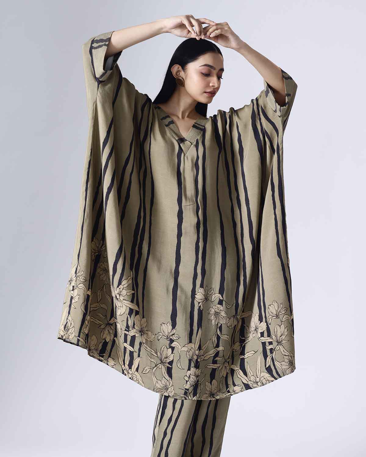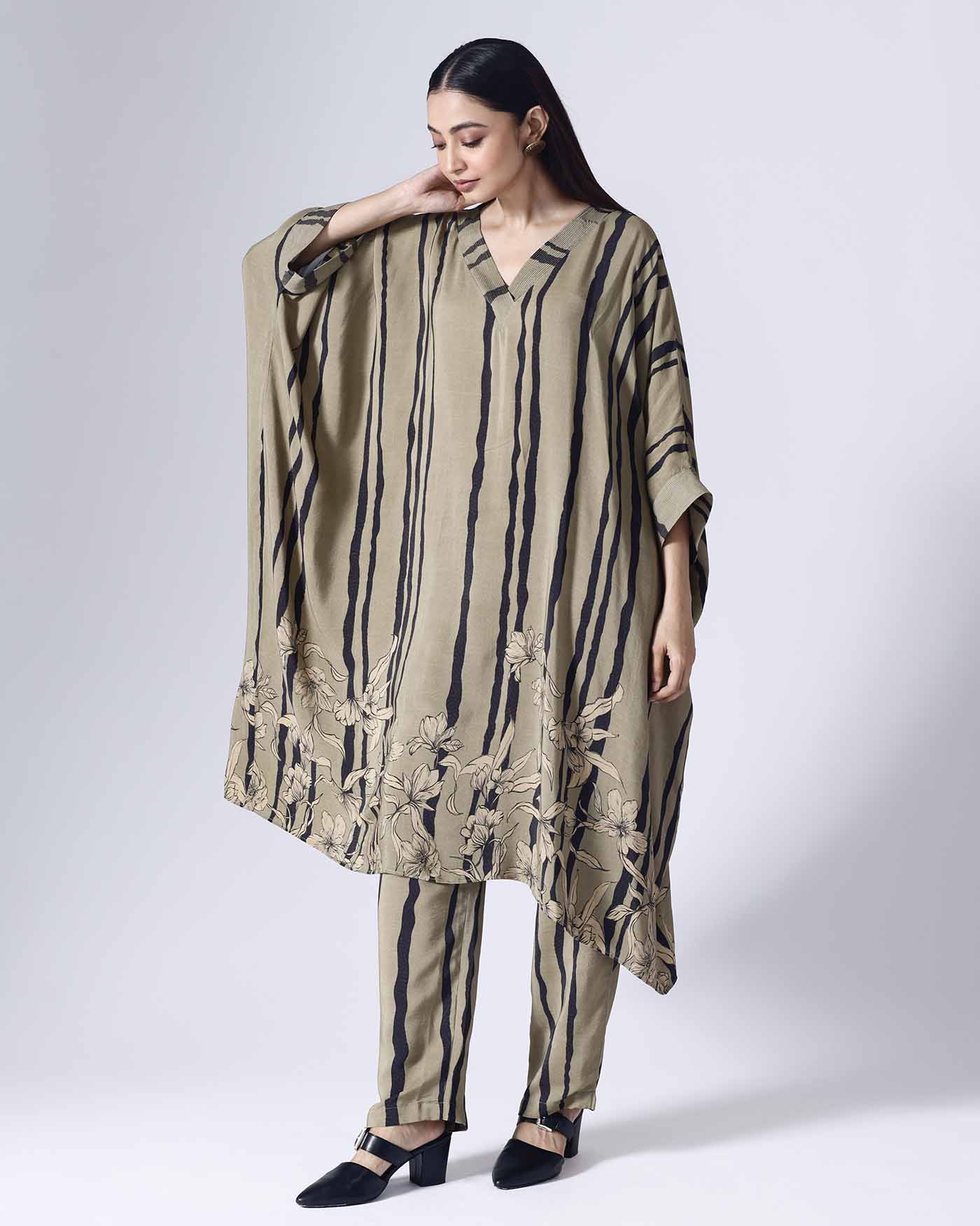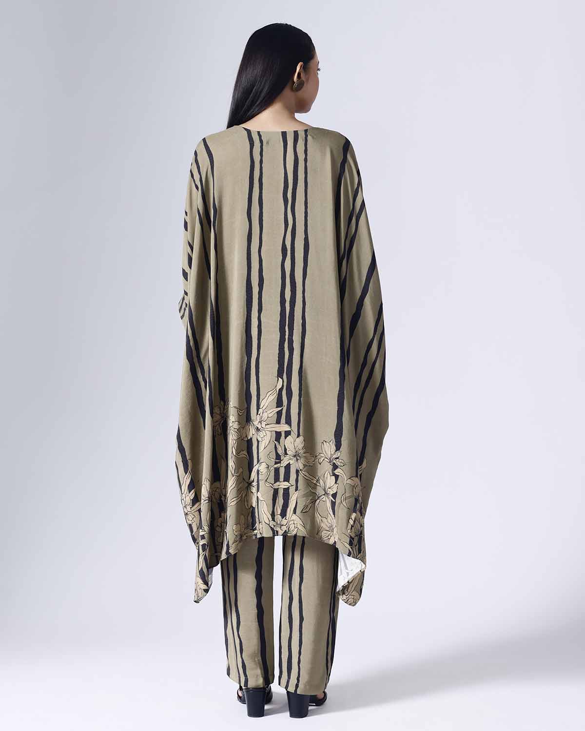 Printed co-ordinated set. Sold as a set of 2. Kaftaan style free slowing top with detailing around neck and sleeves. Pants with pocket and back elastic. Zip fly fastening with a single hook opening on one side.