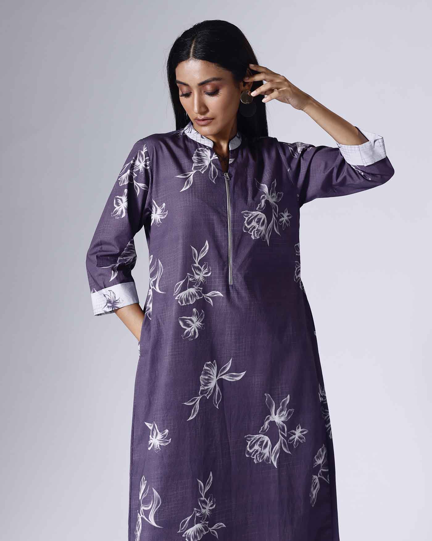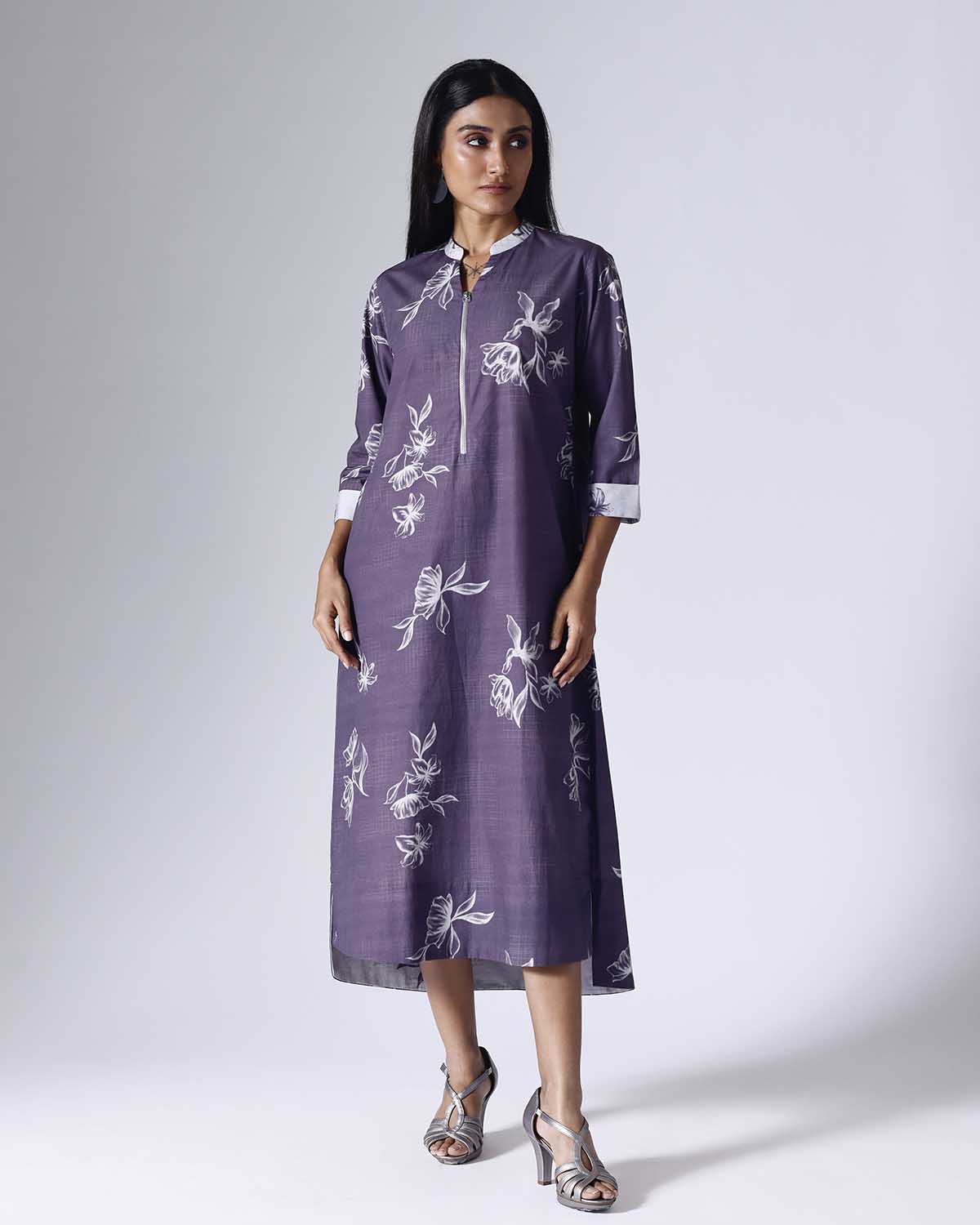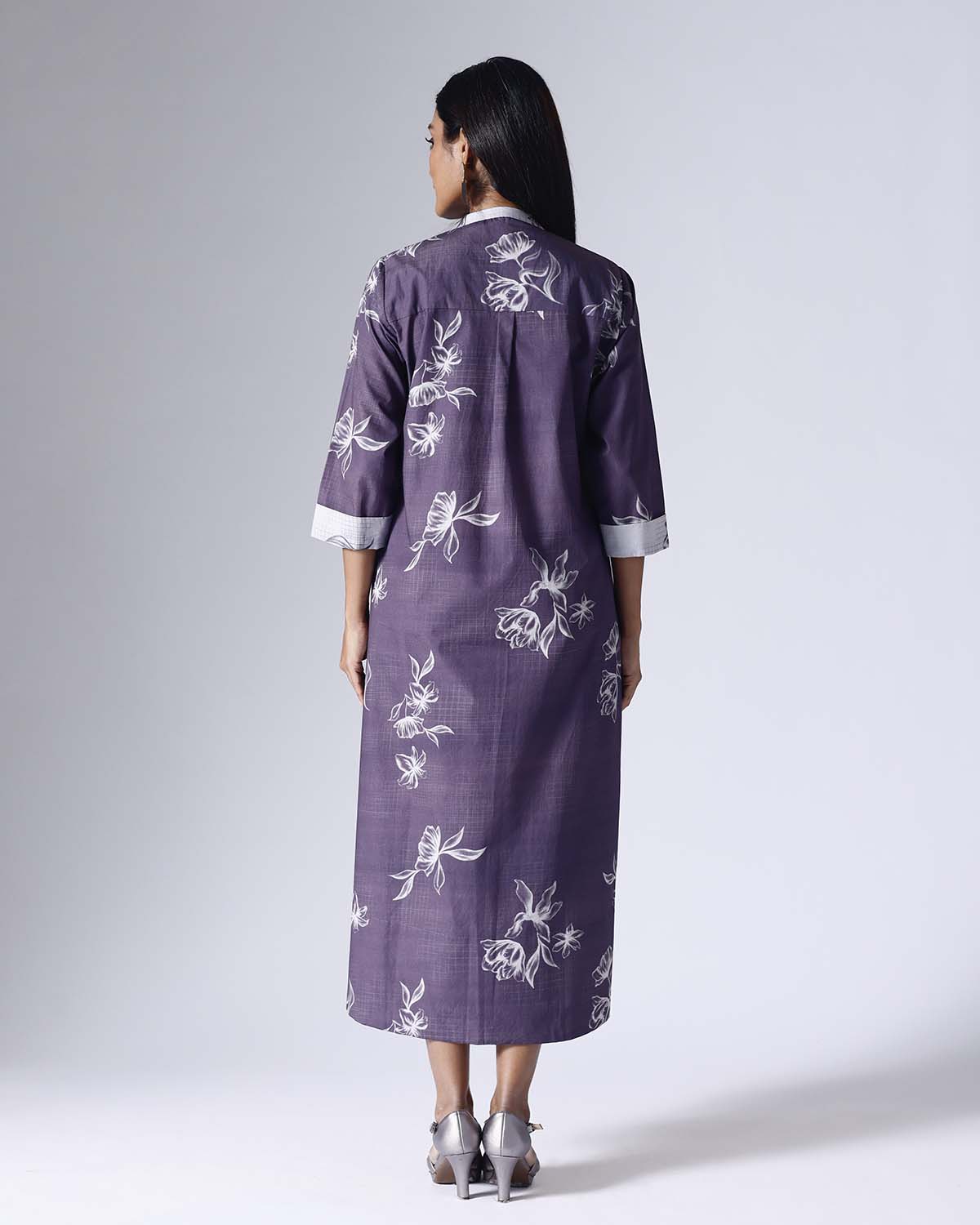 Printed long dress with pockets. Sold as one piece. Mandarin collar with V cut and metal zipper till torso. Back with box pleat. Regular fit.