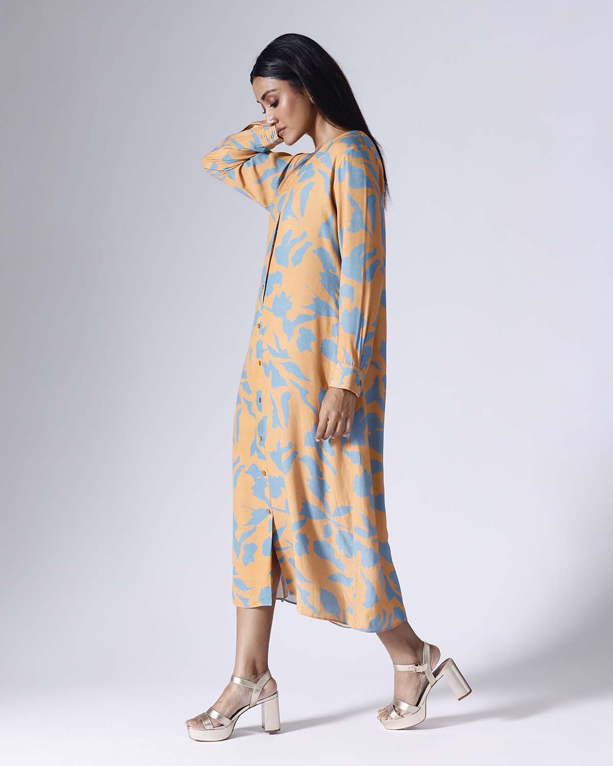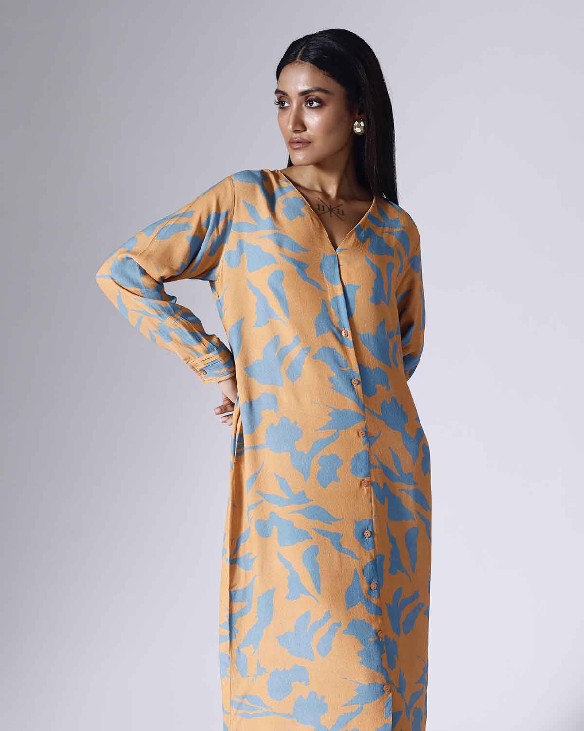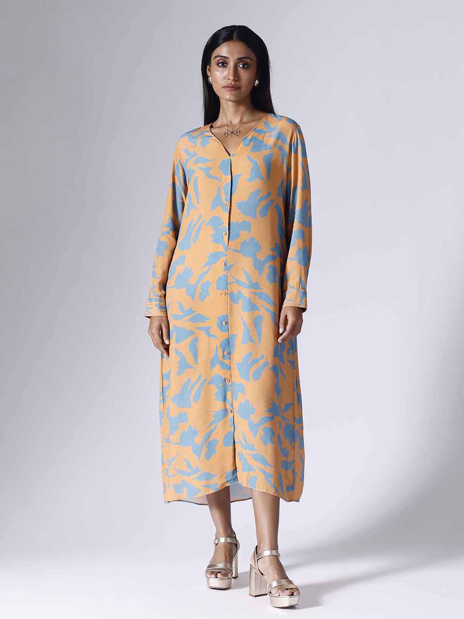 Printed long dress with belt and pockets. Sold as one piece. Full pleated cuff sleeves. Back with thin pleats. Front open with buttons. Plain V neckline. Belt is separate. Regular fit.