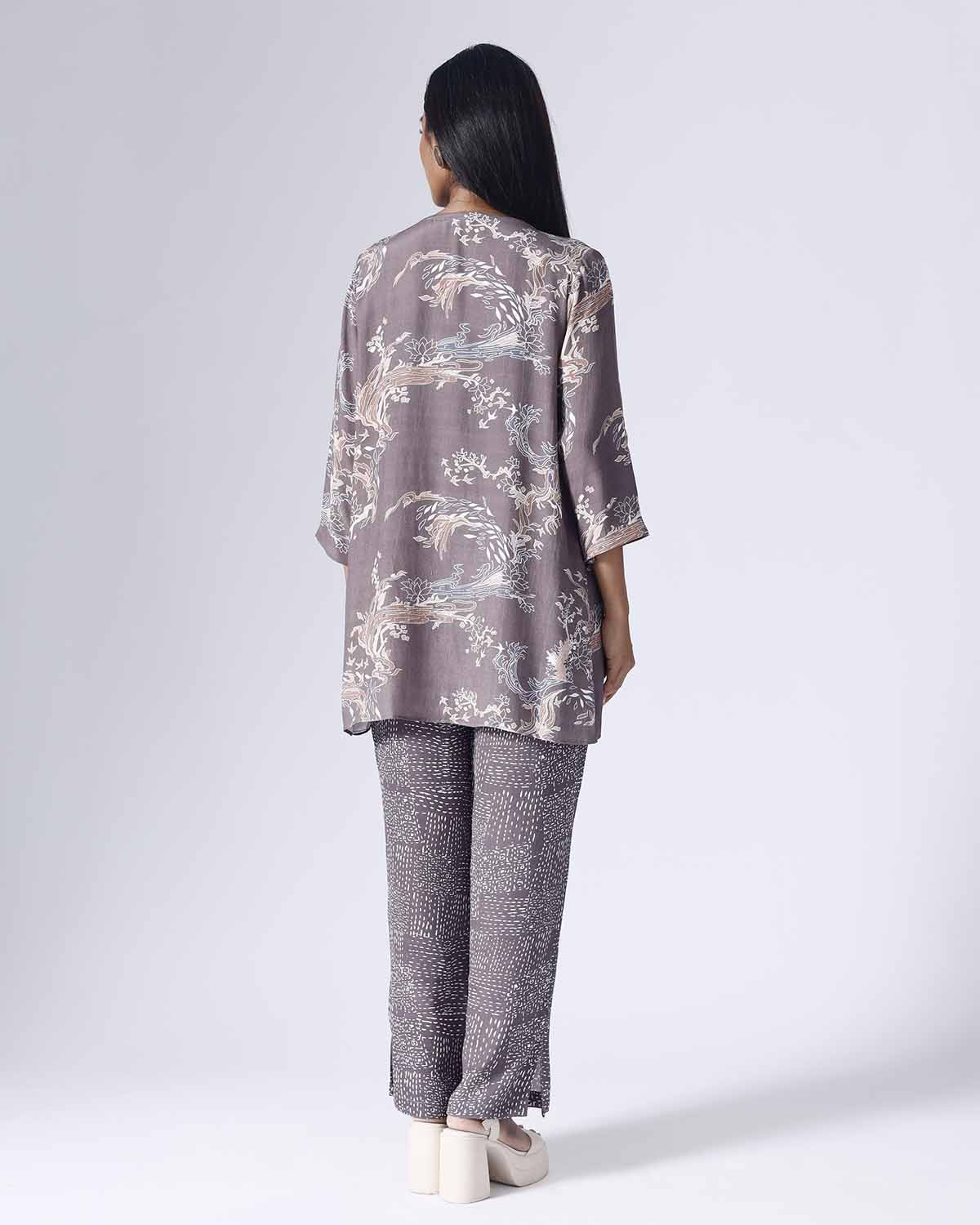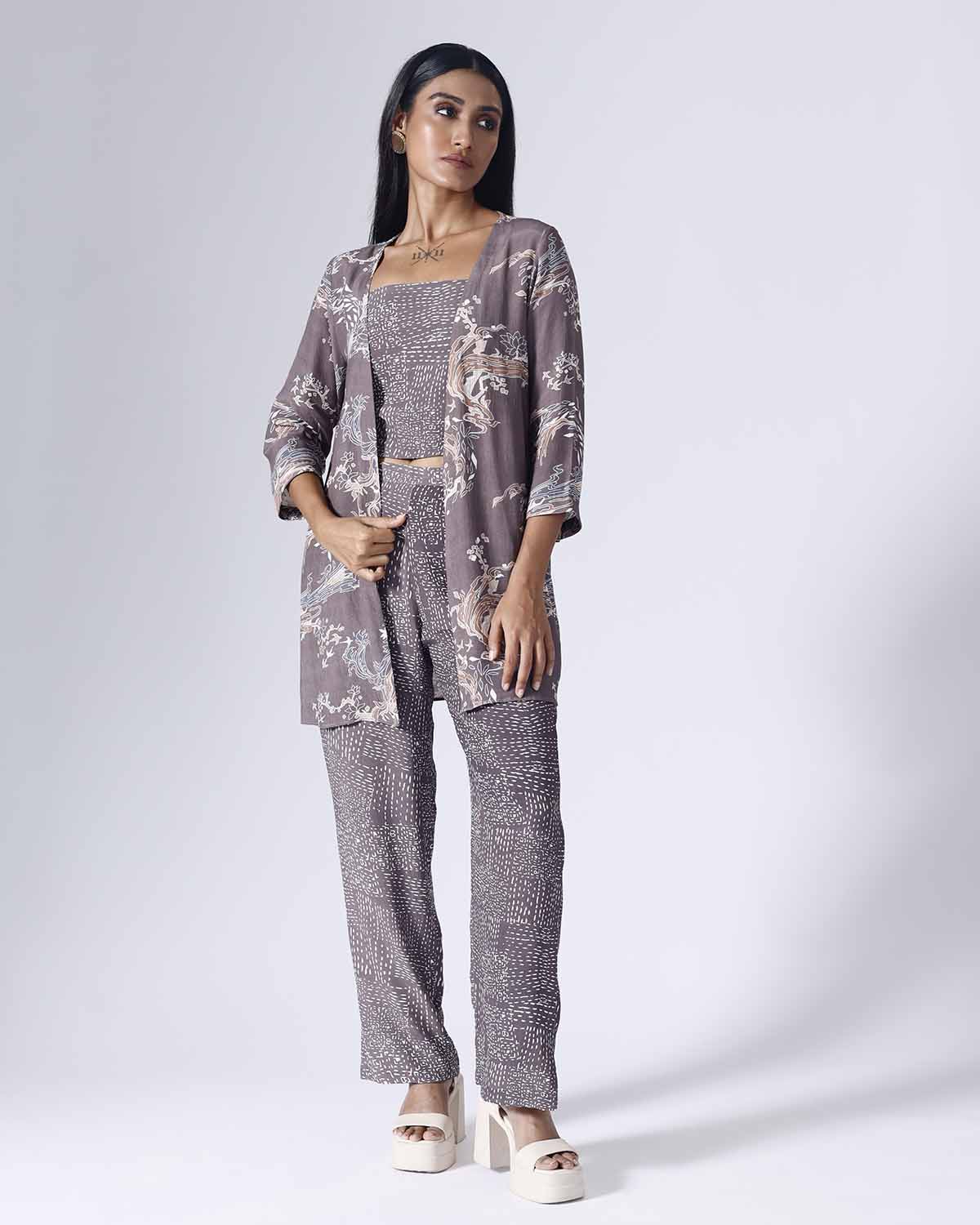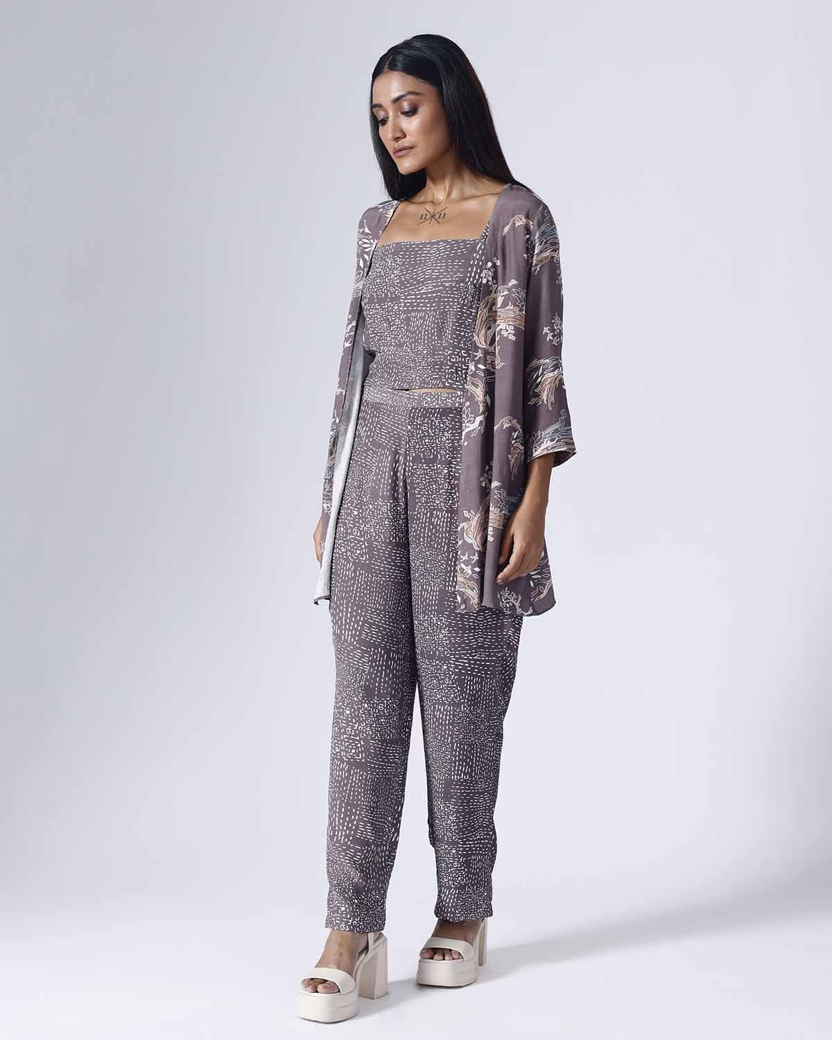 Printed co-ordinated set. Sold as a set of 3. Three fourth sleeve jacket. Inner is sleeveless with adjustable straps. Pants with pocket and back elastic. Zip fly fastening with a single hook opening on one side. Mid rise. Printed belt provided with the set.