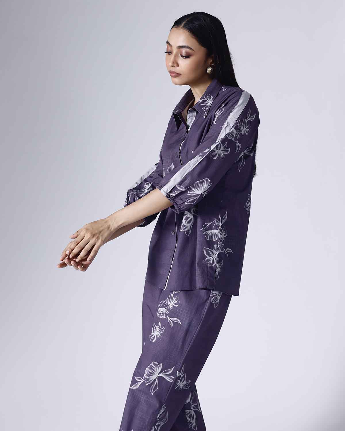 Printed shirt with maroon detailing. Sold as one piece. Mandarin collar with V cut. Three fourth pleated sleeve shirt, with front opening. Back with box pleat. Regular fit.