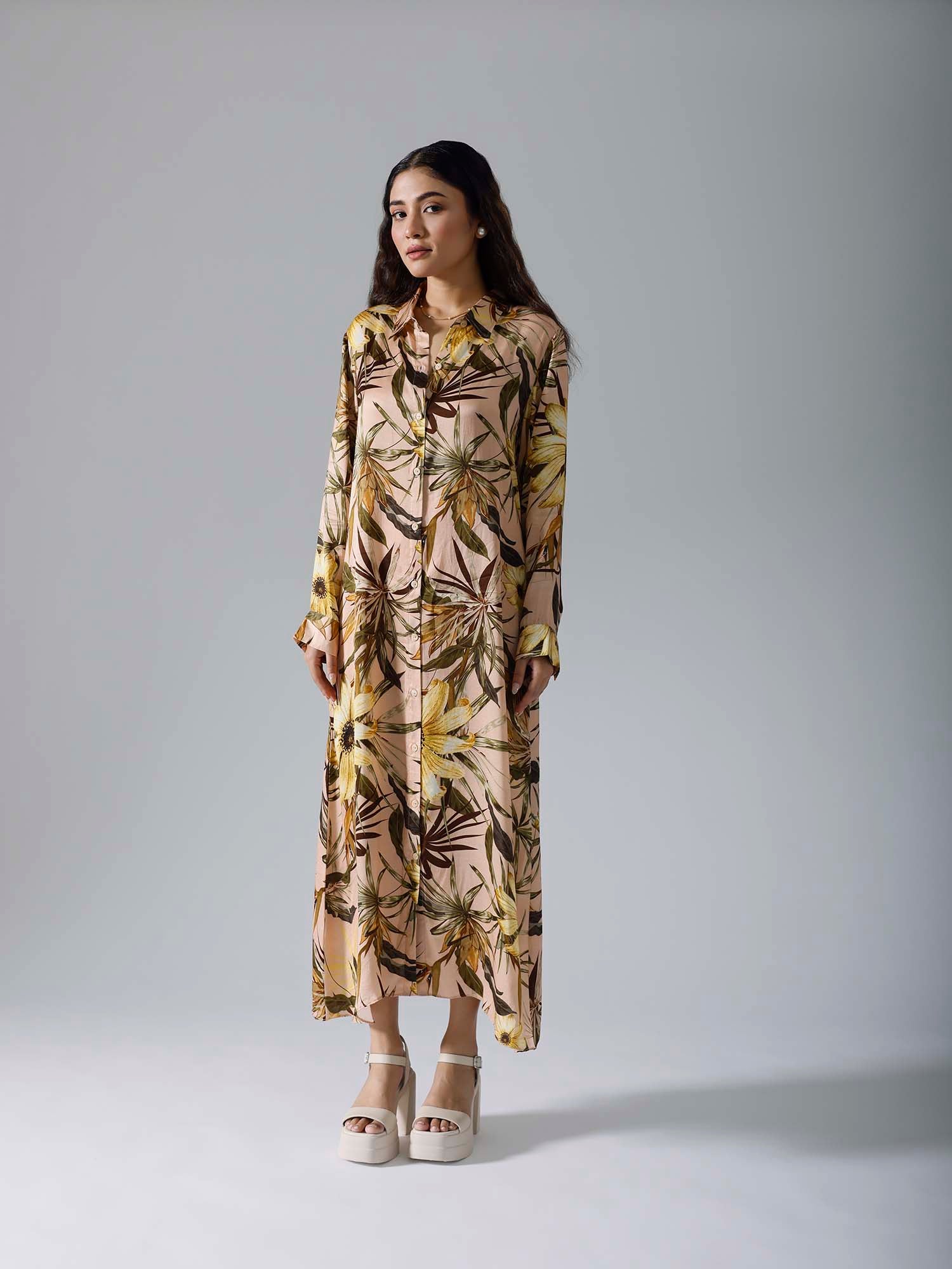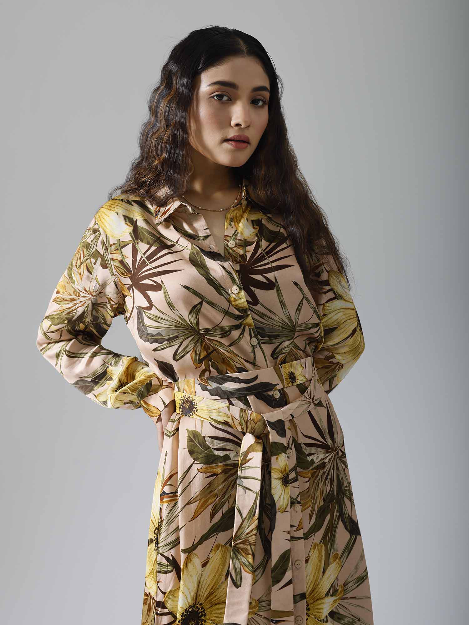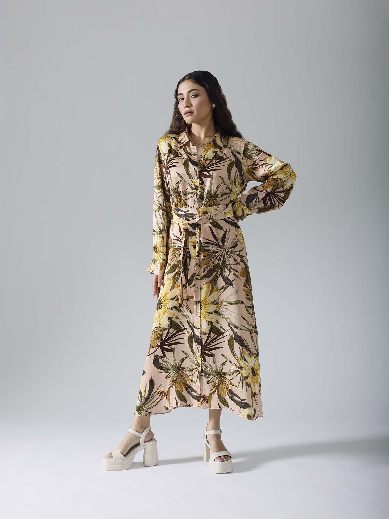 Printed long dress with belt and pockets. Sold as one set. Full sleeves. Front open with buttons. Belt is separate. Regular fit.