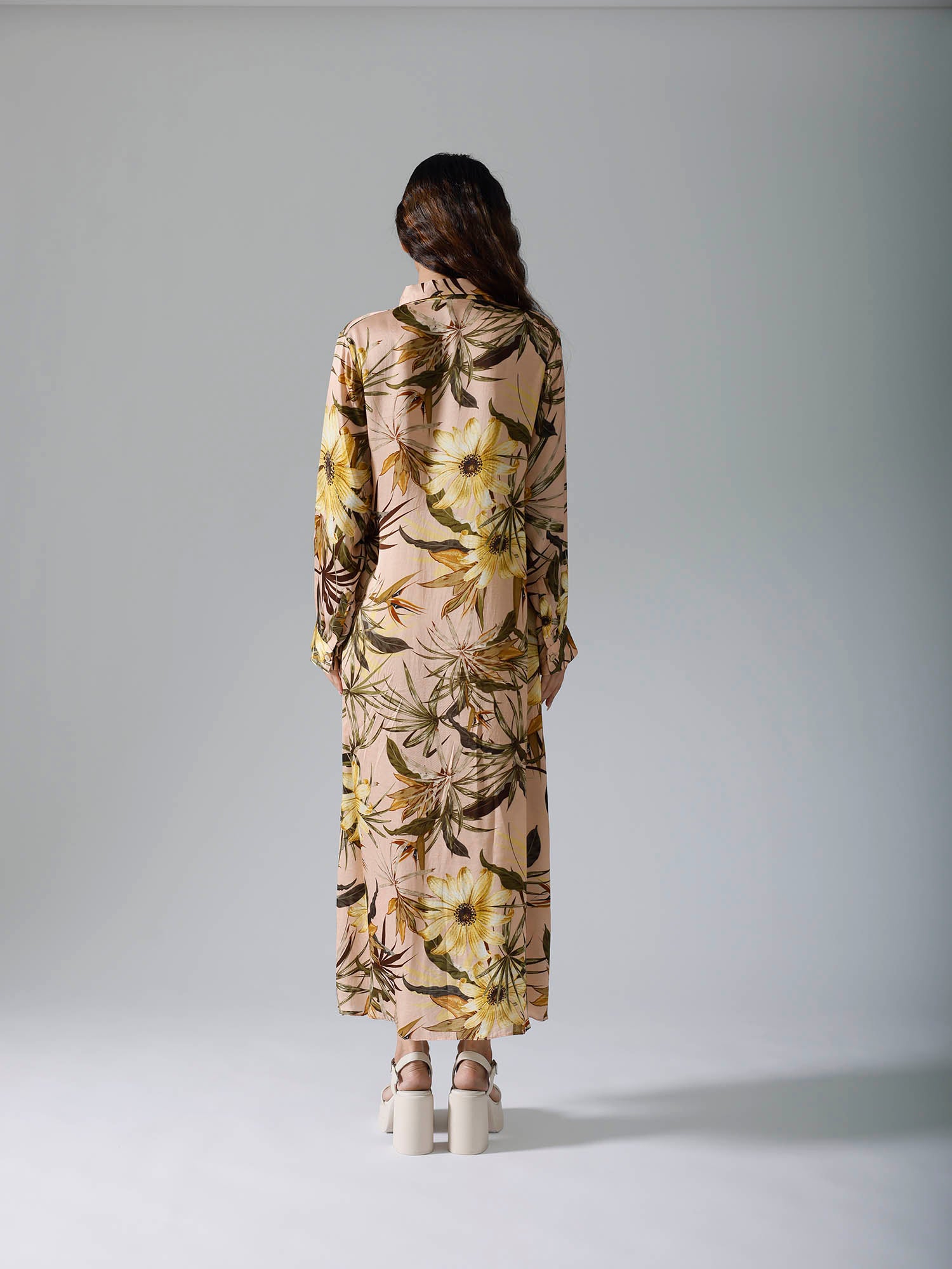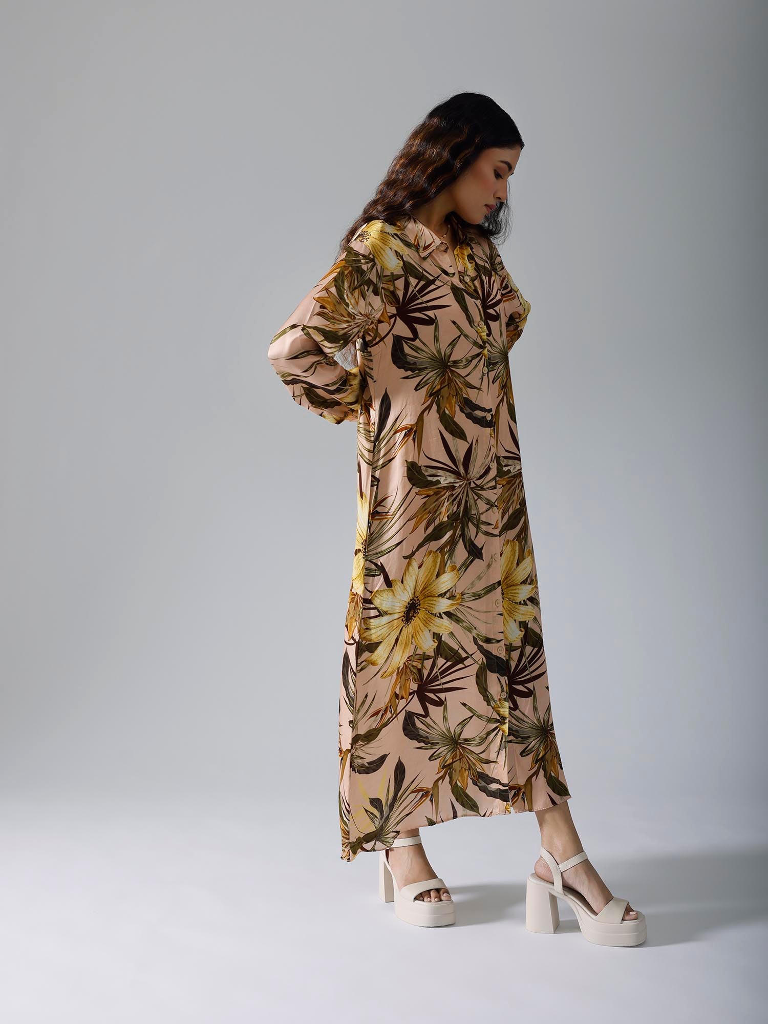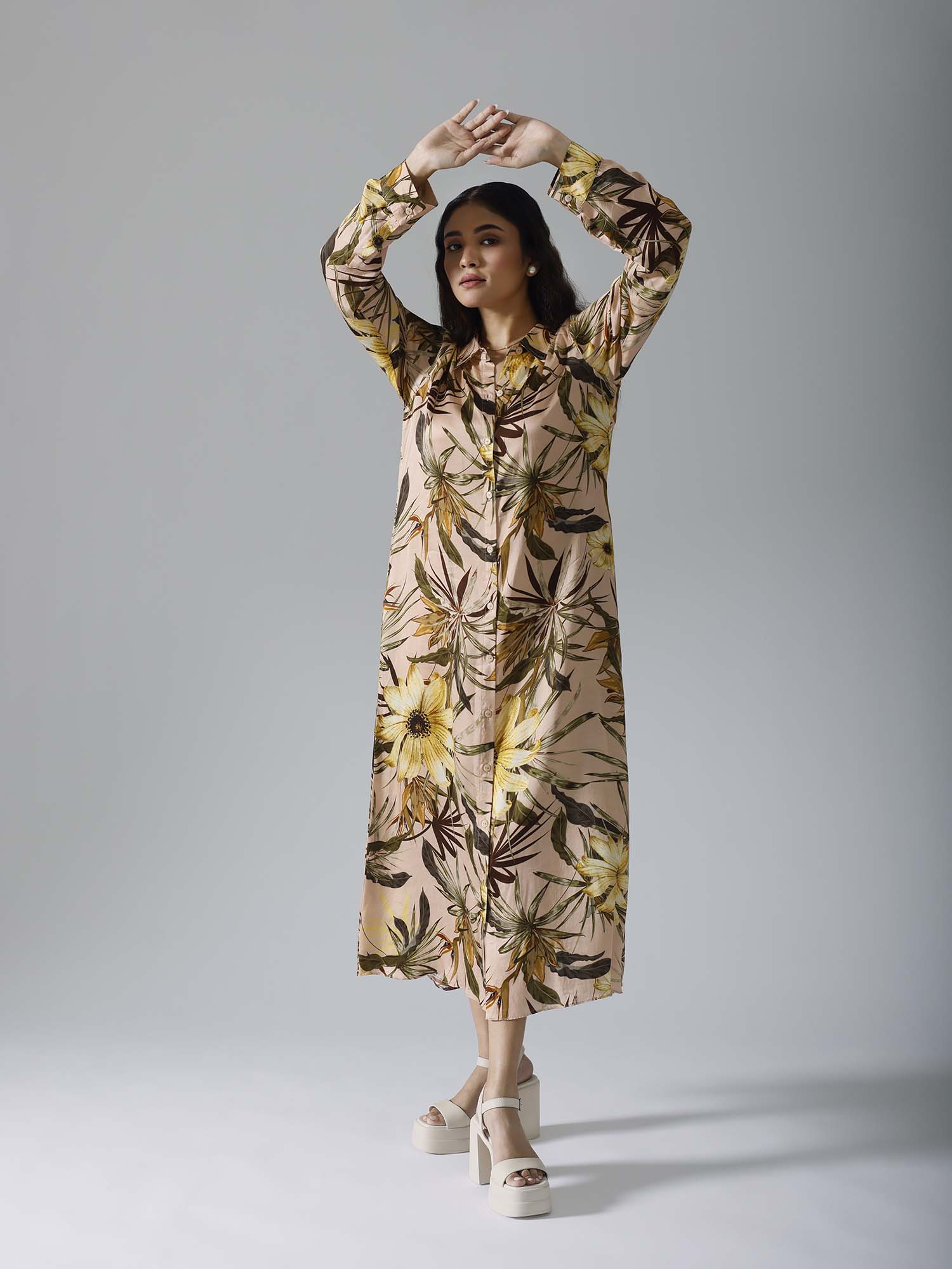 Printed long dress with belt and pockets. Sold as one set. Full sleeves. Front open with buttons. Belt is separate. Regular fit.