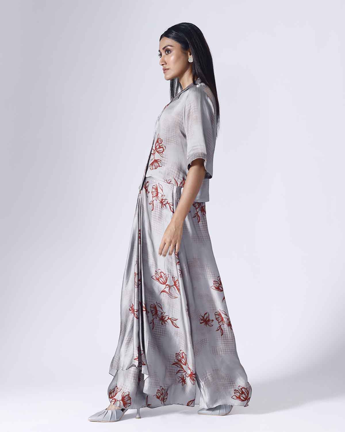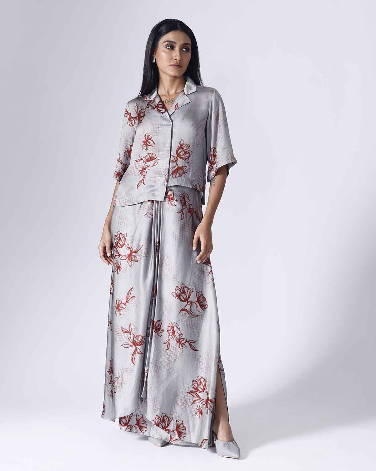 Printed co-ordinated set. Sold as a set of 2. Assymetrical front open top. Draped skirt, with side slit and back elastic. Zip fly fastening with a single hook opening on one side. Mid rise. Regular fit.
