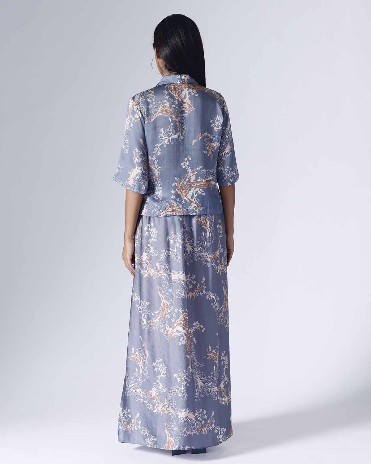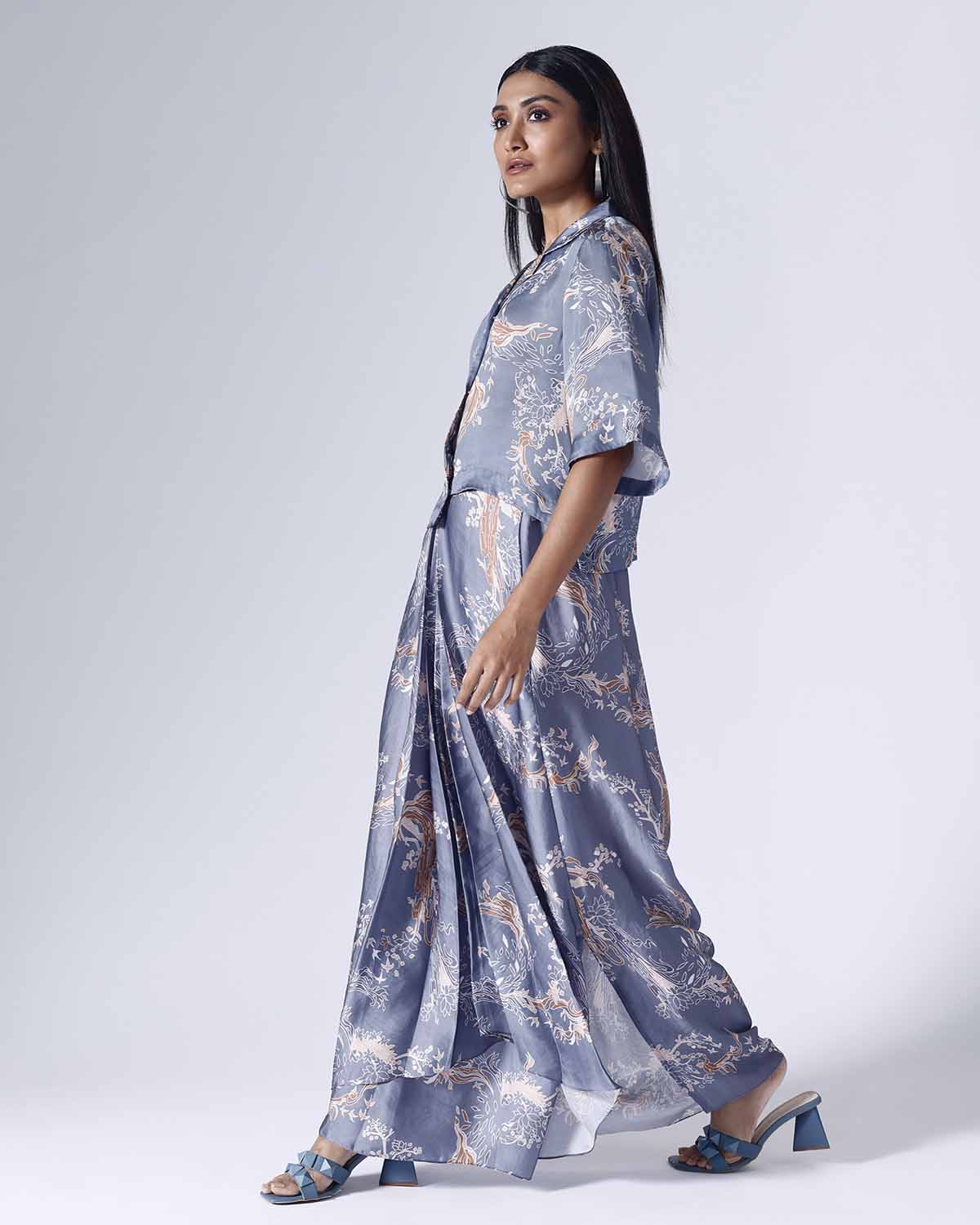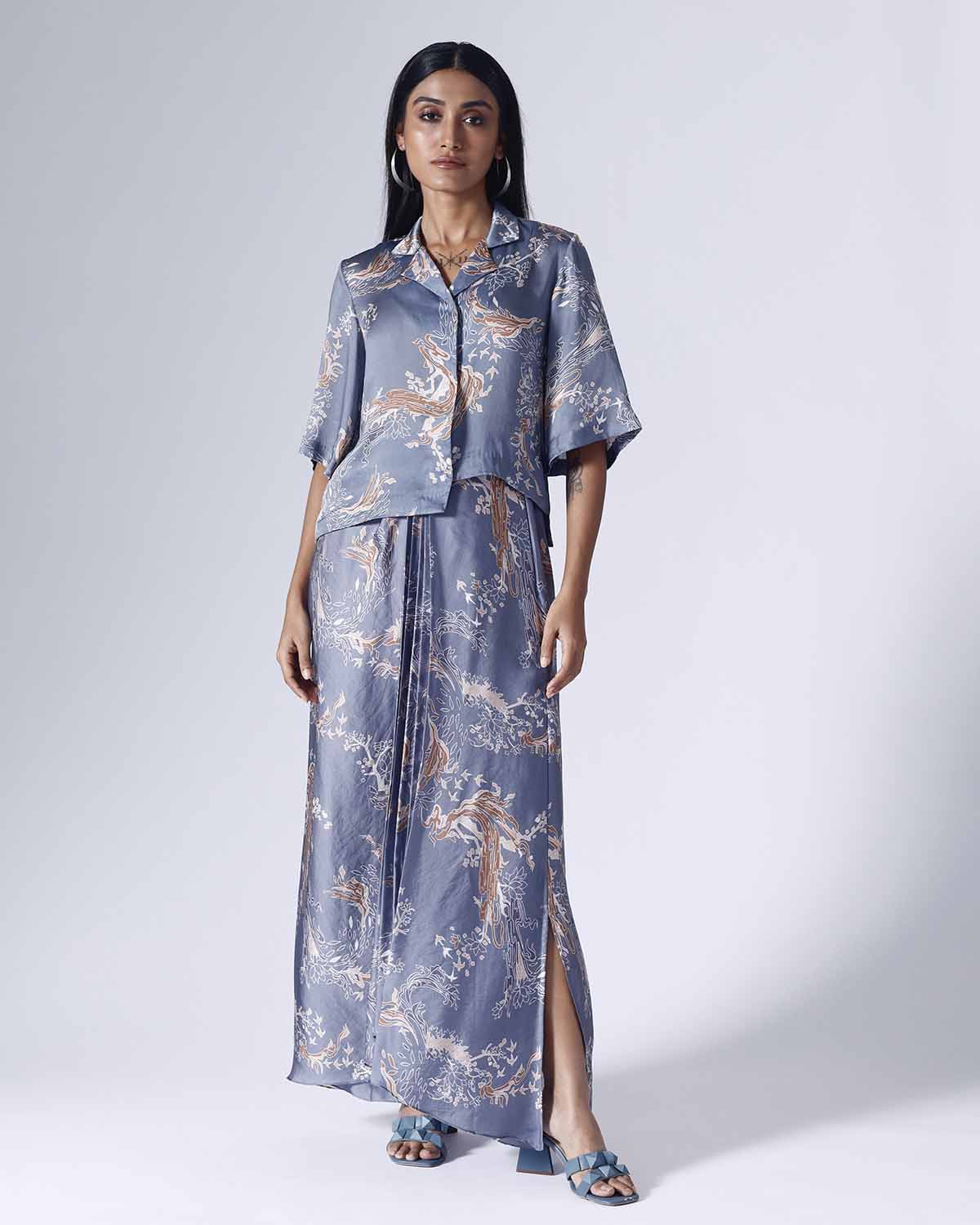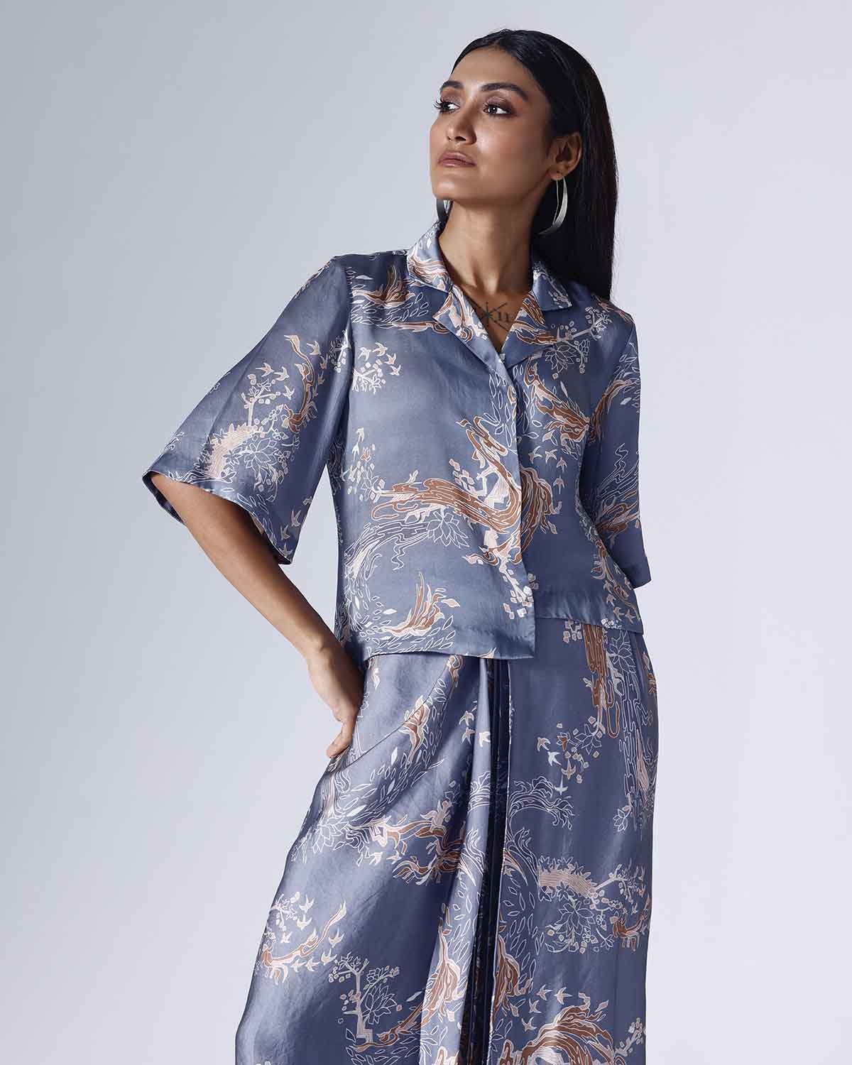 Printed co-ordinated set. Sold as a set of 2. Assymetrical front open top. Draped skirt, with side slit and back elastic. Zip fly fastening with a single hook opening on one side. Mid rise. Regular fit.