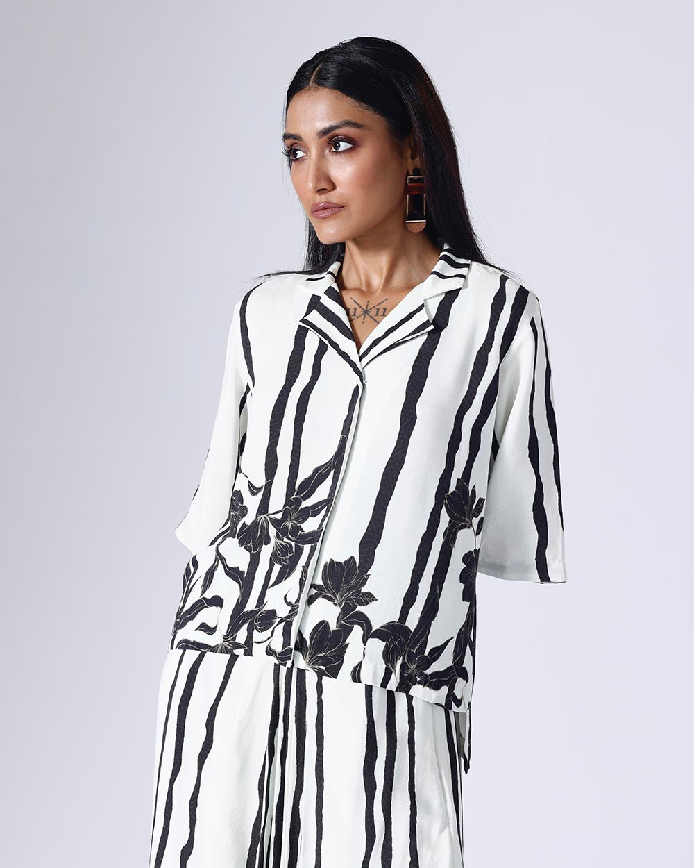 Printed co-ordinated set. Sold as a set of 2. Top with blazer coller, front concealed opening. Draped skirt, with side slit and back elastic. Zip fly fastening with a single hook opening on one side. Mid rise. Regular fit.
