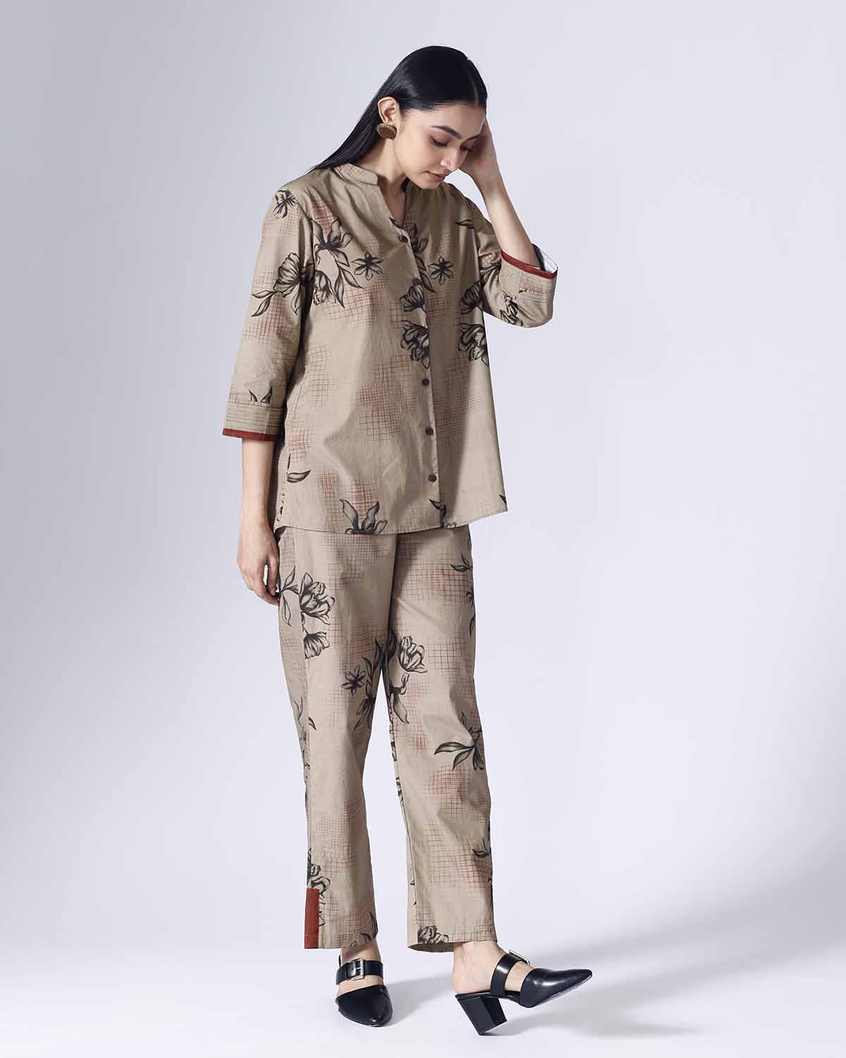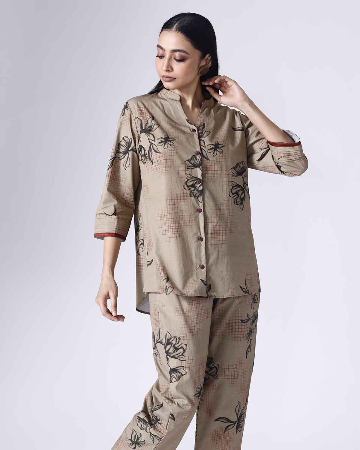 Printed shirt with maroon detailing. Sold as one piece. Mandarin collar with V cut. Three fourth pleated sleeve shirt, with front opening. Back with box pleat. Regular fit.
