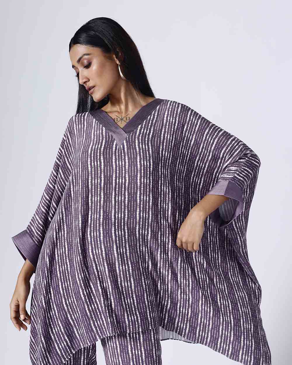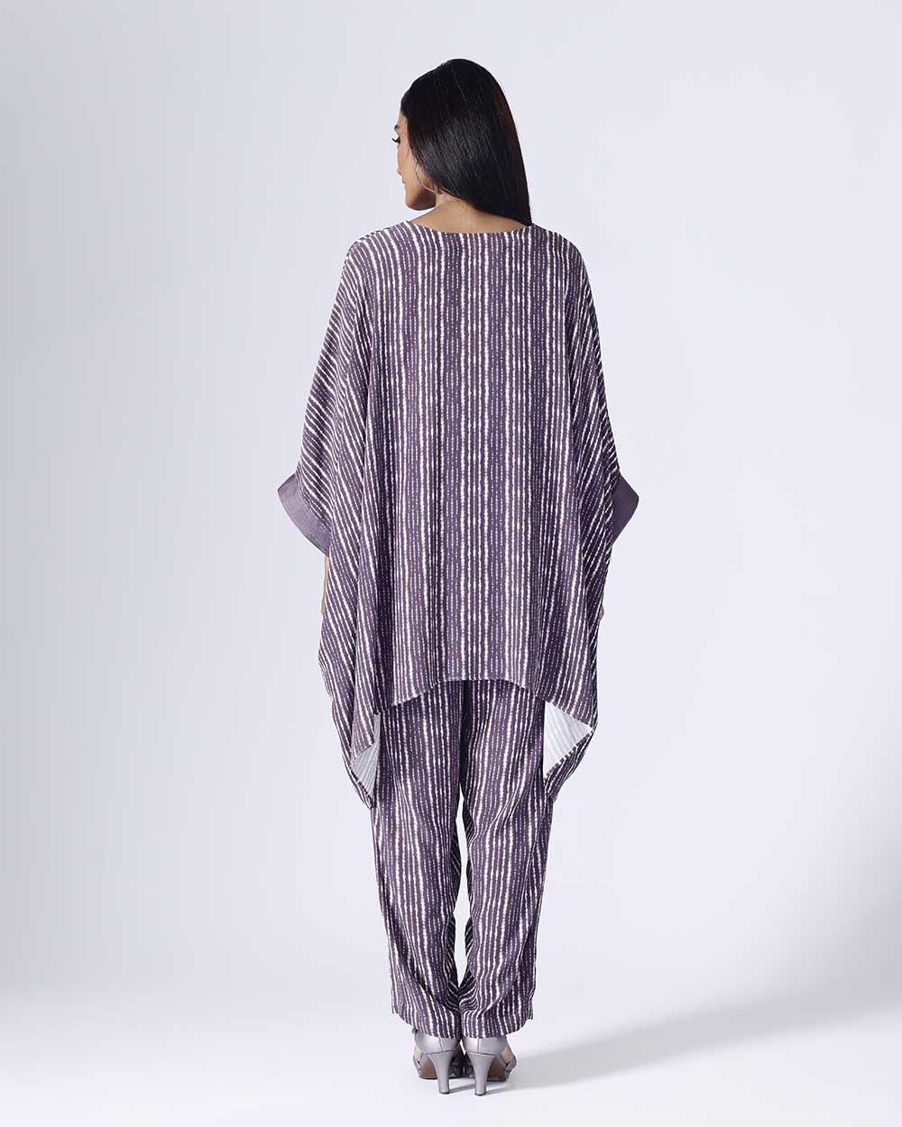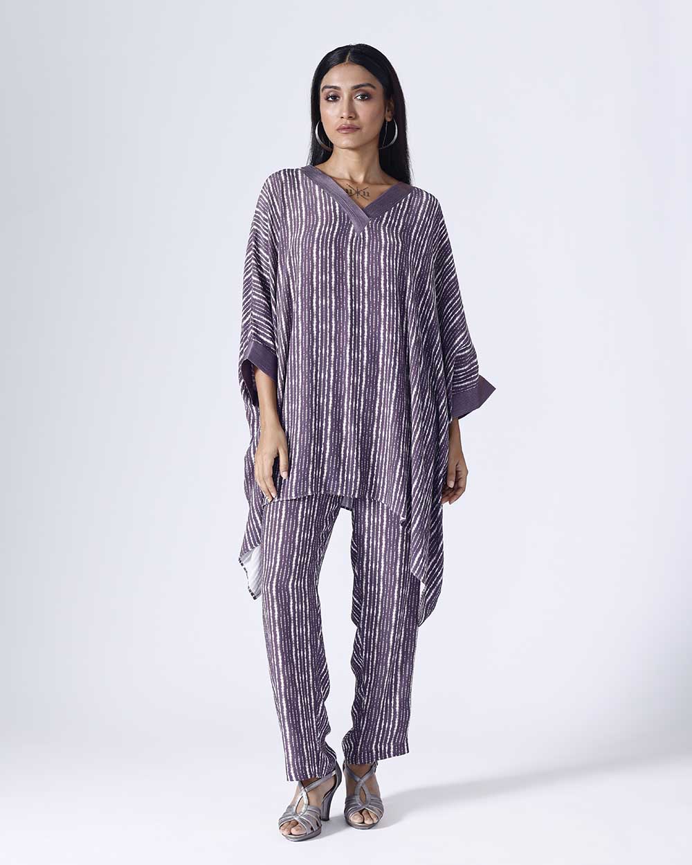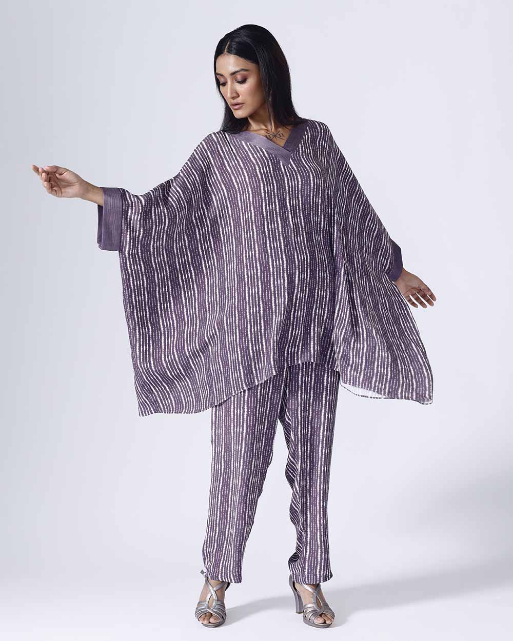 Printed co-ordinated set. Sold as a set of 2. Kaftaan style free slowing top with detailing around neck and sleeves. Pants with pocket and back elastic. Zip fly fastening with a single hook opening on one side.