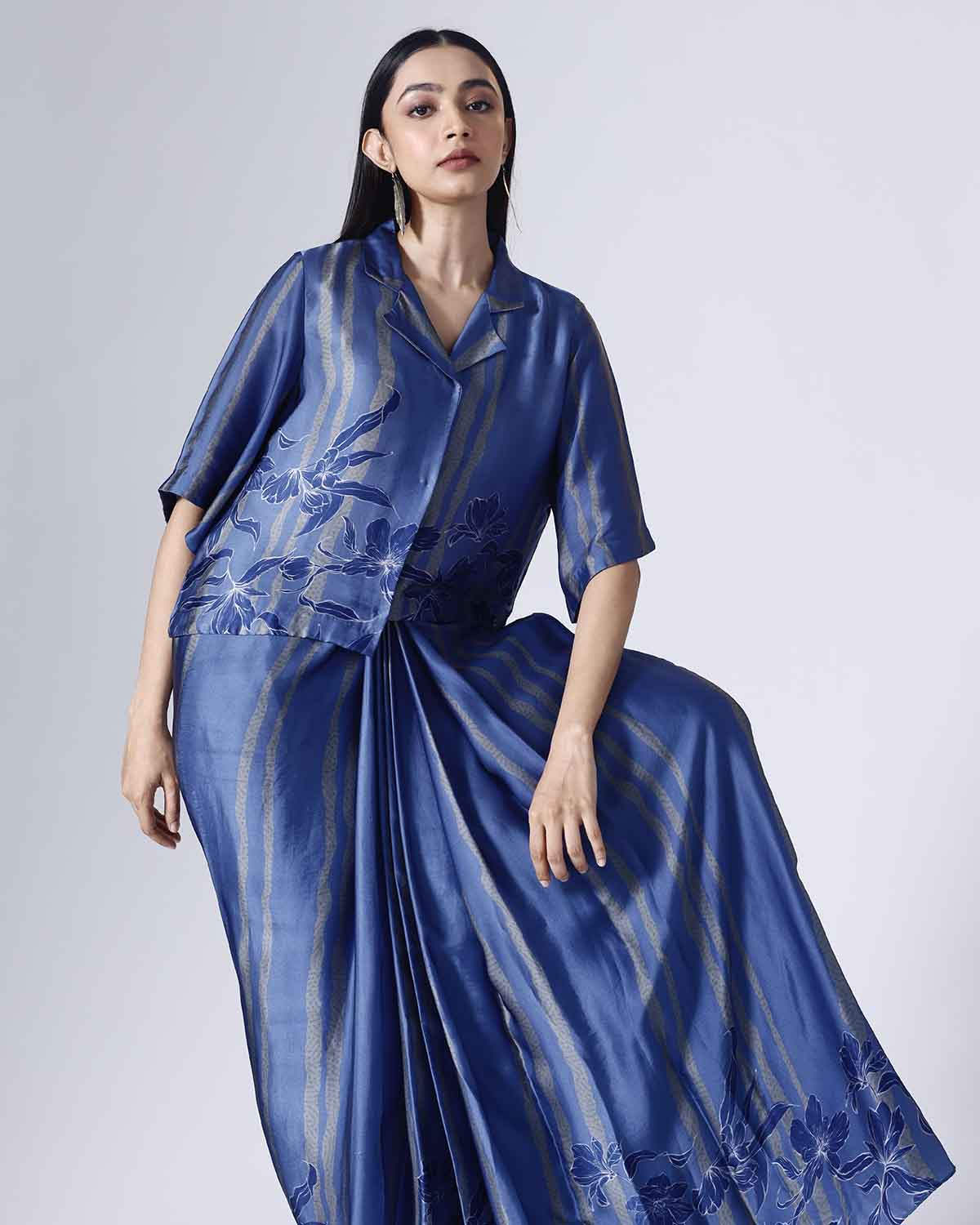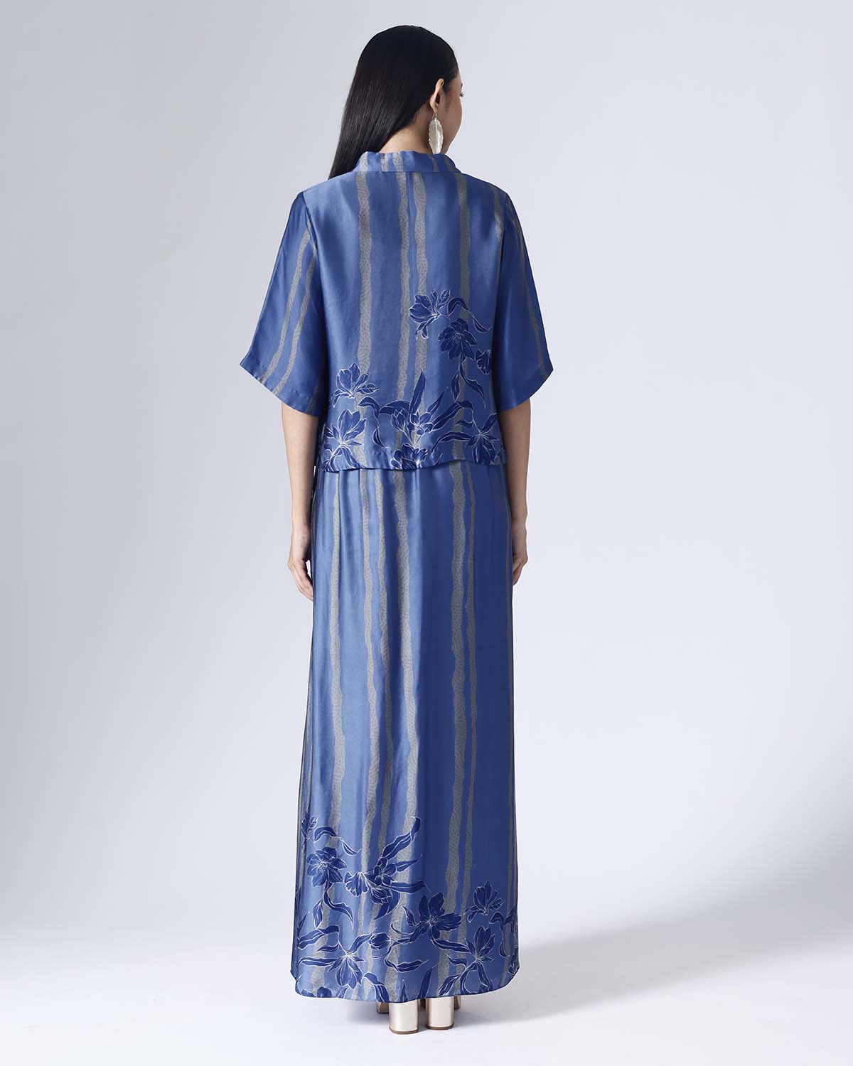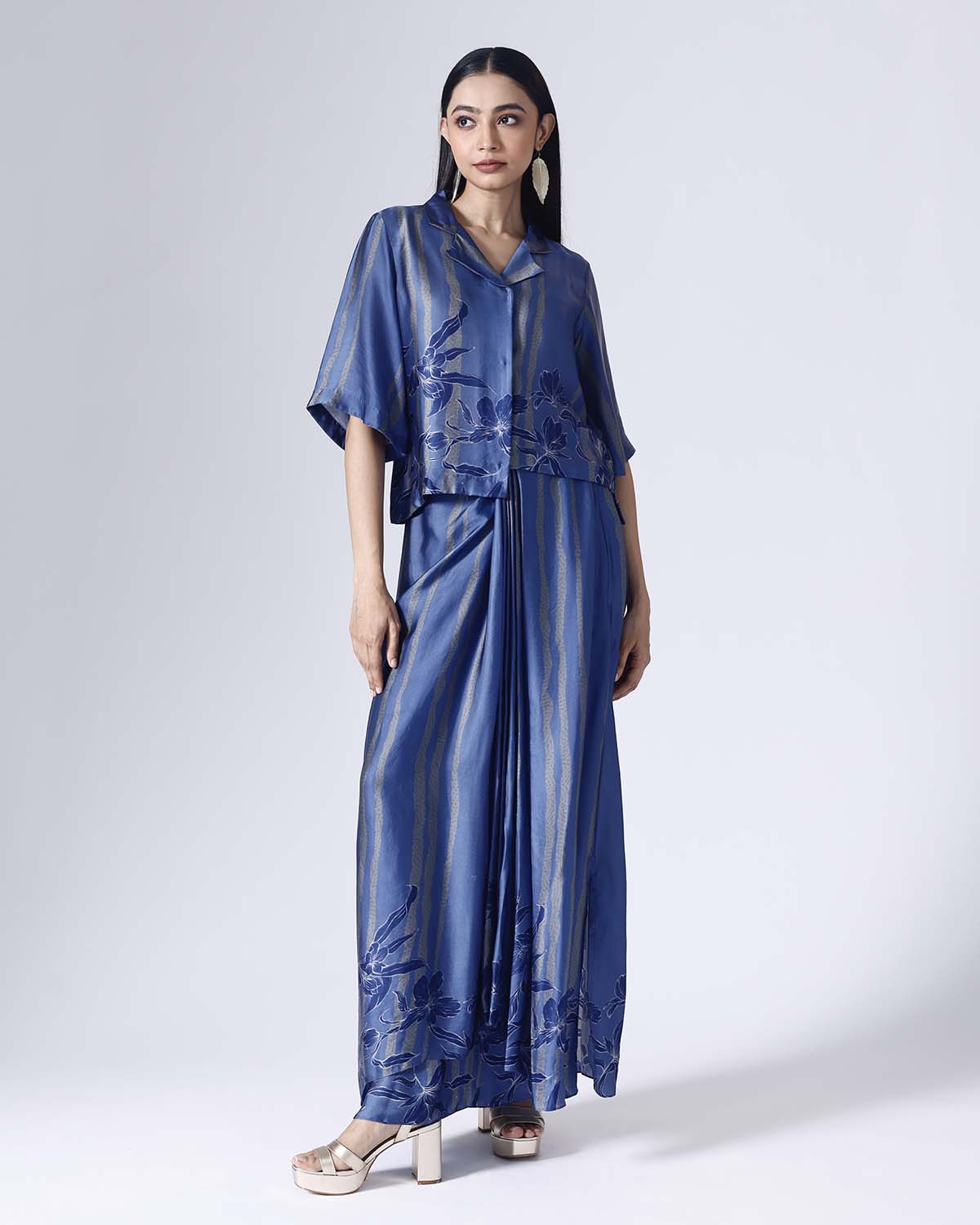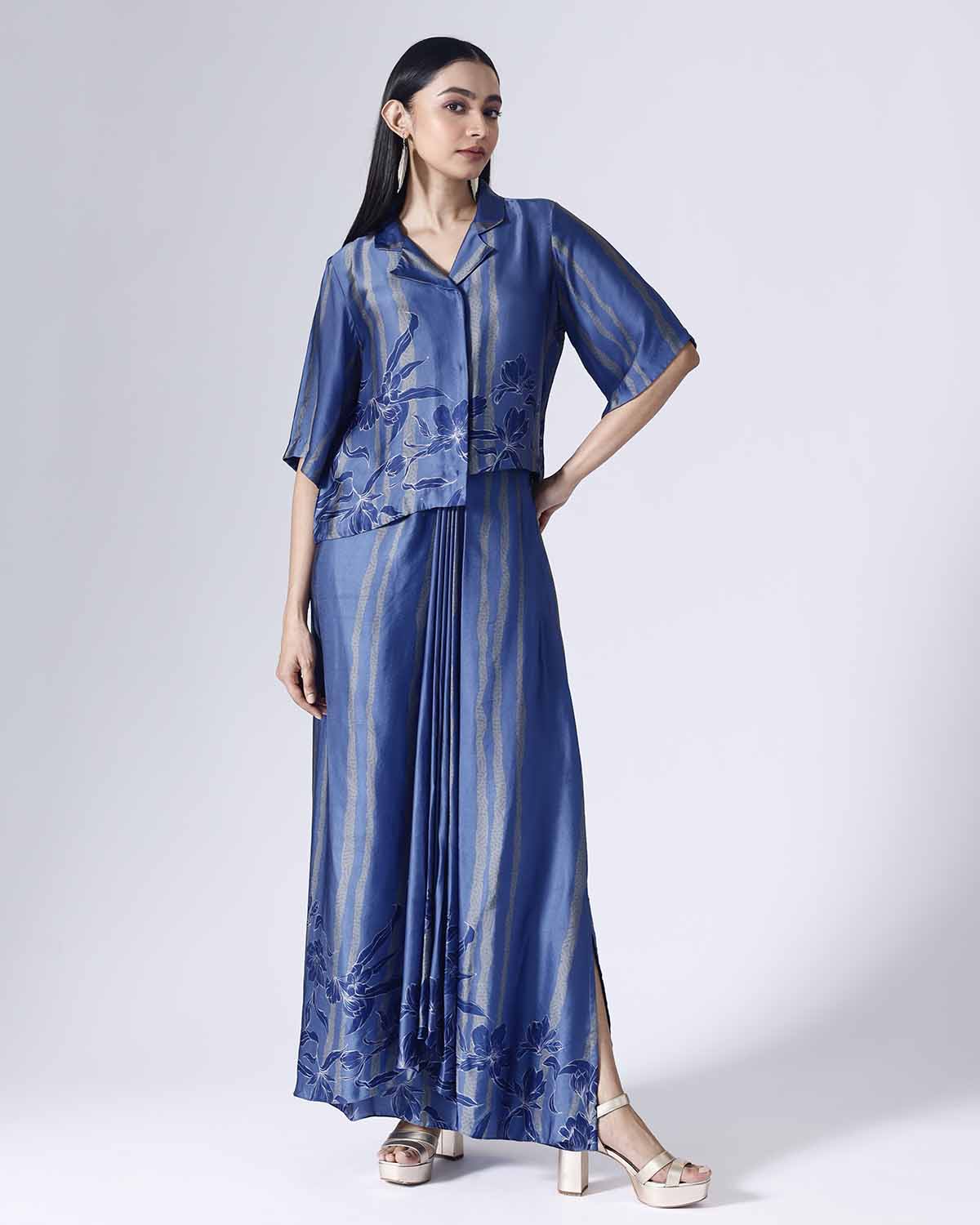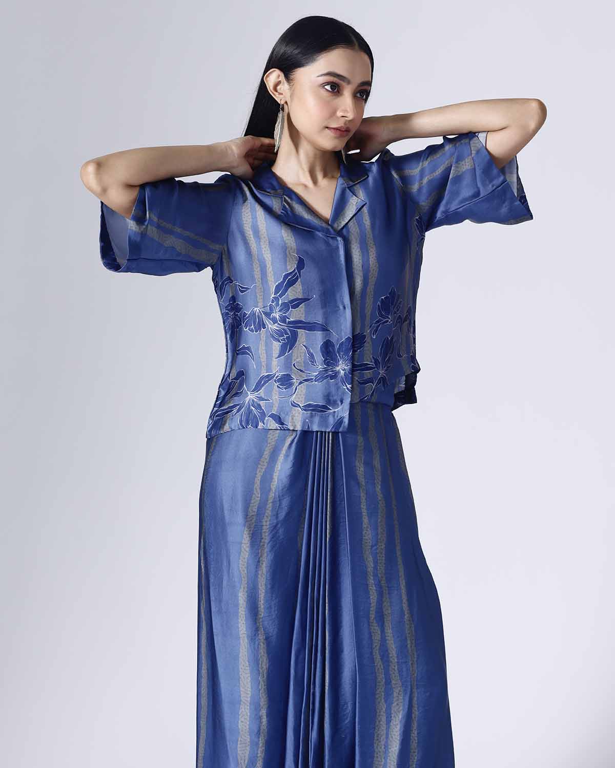 Printed co-ordinated set. Sold as a set of 2. Assymetrical front open top. Draped skirt, with side slit and back elastic. Zip fly fastening with a single hook opening on one side. Mid rise. Regular fit.