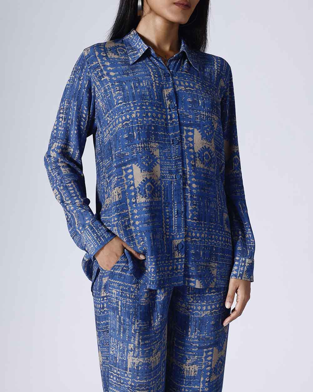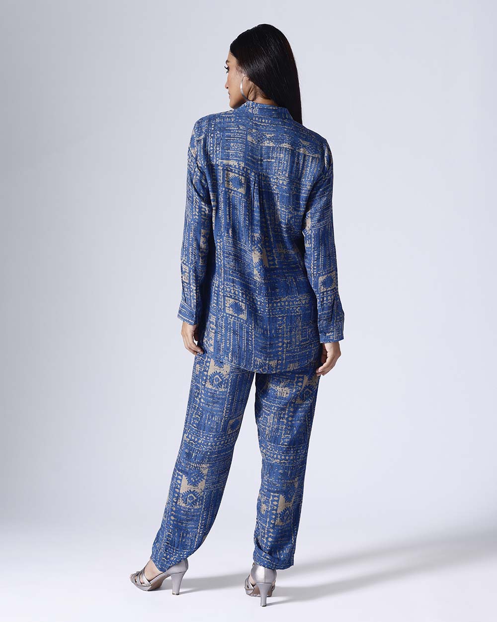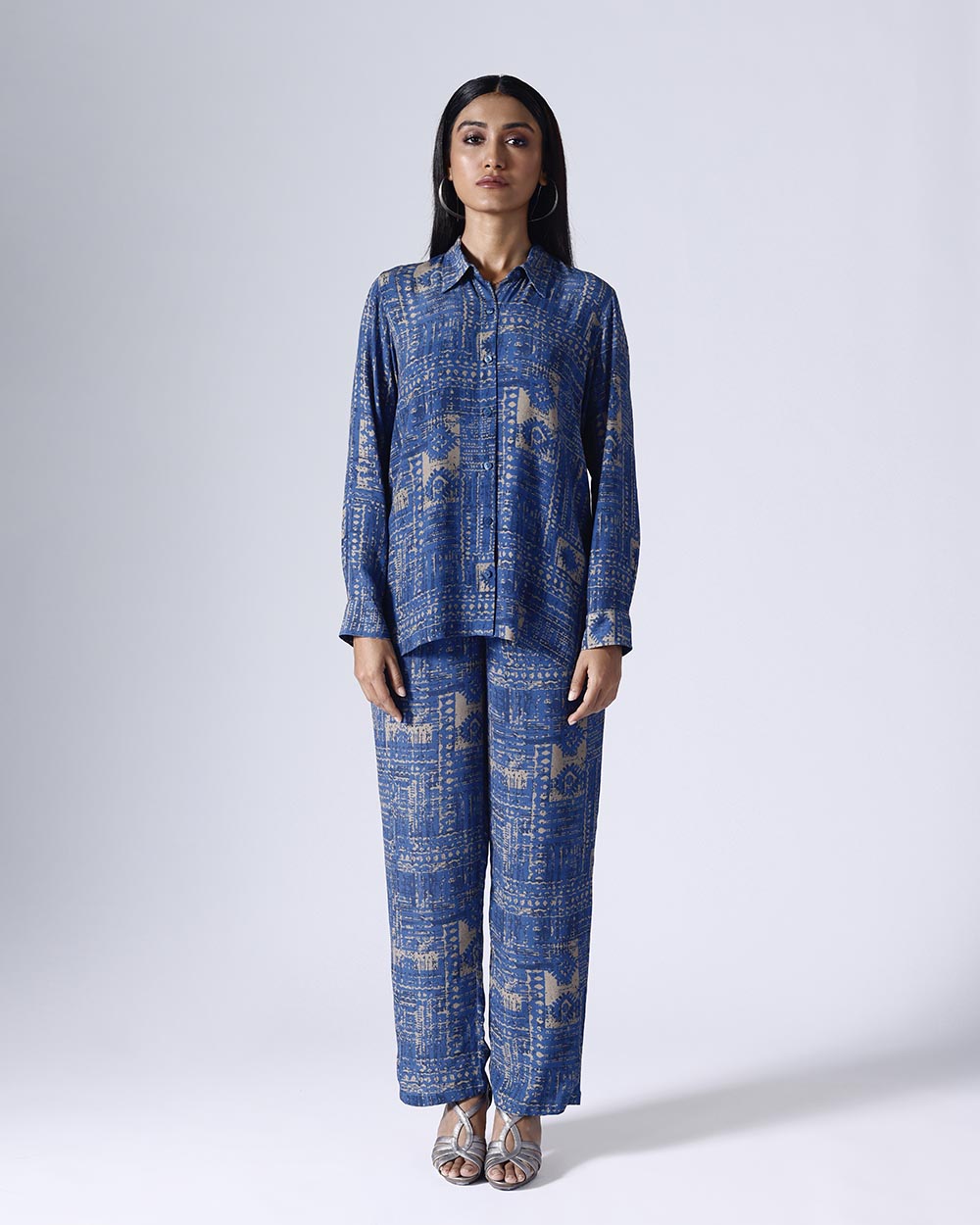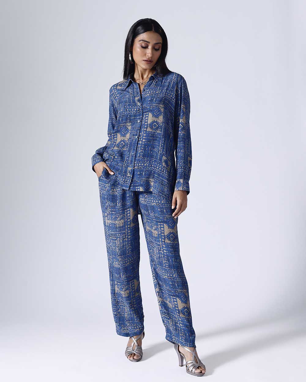 Printed co-ordinated set. Sold as a set of 2. Shirt with three fourth cuff sleeve shirt, with front buttons. Back with thin pleats. Pants with pocket and back elastic. Zip fly fastening with a single hook opening on one side. Mid rise. Regular fit.
