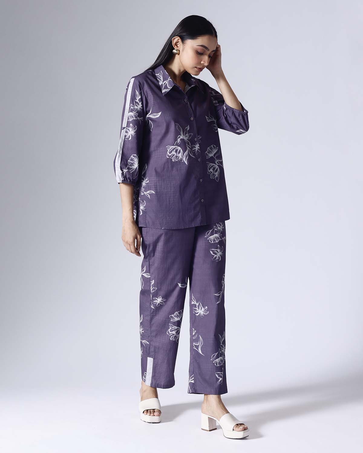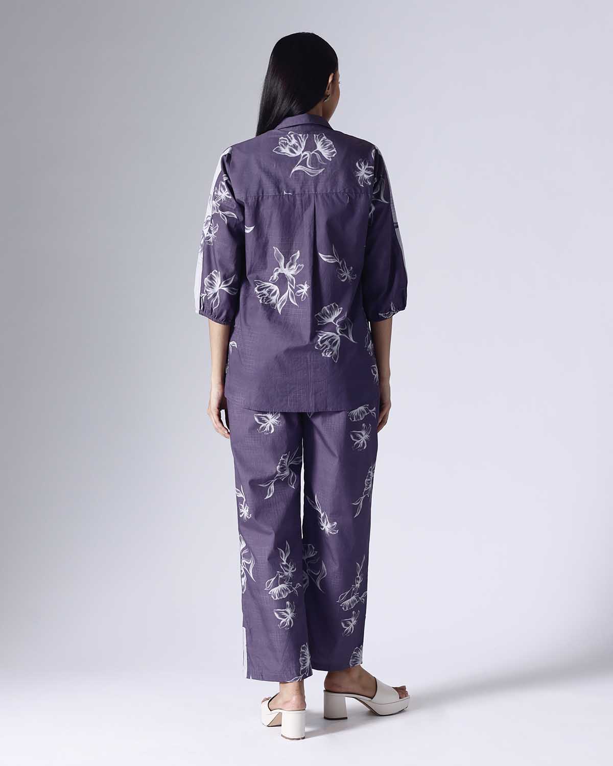 Printed co-ordinated set with printed detailing. Sold as a set of 2. Three fourth elastic sleeve shirt with front buttons. Back with box pleat. Pants with pocket and back elastic. Zip fly fastening with a single hook opening on one side. Mid rise.
