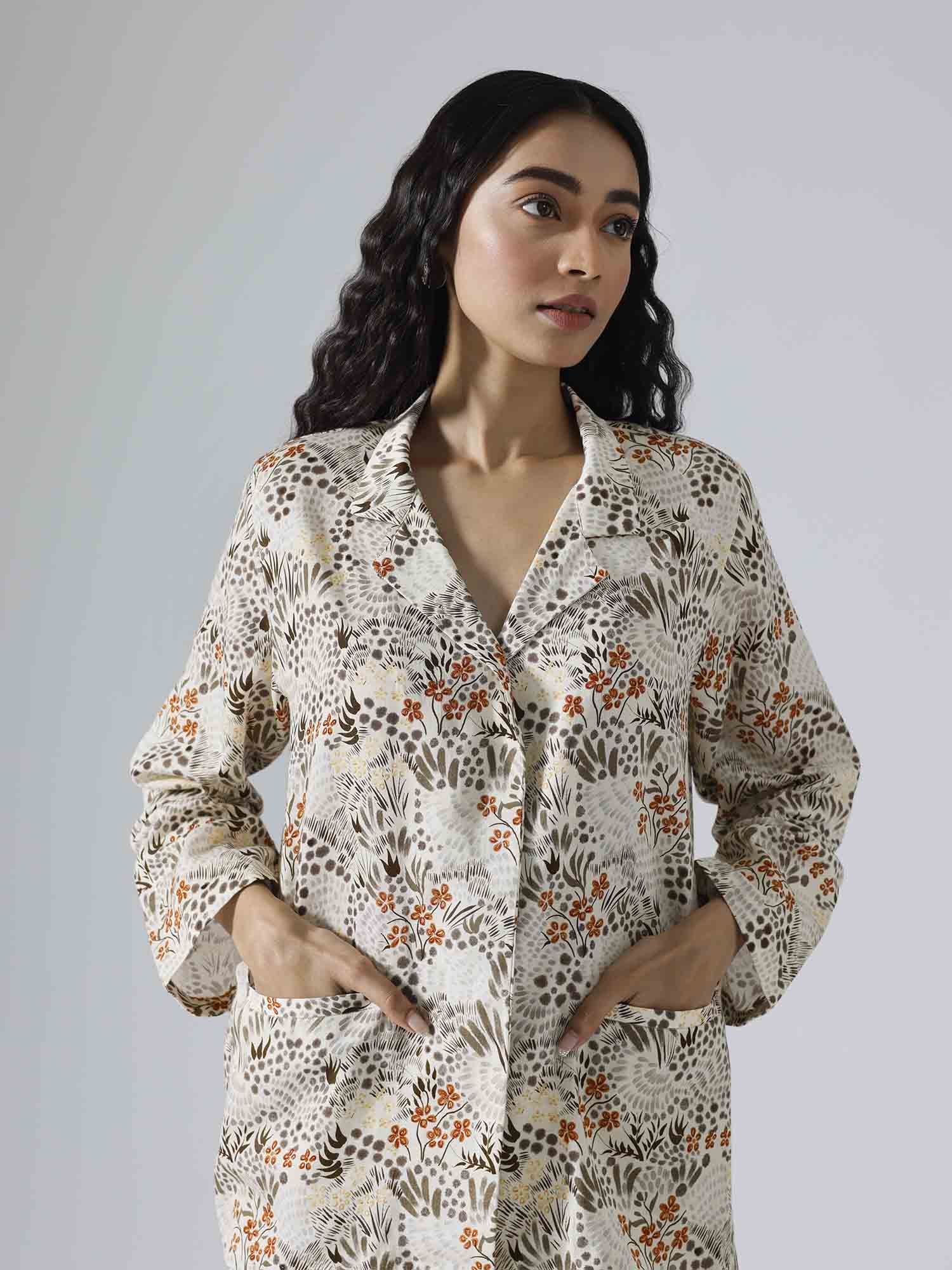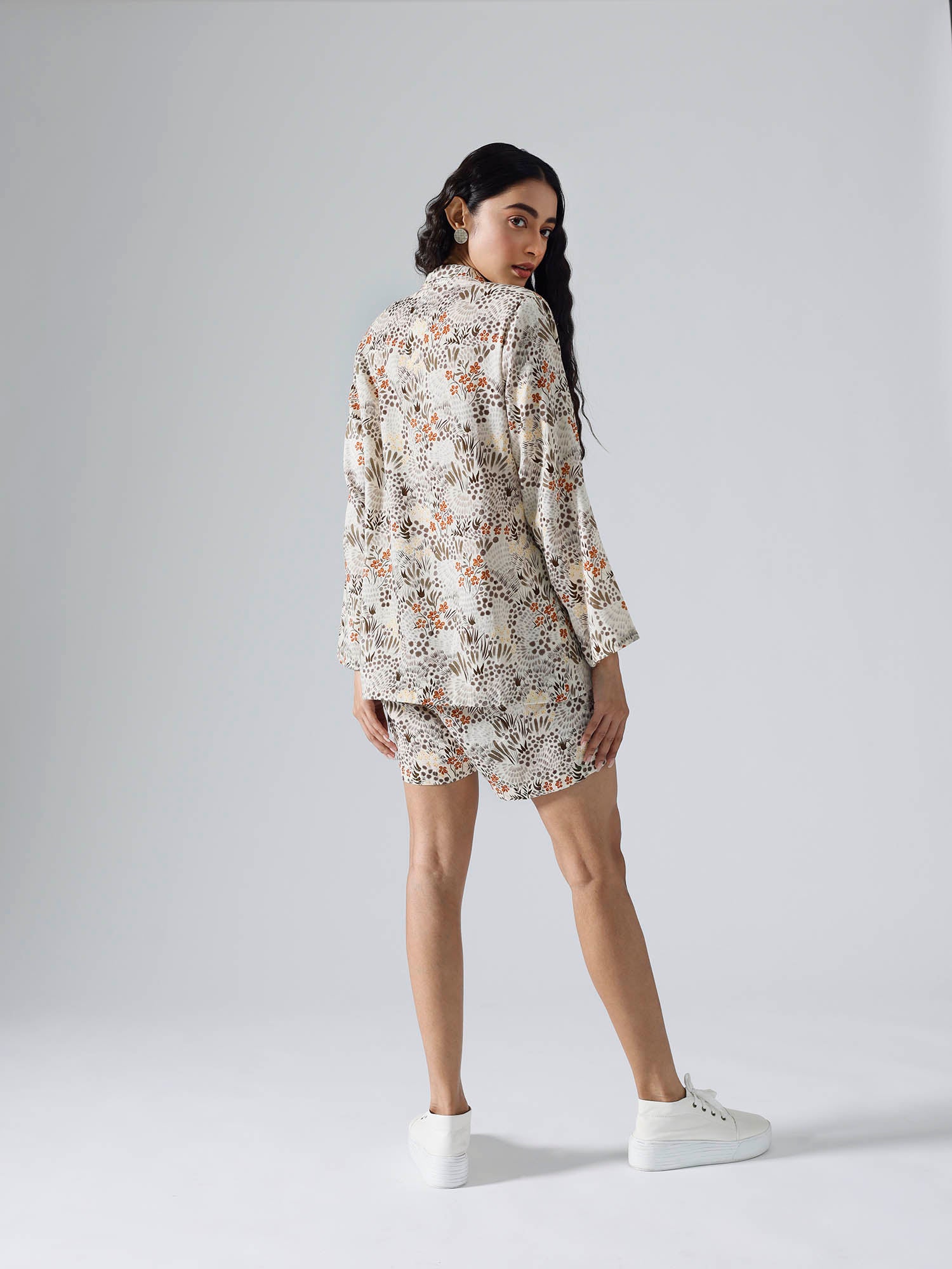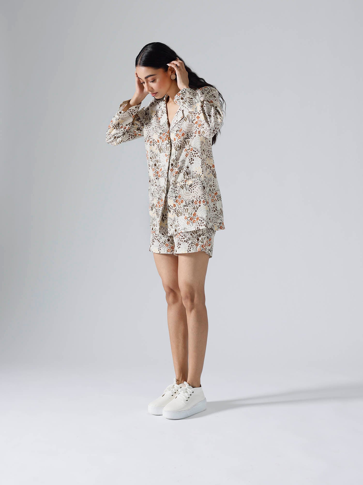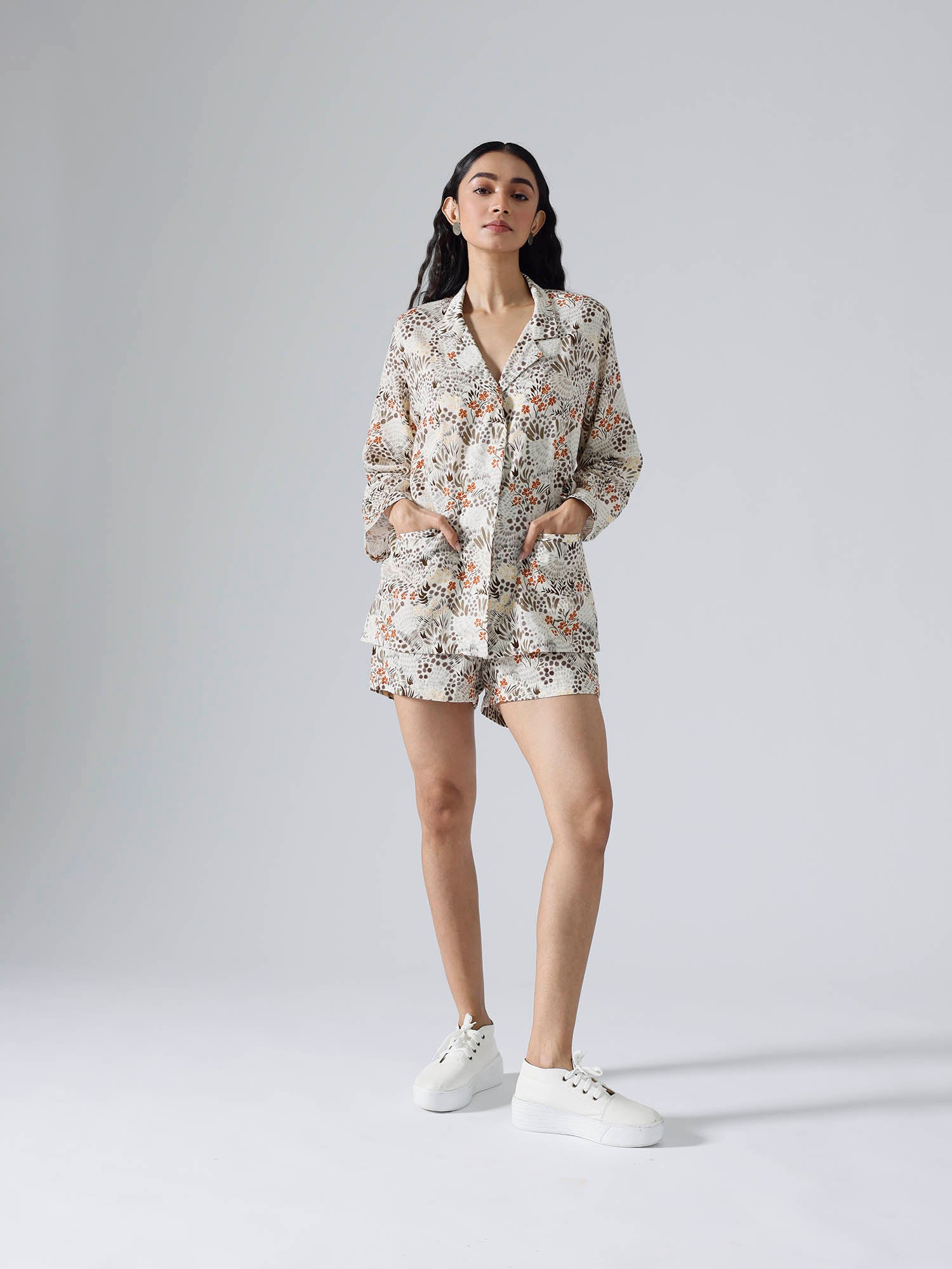 Printed co-ordinated blazer style shirt with shorts. Three fourth sleeve shirt. Shorts with pocket and back elastic. Zip fly fastening with a single hook fastening on one side. Mid rise. Regular fit.