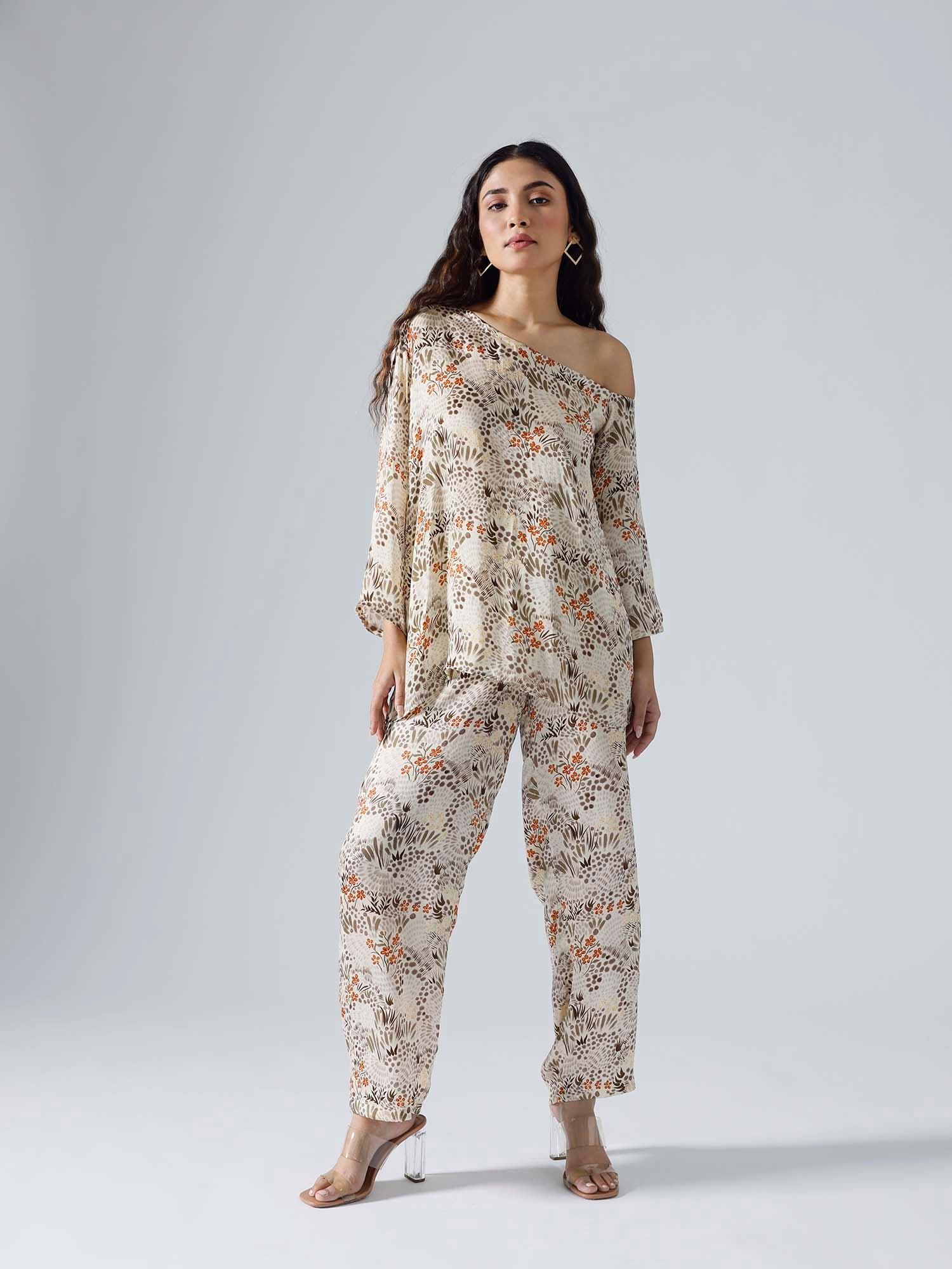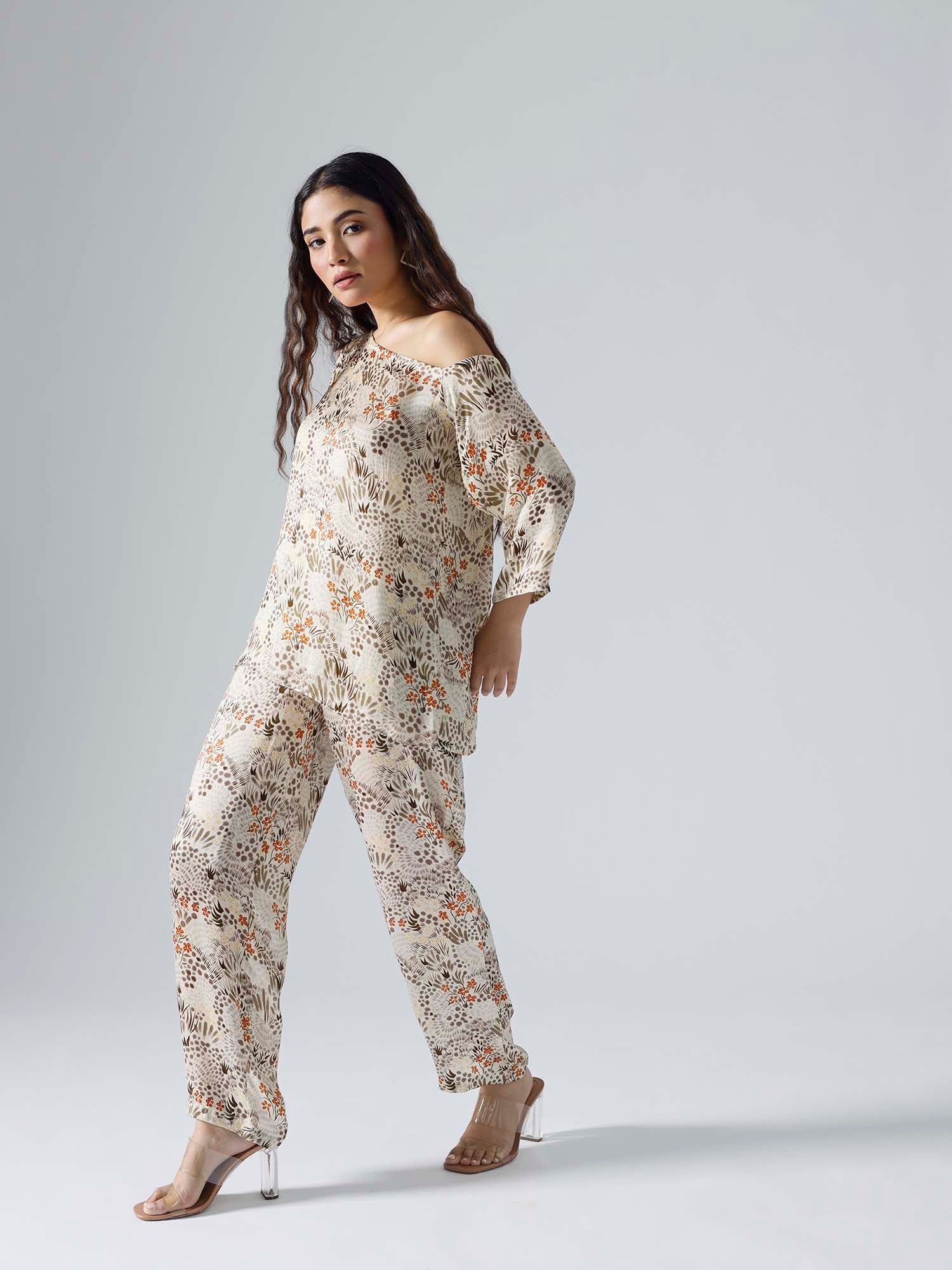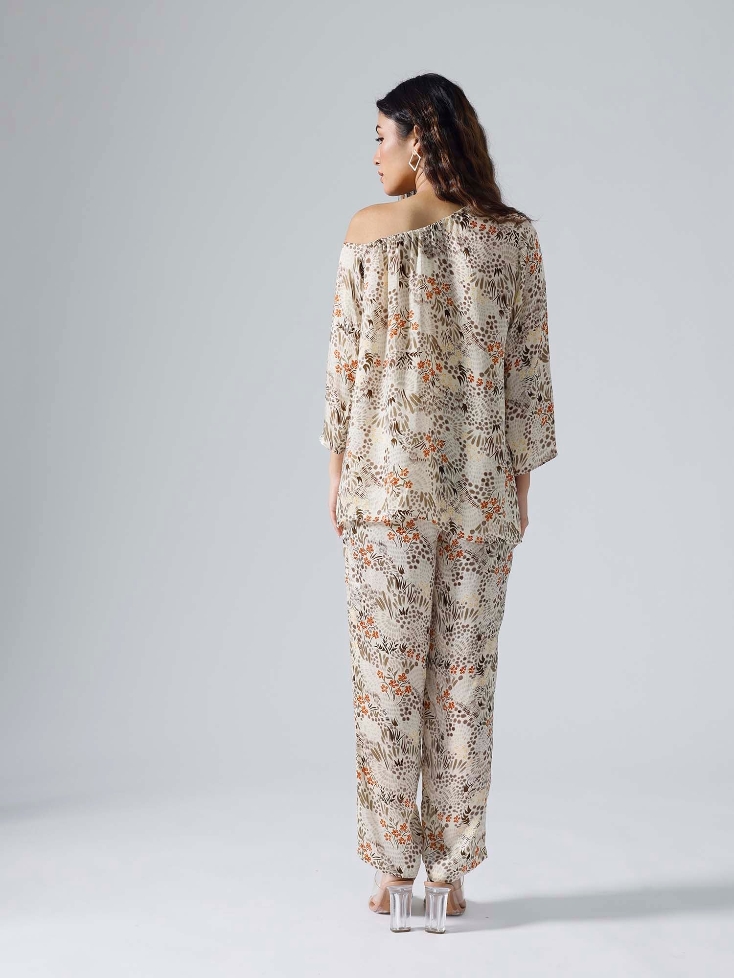 Printed drop shoulder co-ordinated set. Sold as a set of 2. Three fourth sleeve top. Pants with pocket and back elastic. Zip fly fastening with a single hook fastening on one side. Mid rise. Regular fit.