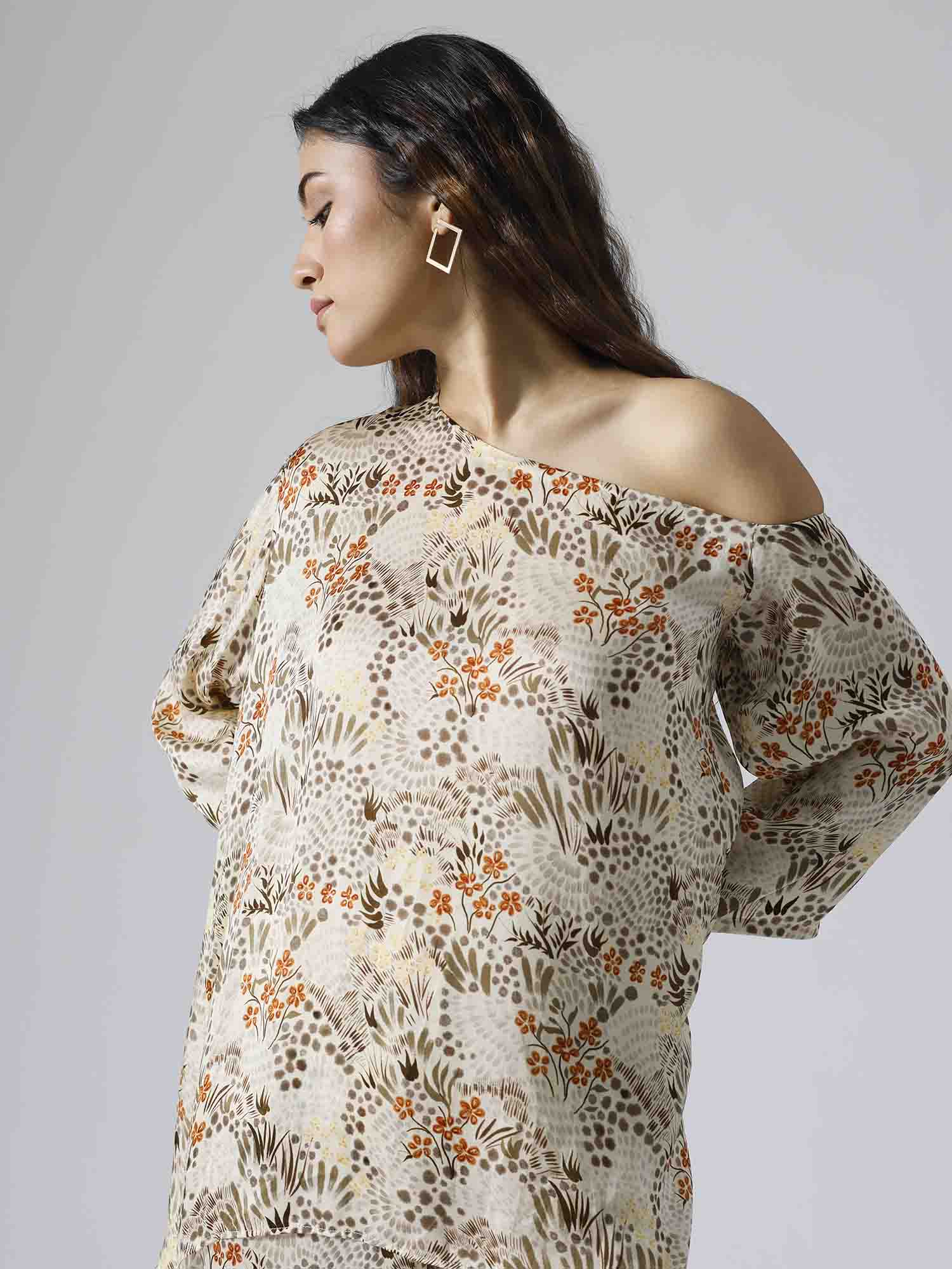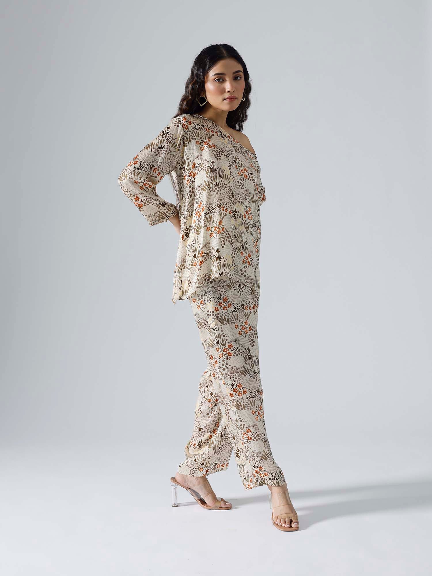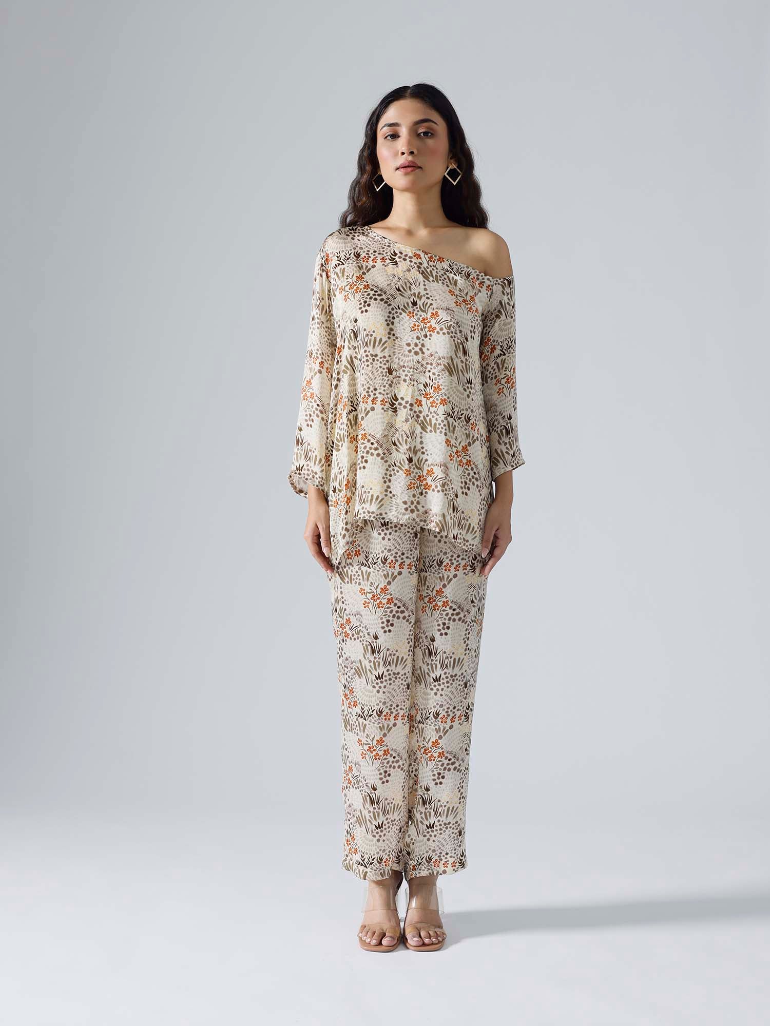 Printed drop shoulder co-ordinated set. Sold as a set of 2. Three fourth sleeve top. Pants with pocket and back elastic. Zip fly fastening with a single hook fastening on one side. Mid rise. Regular fit.