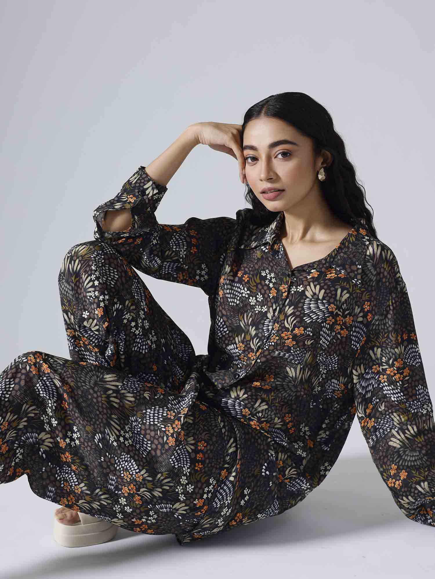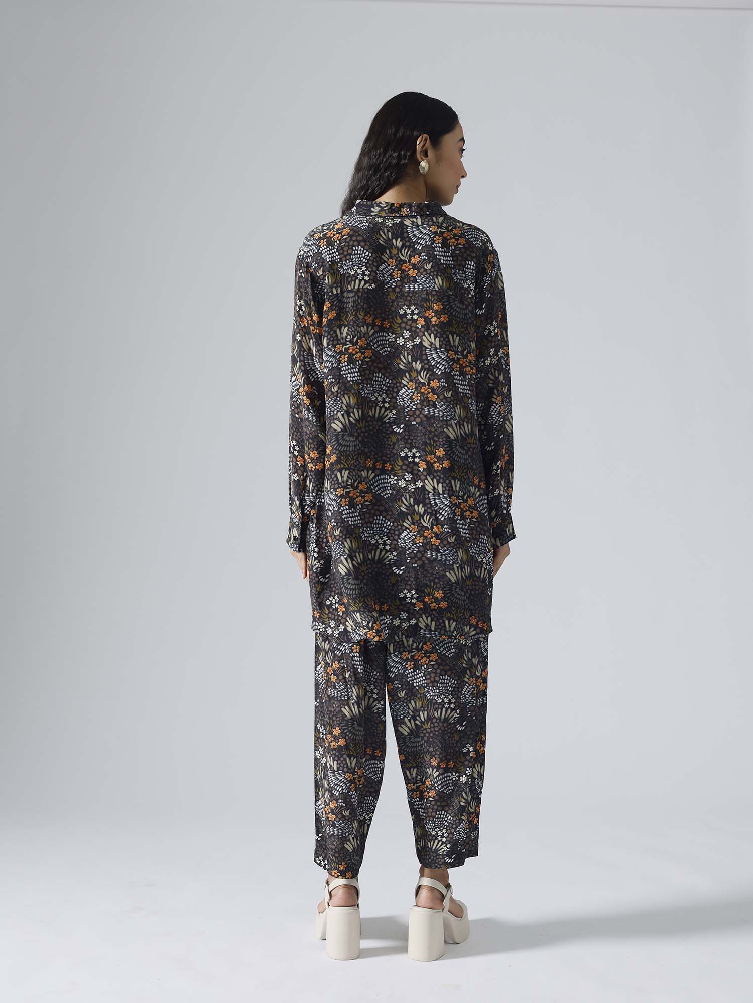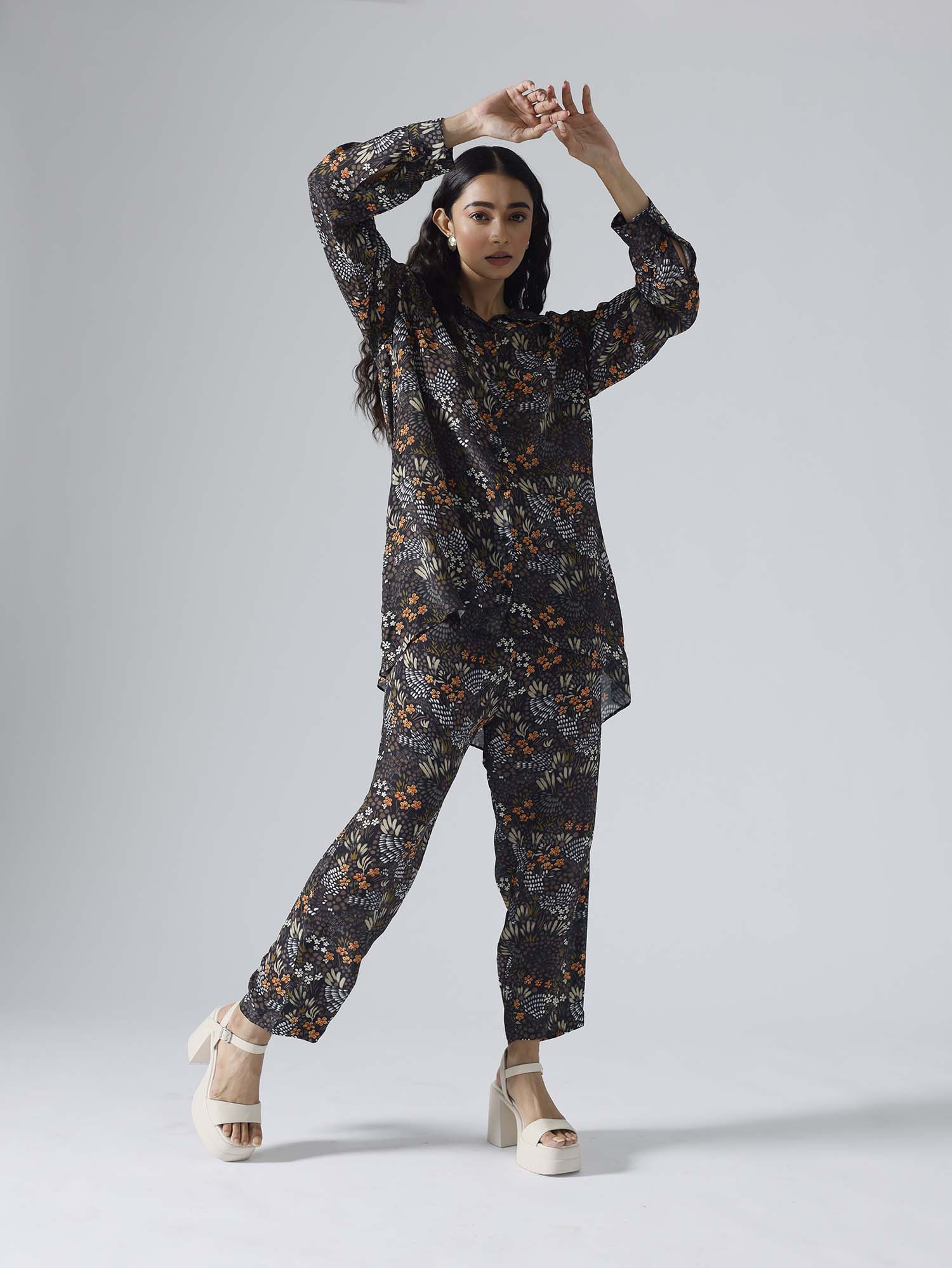 Printed high low co-ordinated set. Sold as a set of 2. Full sleeve shirt with front buttons. Pants with pocket and back elastic. Zip fly fastening with a single hook fastening on one side. Mid rise. Regular fit.
