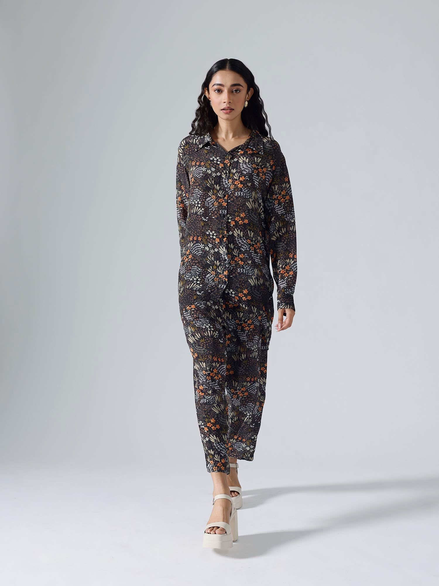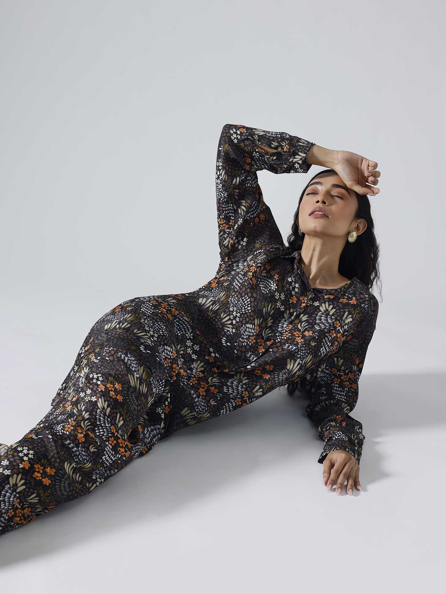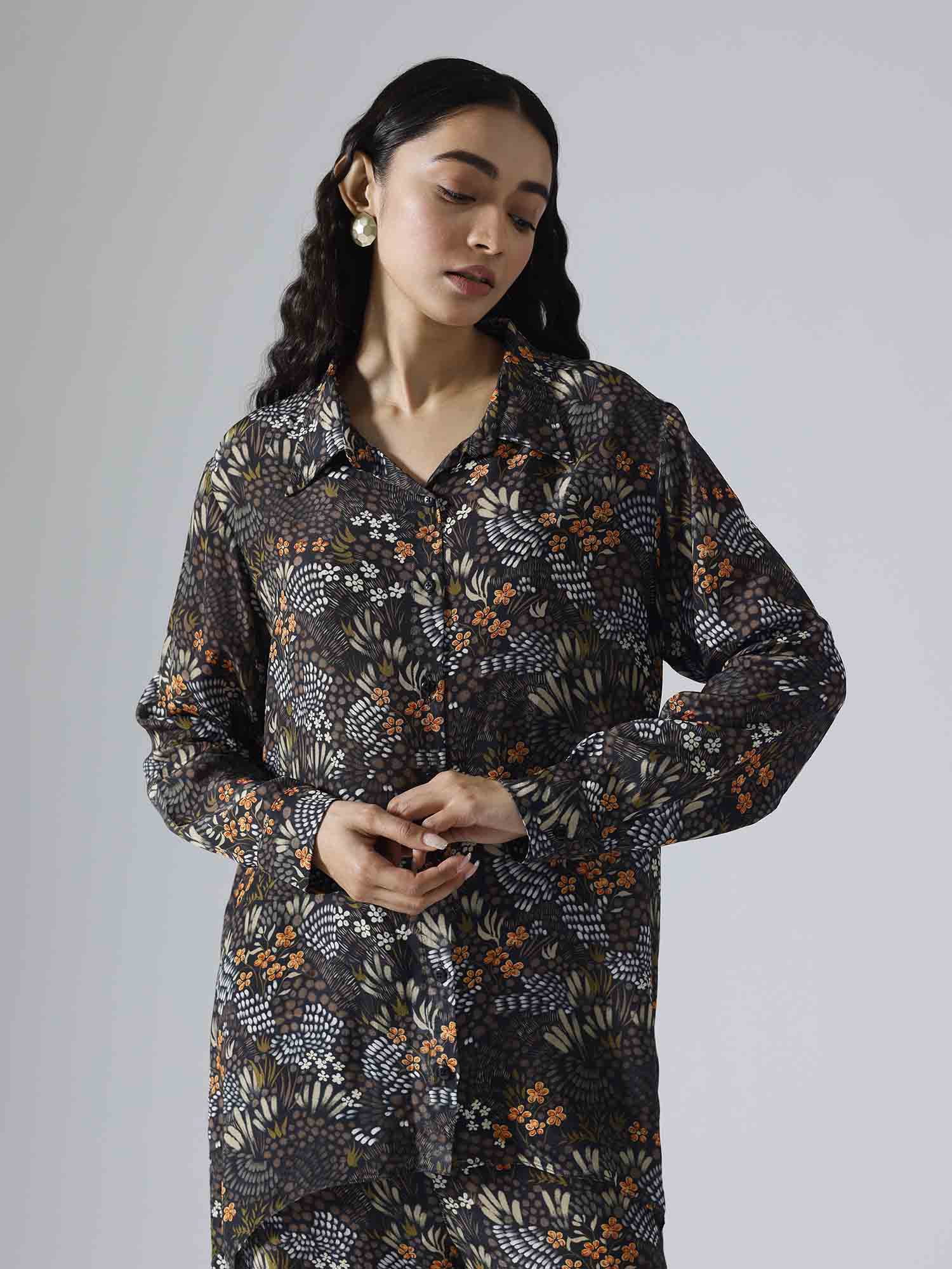 Printed high low co-ordinated set. Sold as a set of 2. Full sleeve shirt with front buttons. Pants with pocket and back elastic. Zip fly fastening with a single hook fastening on one side. Mid rise. Regular fit.