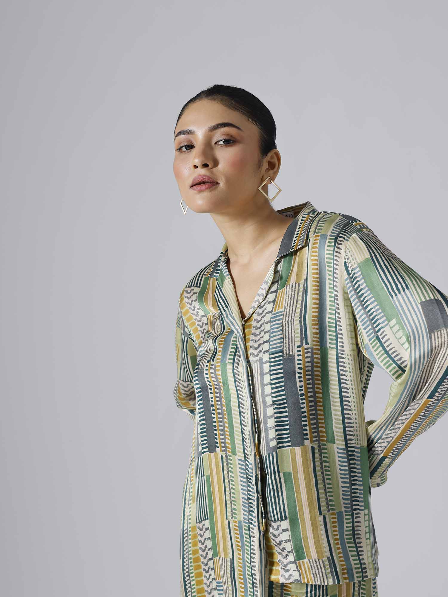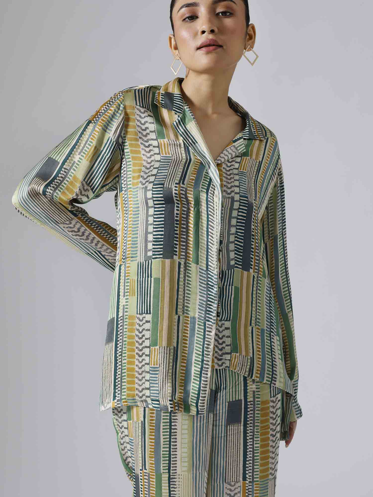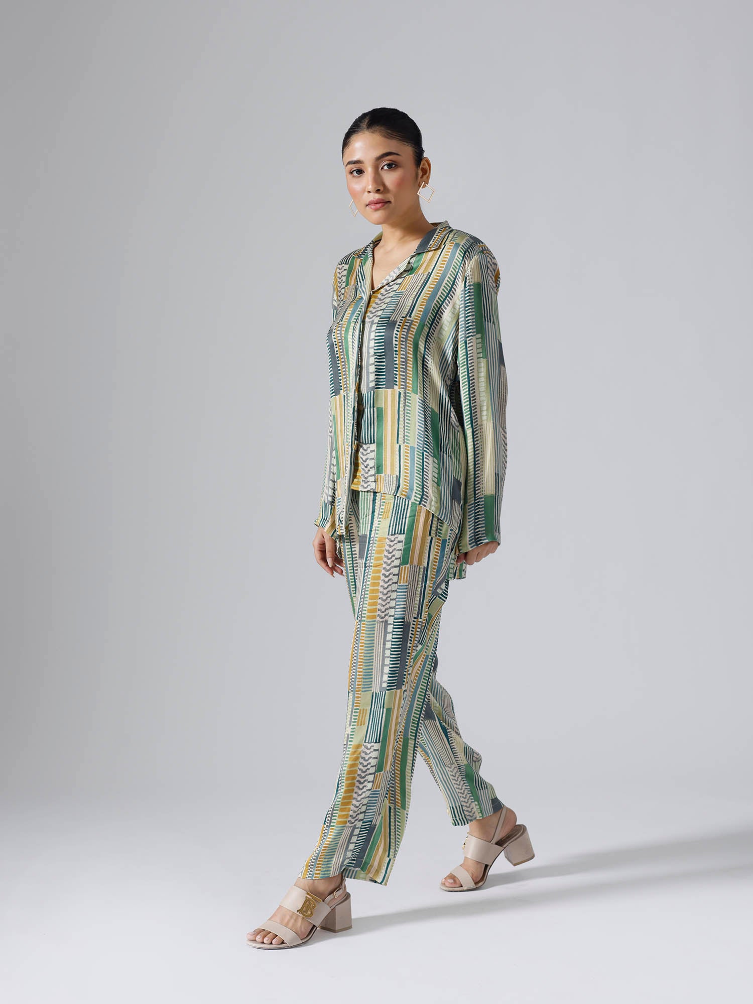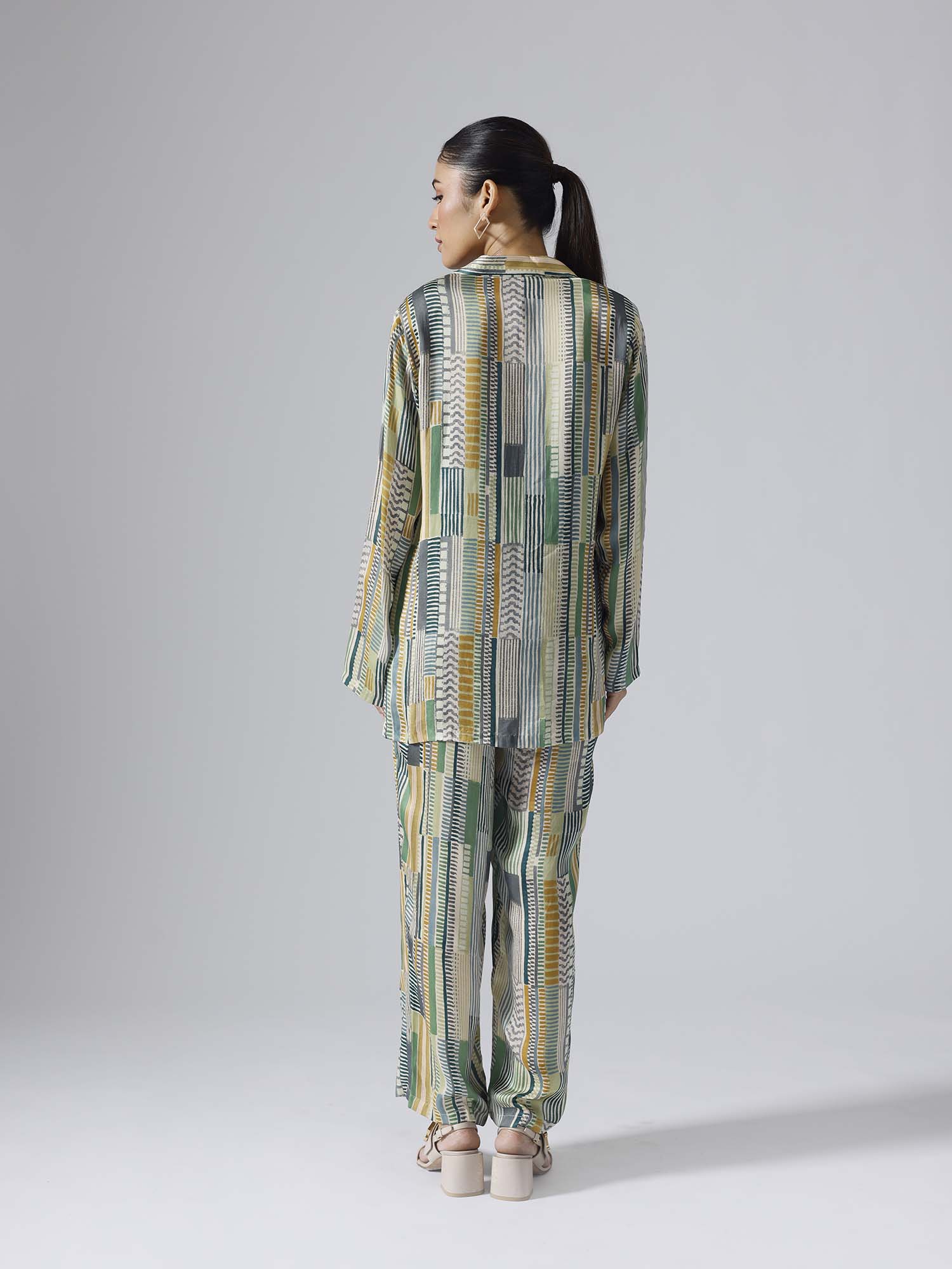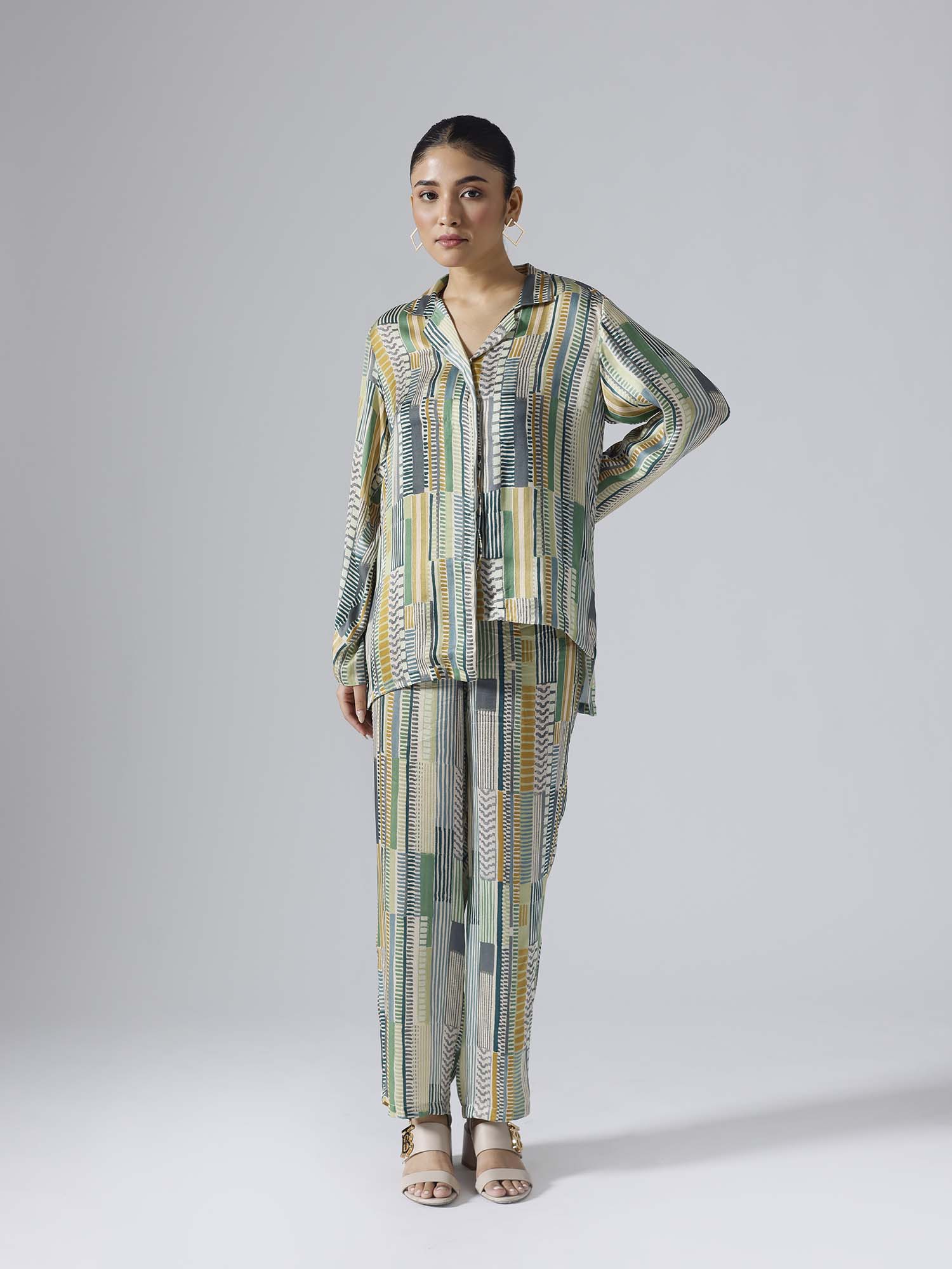 Printed assymetric blazer co-ordinated set. Sold as a set of 2. Three-fourth sleeve assymetric shirt with blazer collar and front buttons. Pants with pocket and back elastic. Zip fly fastening with a single hook fastening on one side. Mid rise. Regular fit.