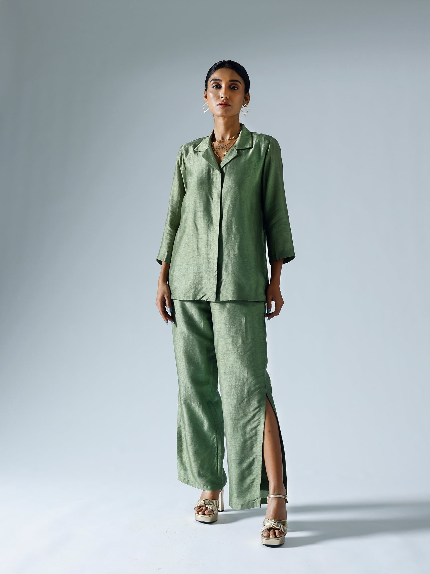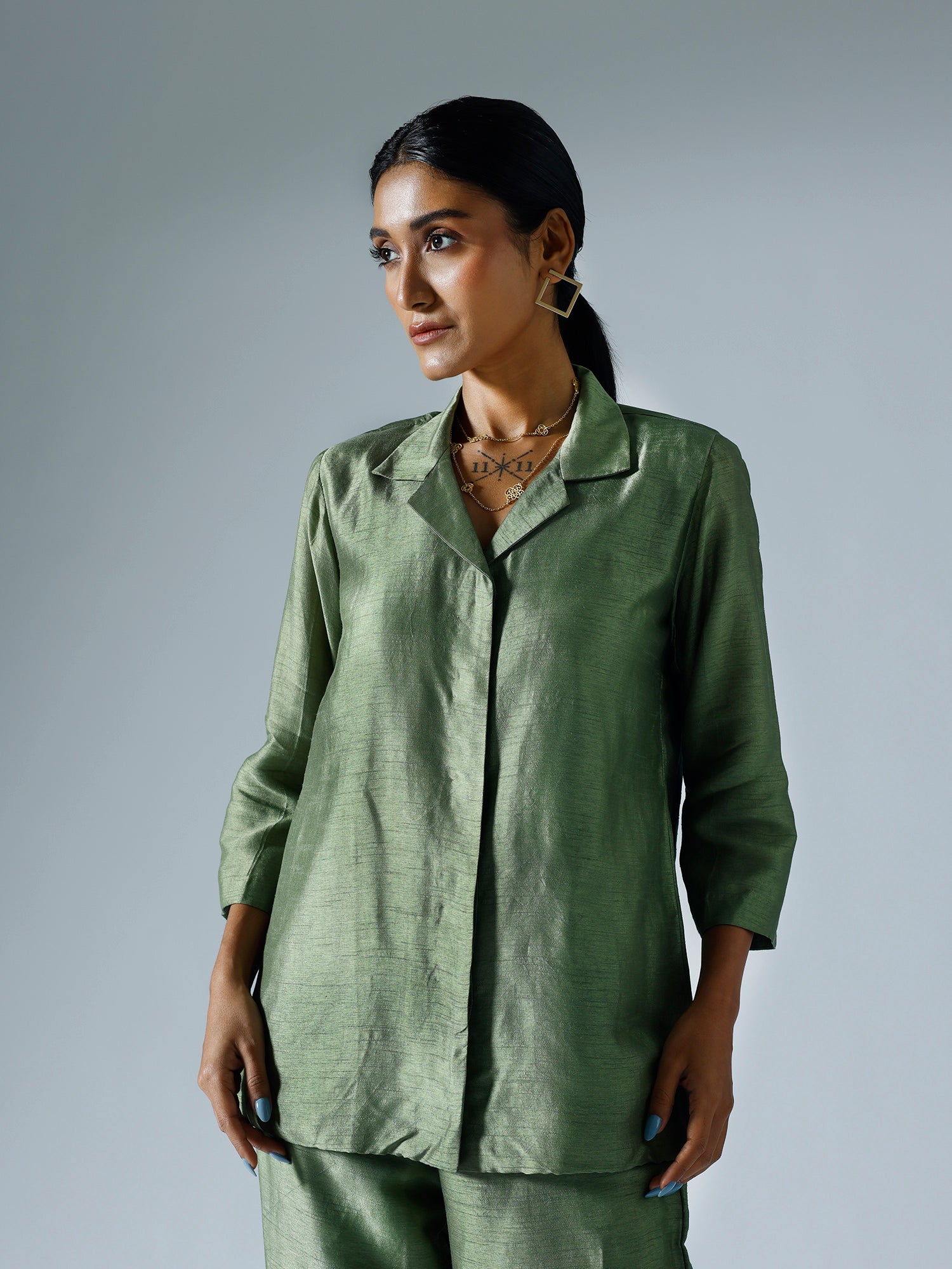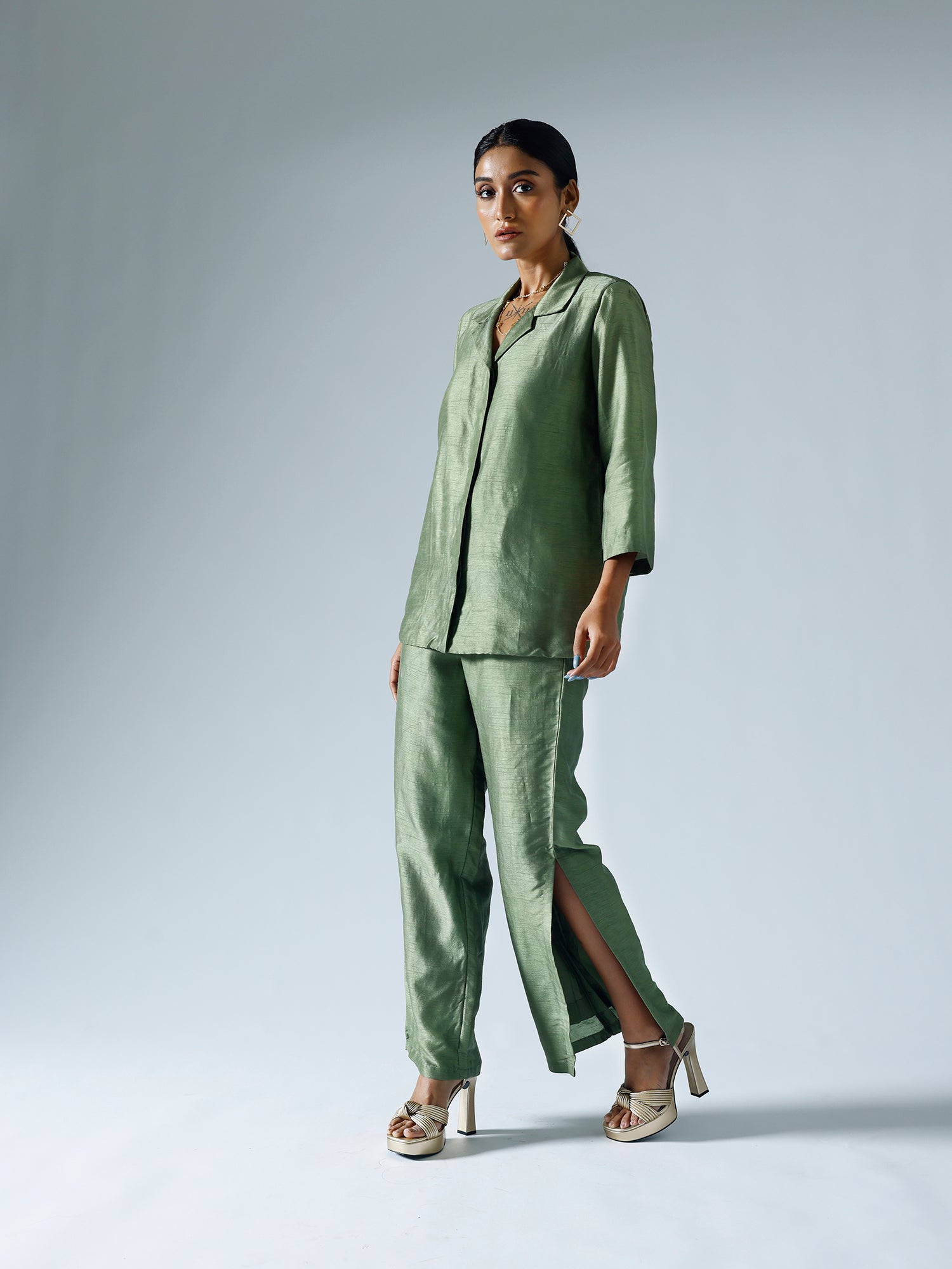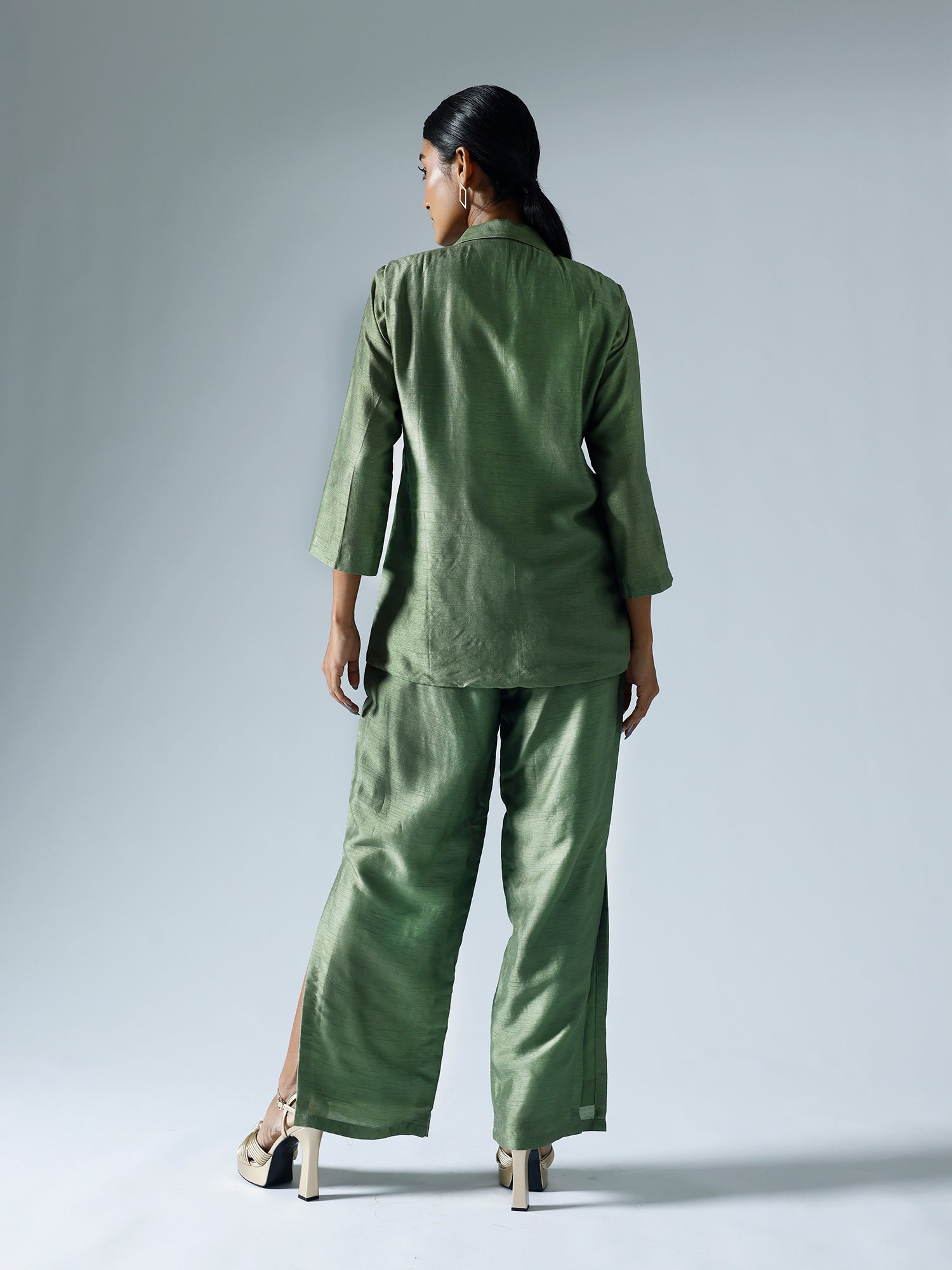 Blazer style collar with shoulder pads, three fourth sleeves with front concealed buttons. Slitted pants with pocket and back elastic. Zip fly fastening with a single hook fastening on one side. Having cotton Lining . Mid rise. Regular fit.