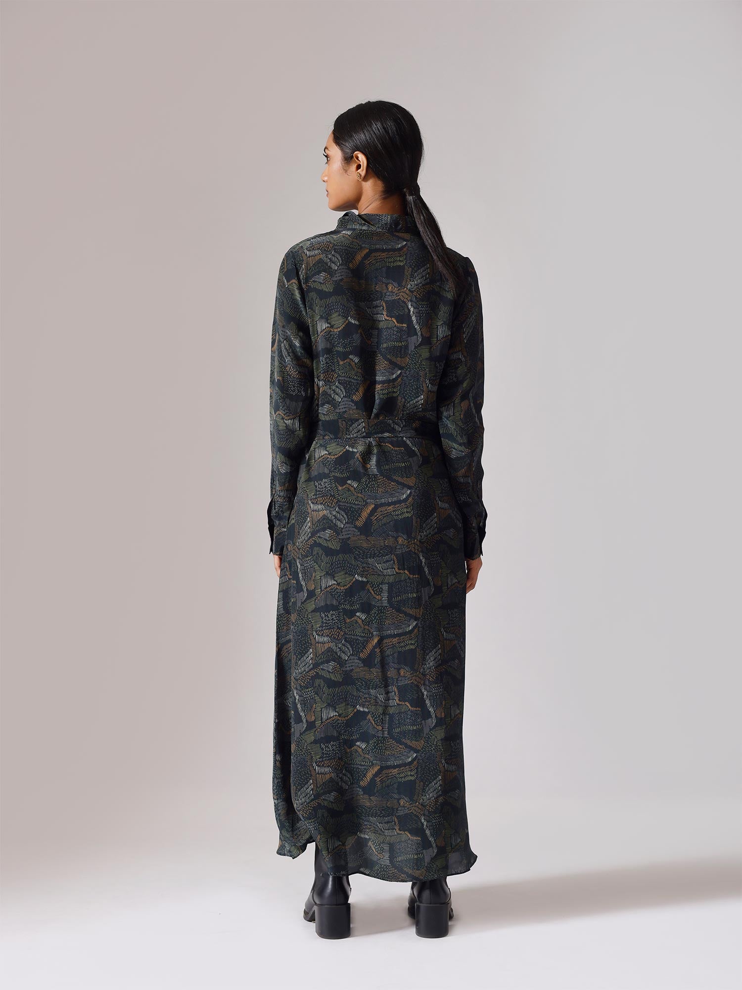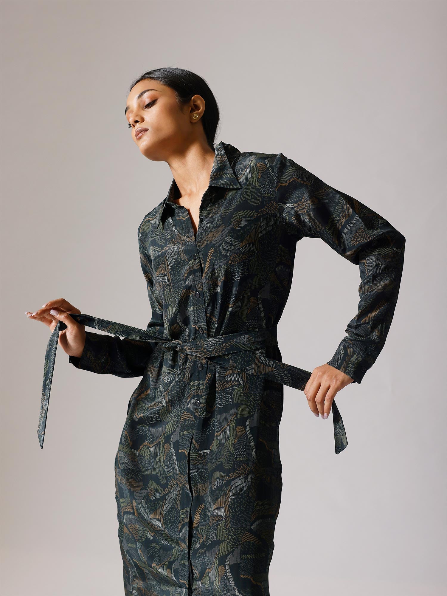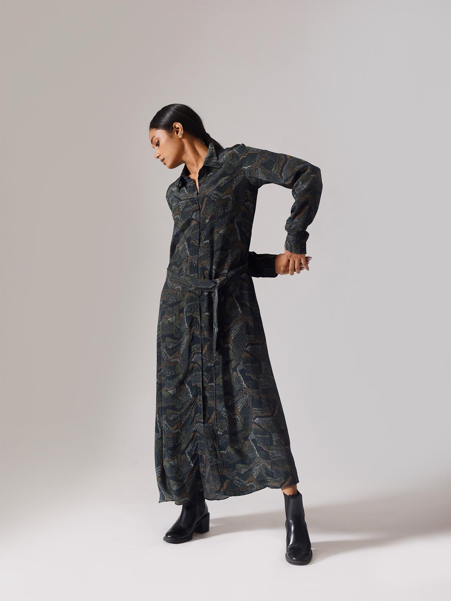Printed long dress with belt and pockets. Sold as one set. Full sleeves. Front open with buttons. Belt is separate. Regular fit.