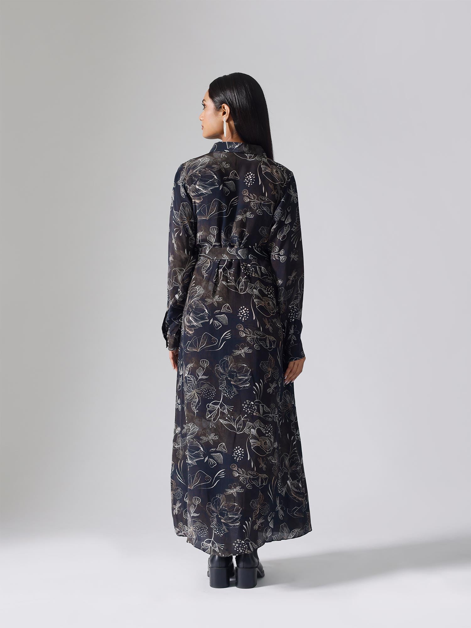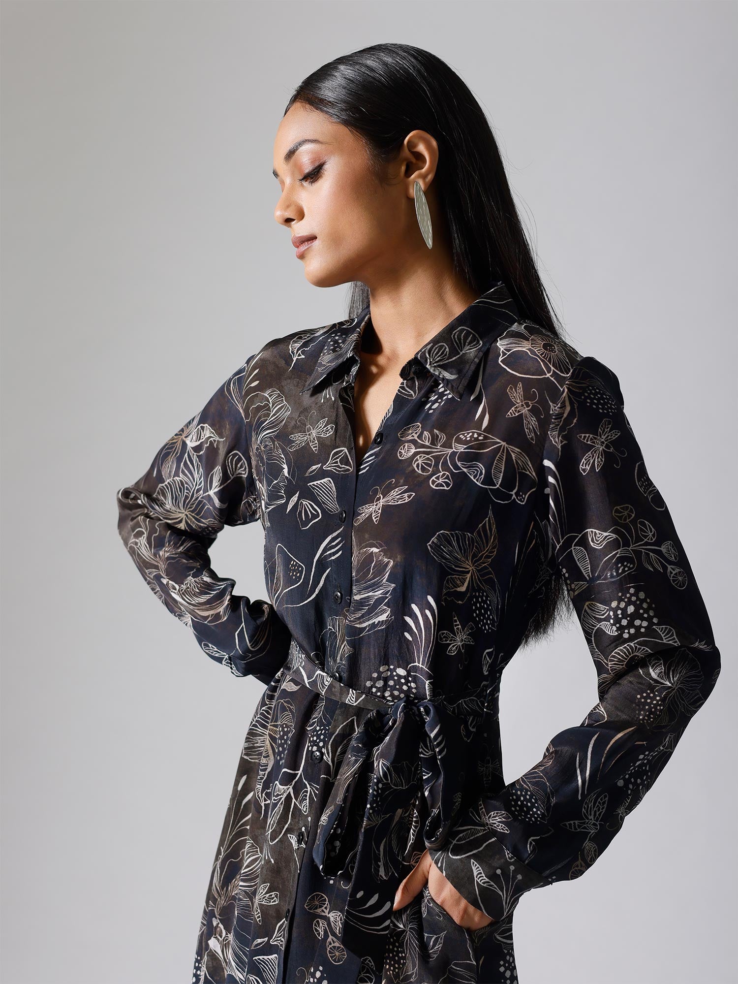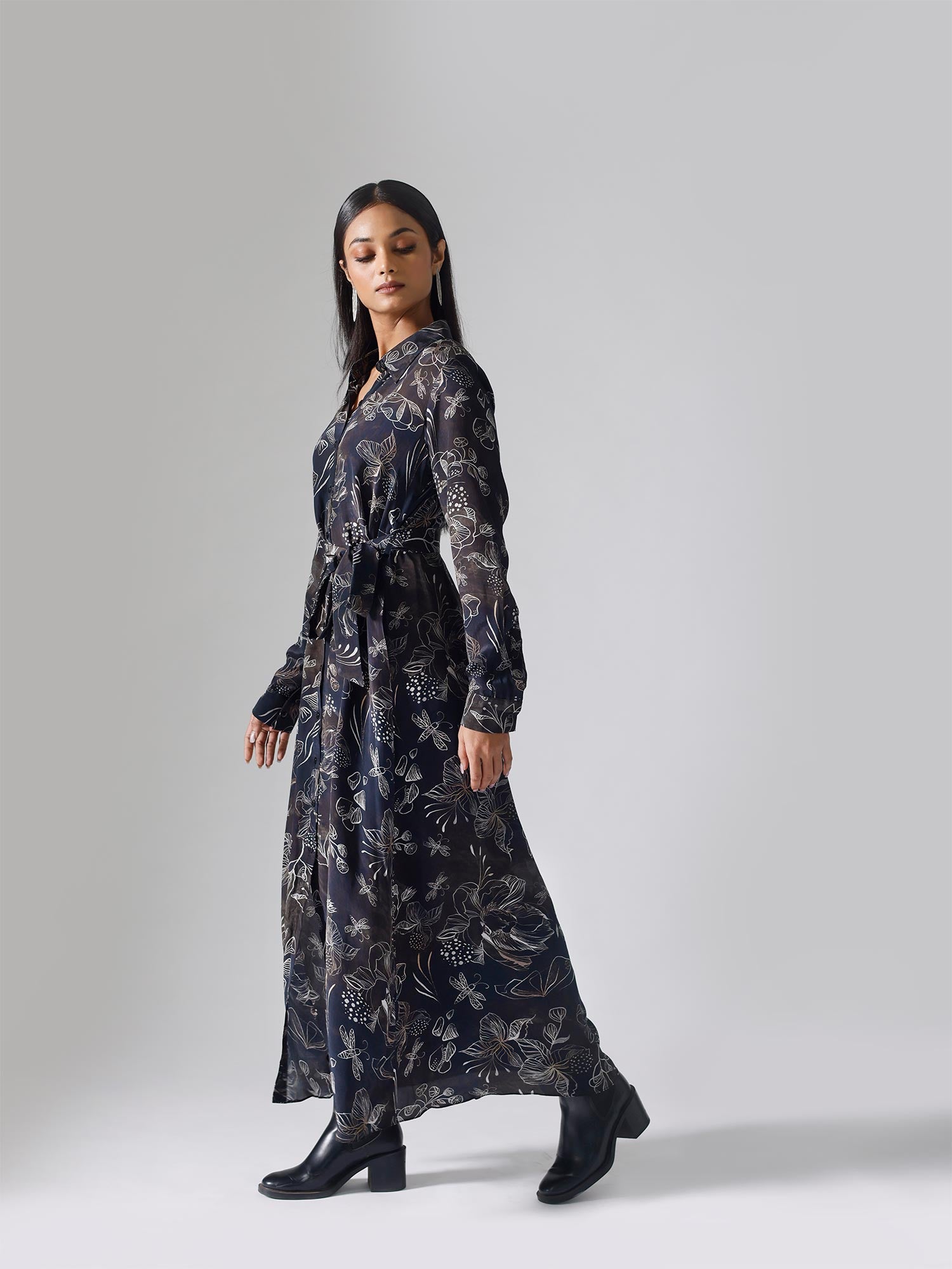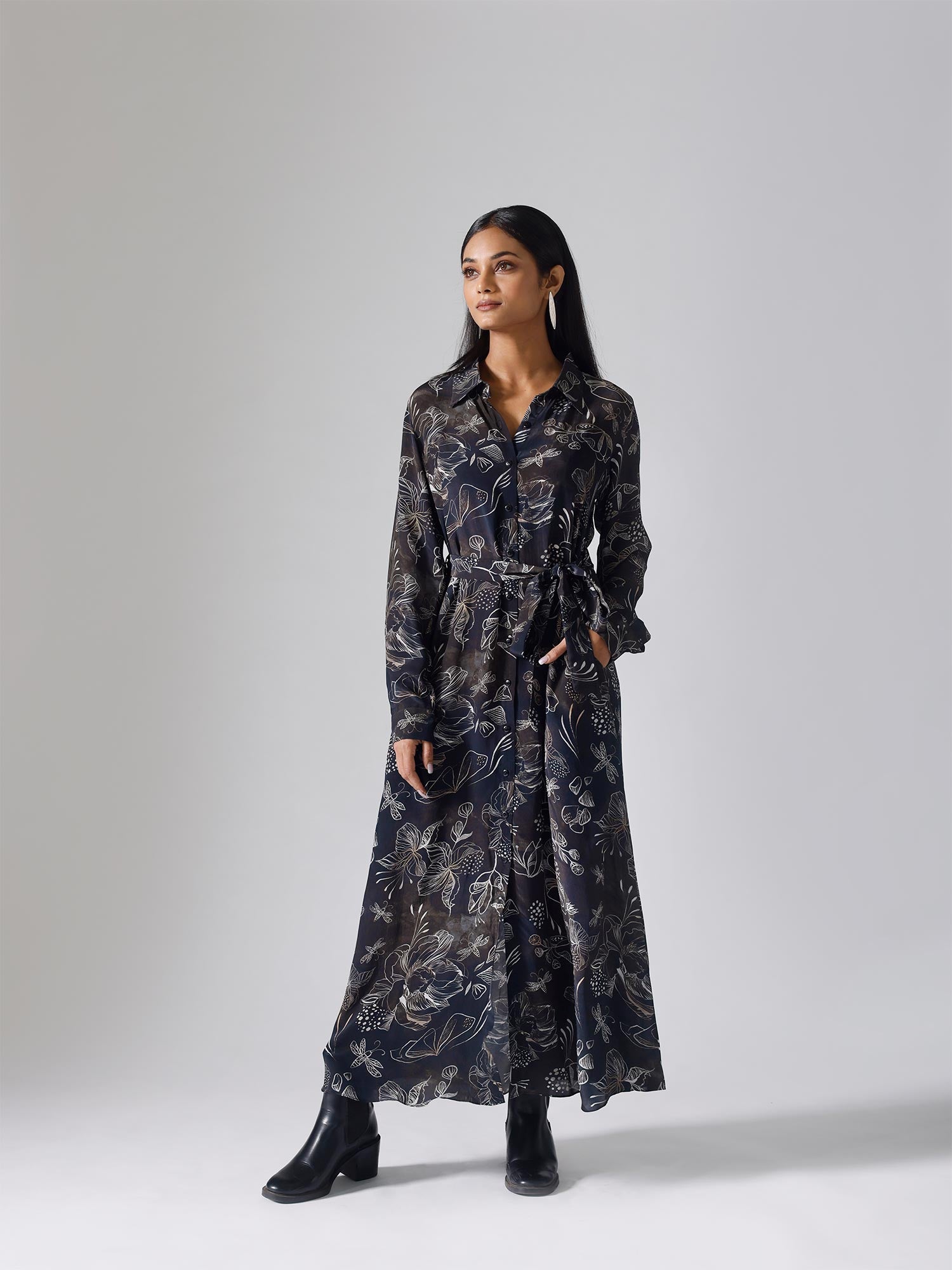 Printed long dress with belt and pockets. Sold as one set. Full sleeves.