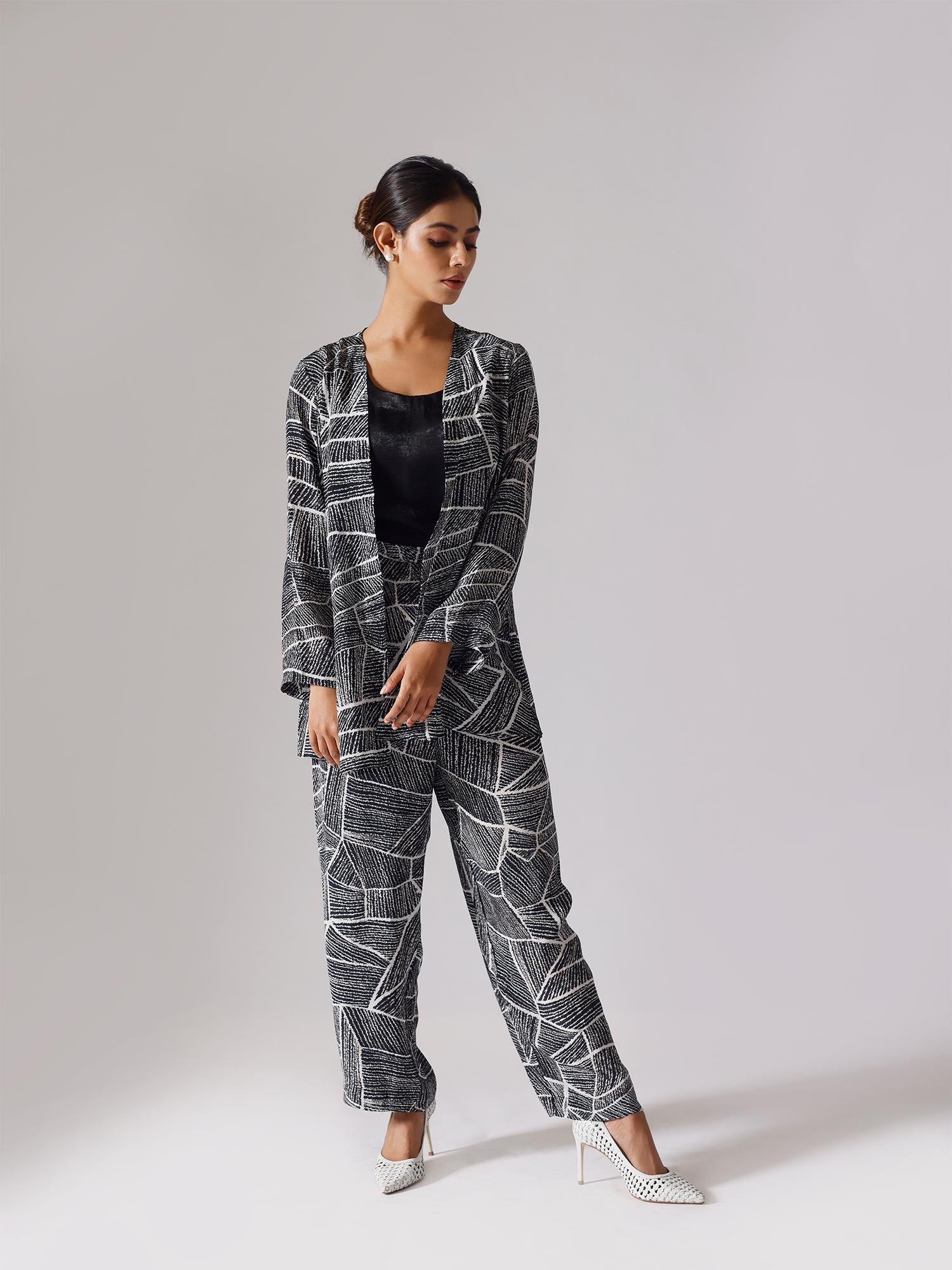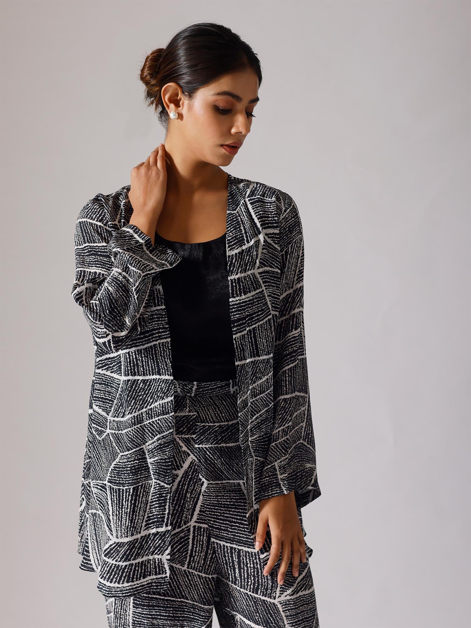Printed co-ordinated set. Sold as a set of 3. Full sleeve jacket. Inner is sleeveless.