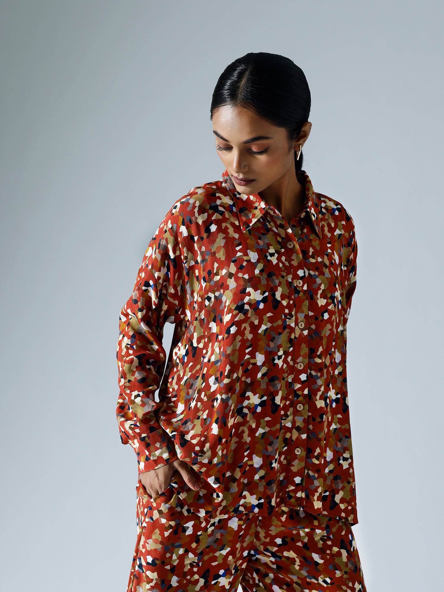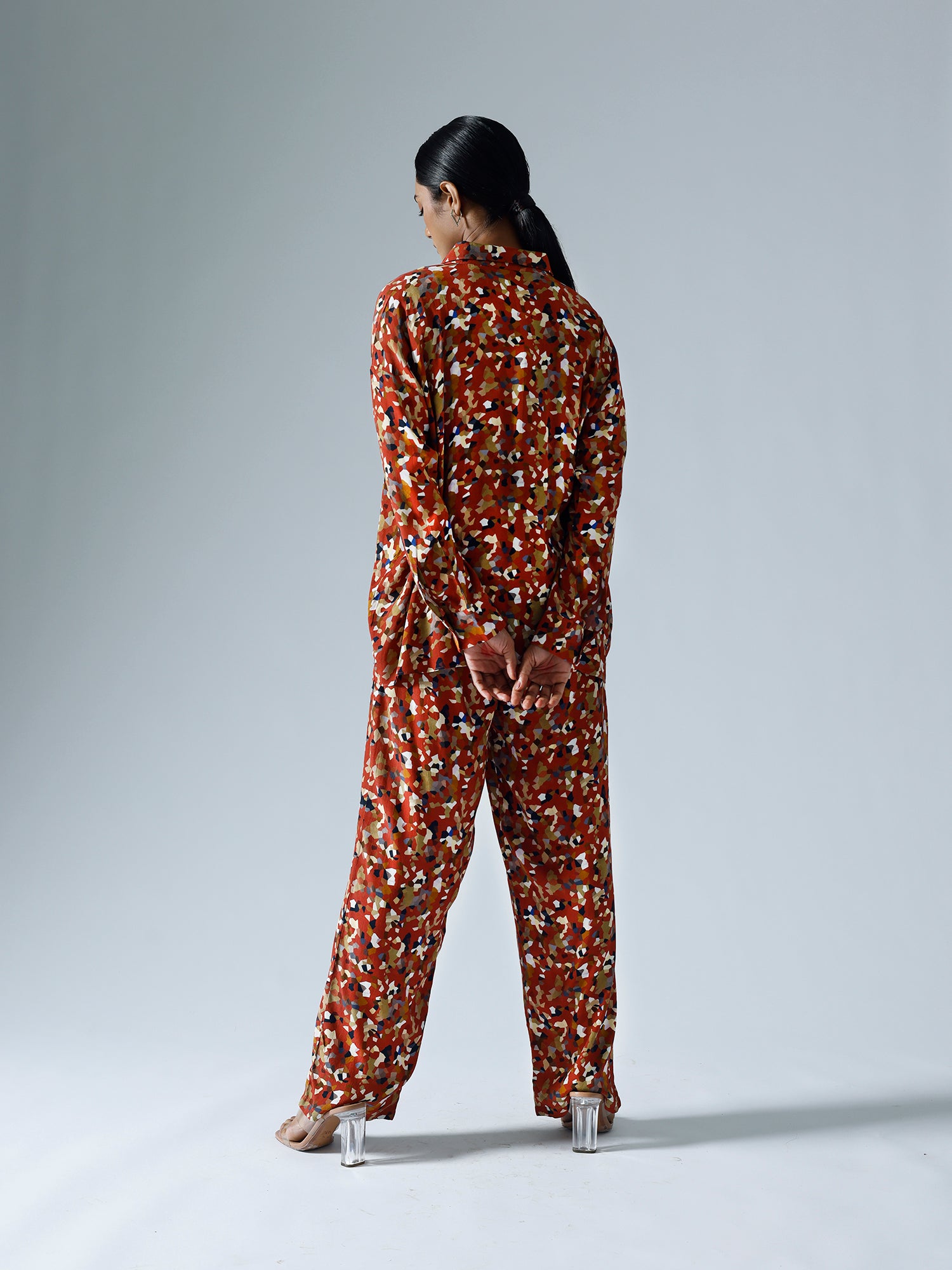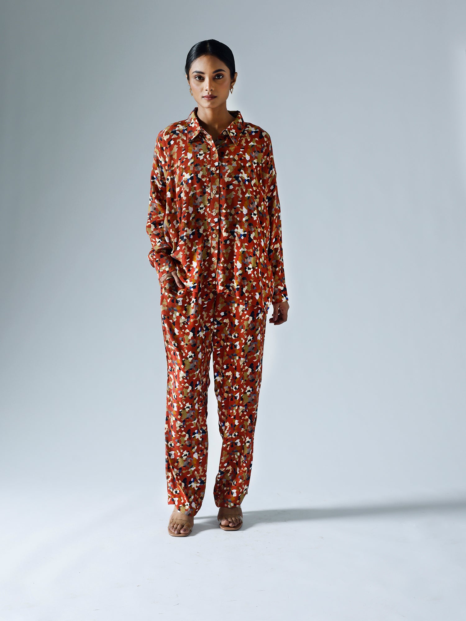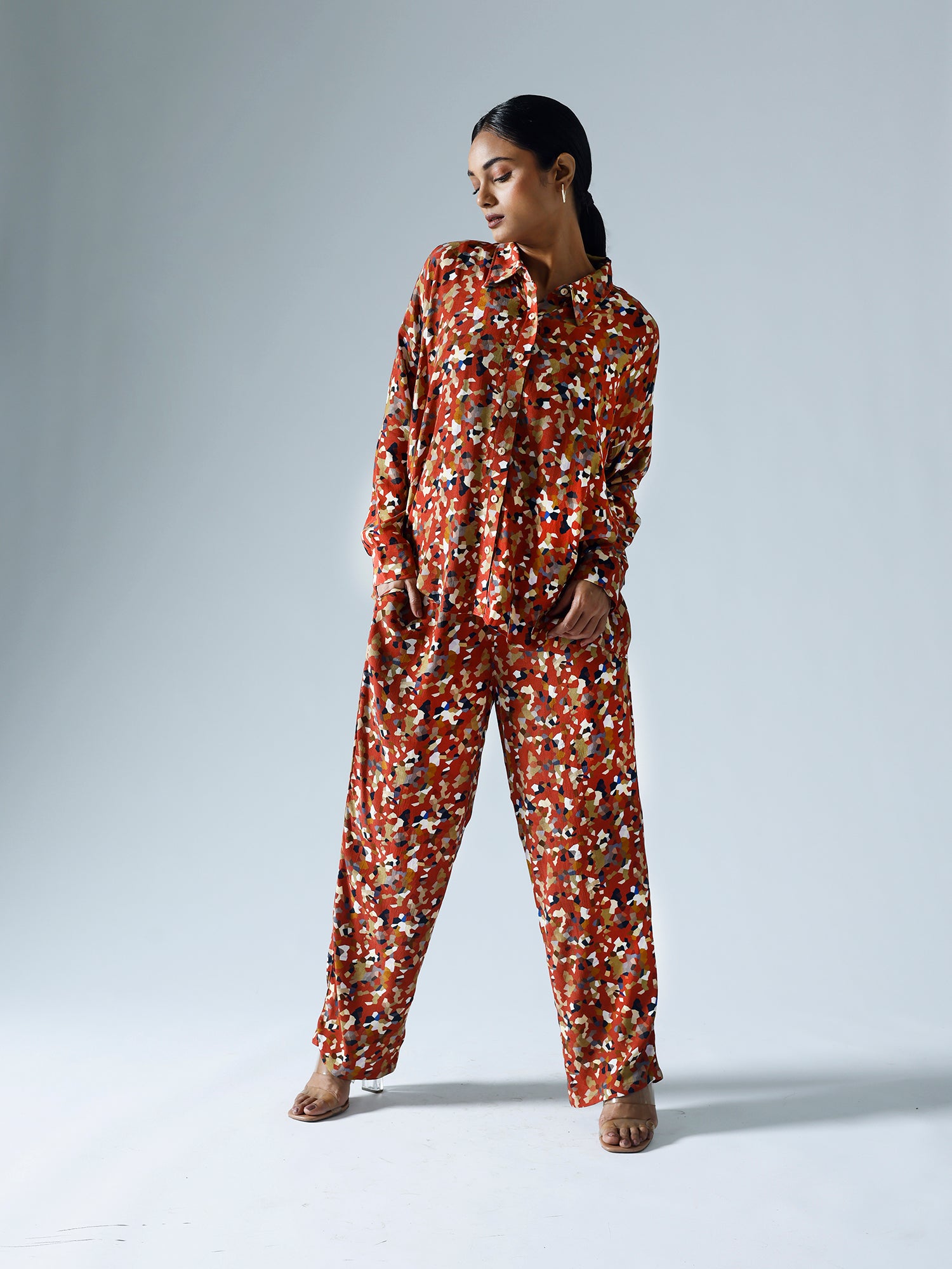 Box fit oversized shirt in full cuffed sleeves with front buttons. Pants with pocket and back elastic. Zip fly fastening with a single hook fastening on one side. Mid rise. Regular fit.