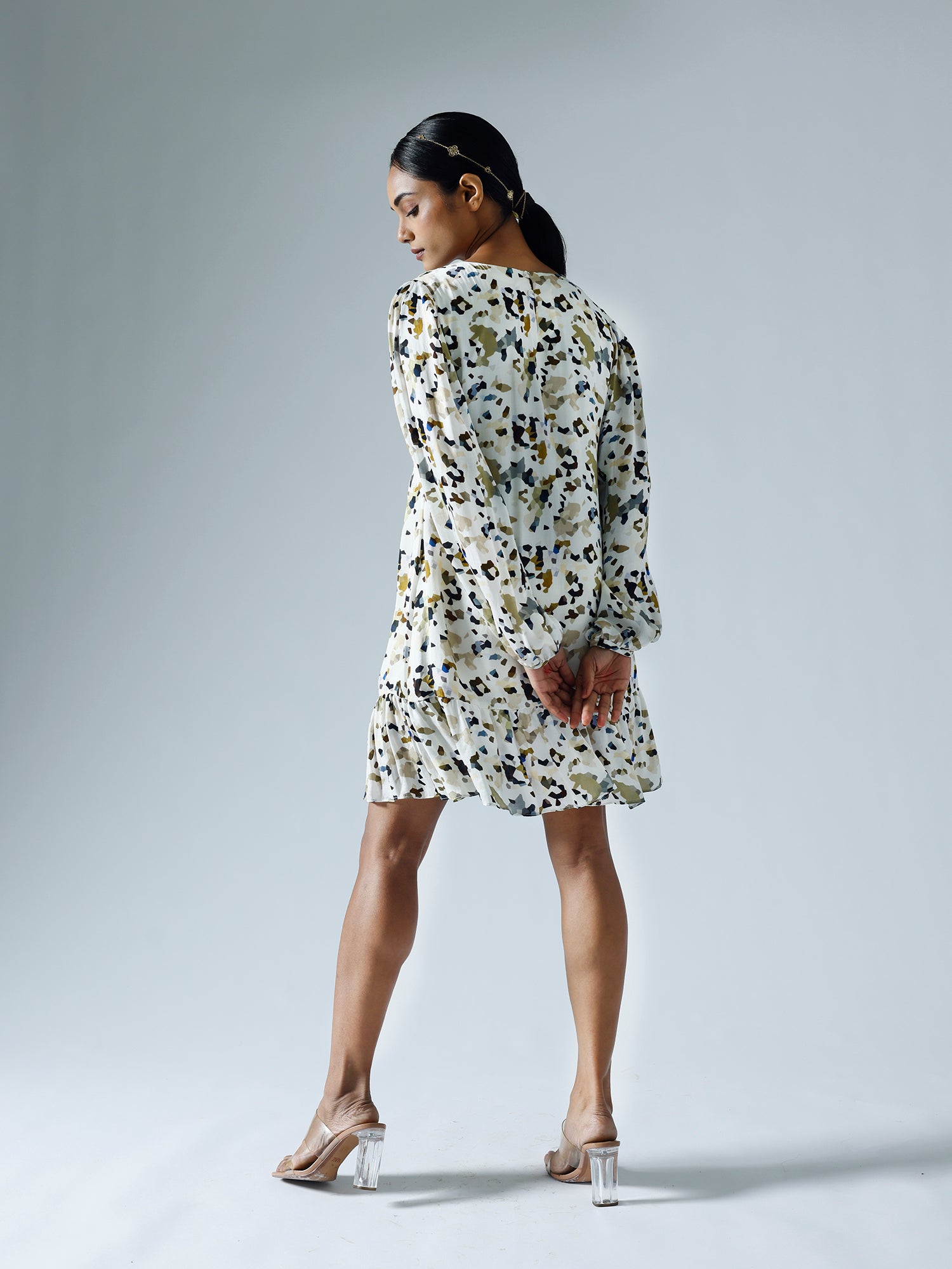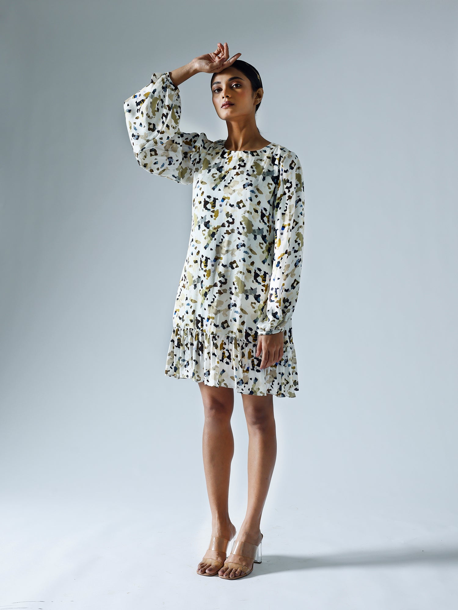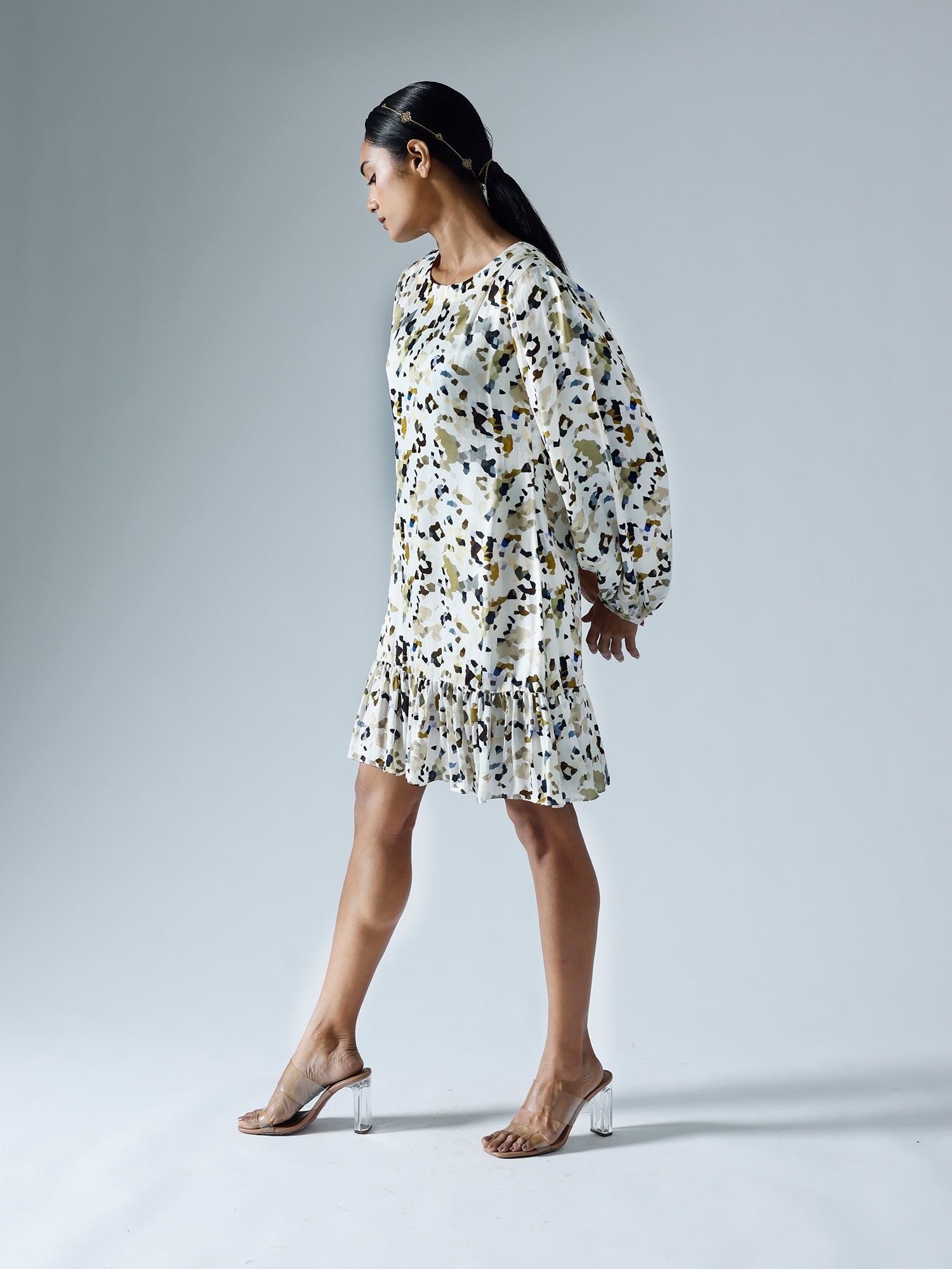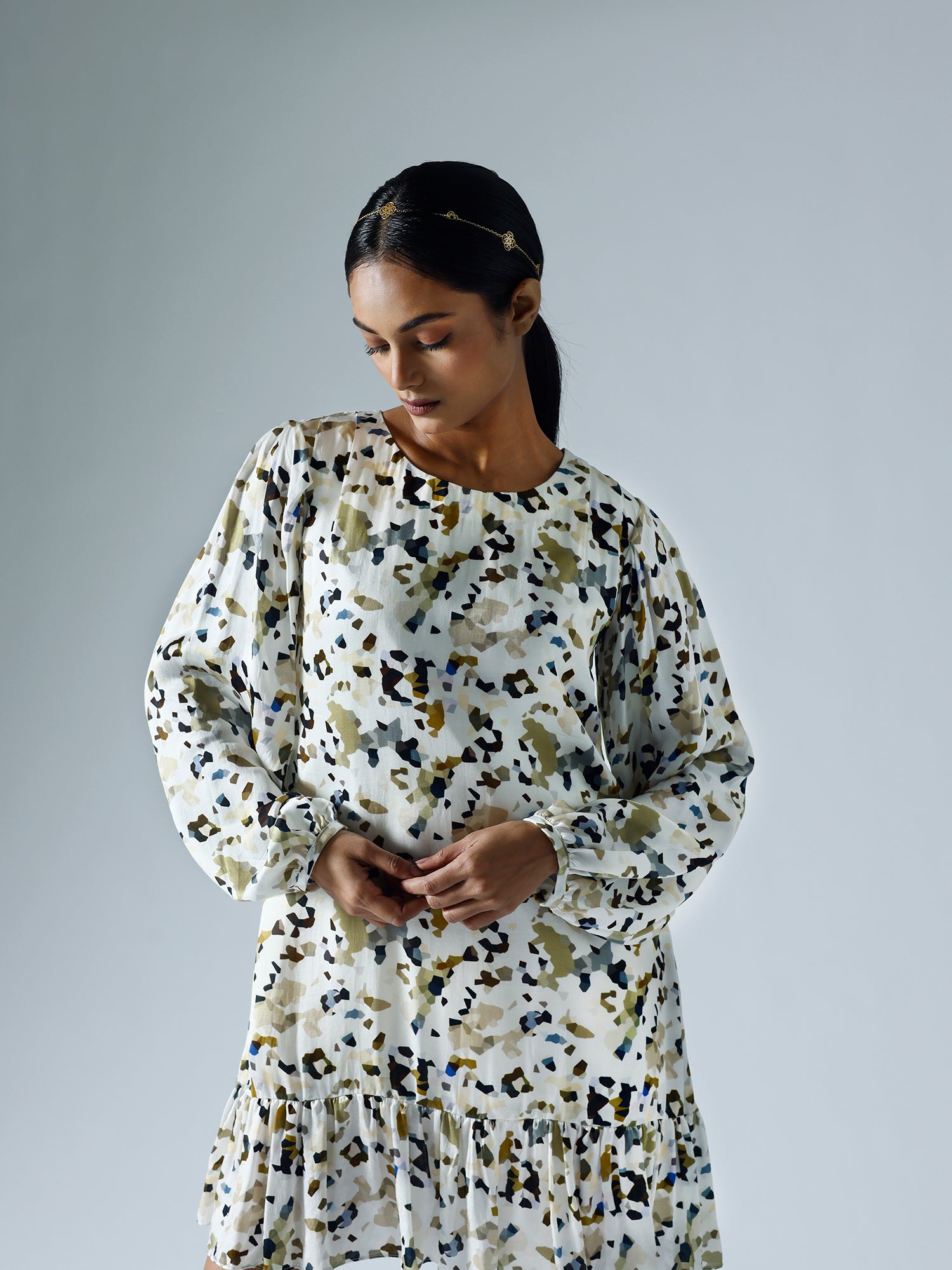 Printed shift dress with pleats detailing on the shoulder, sleeves and body. Sold as one set.