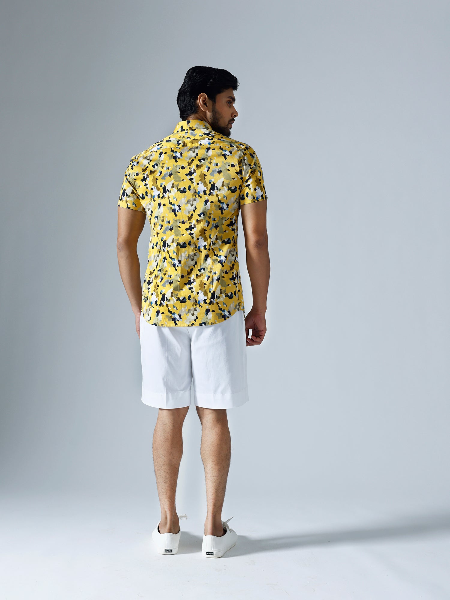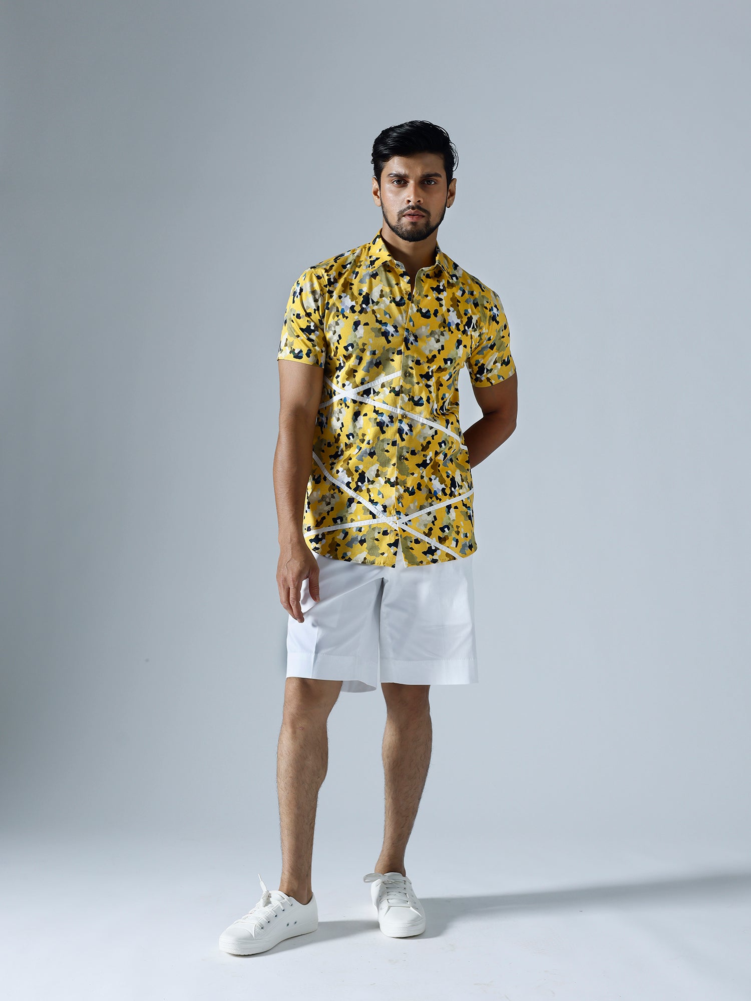 Printed yellow half sleeve shirt with a fitted sleeve and white highlighted criss-cross design feature at the forefront.