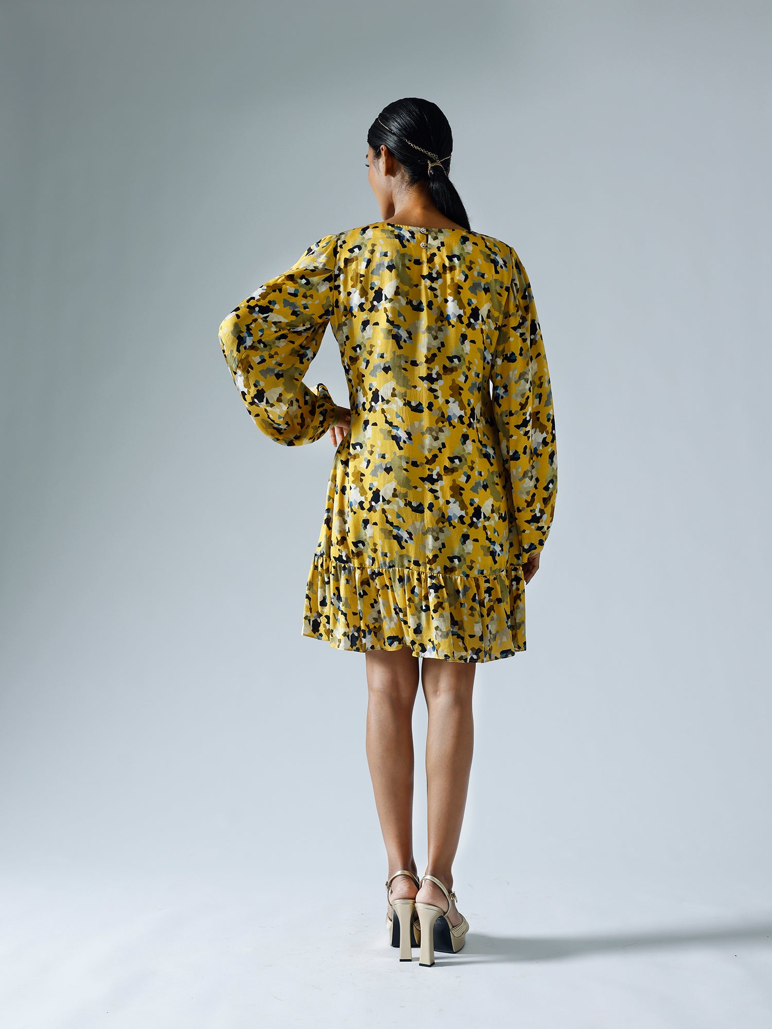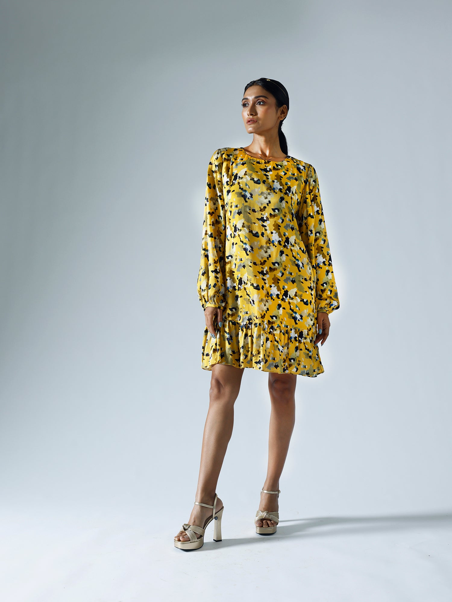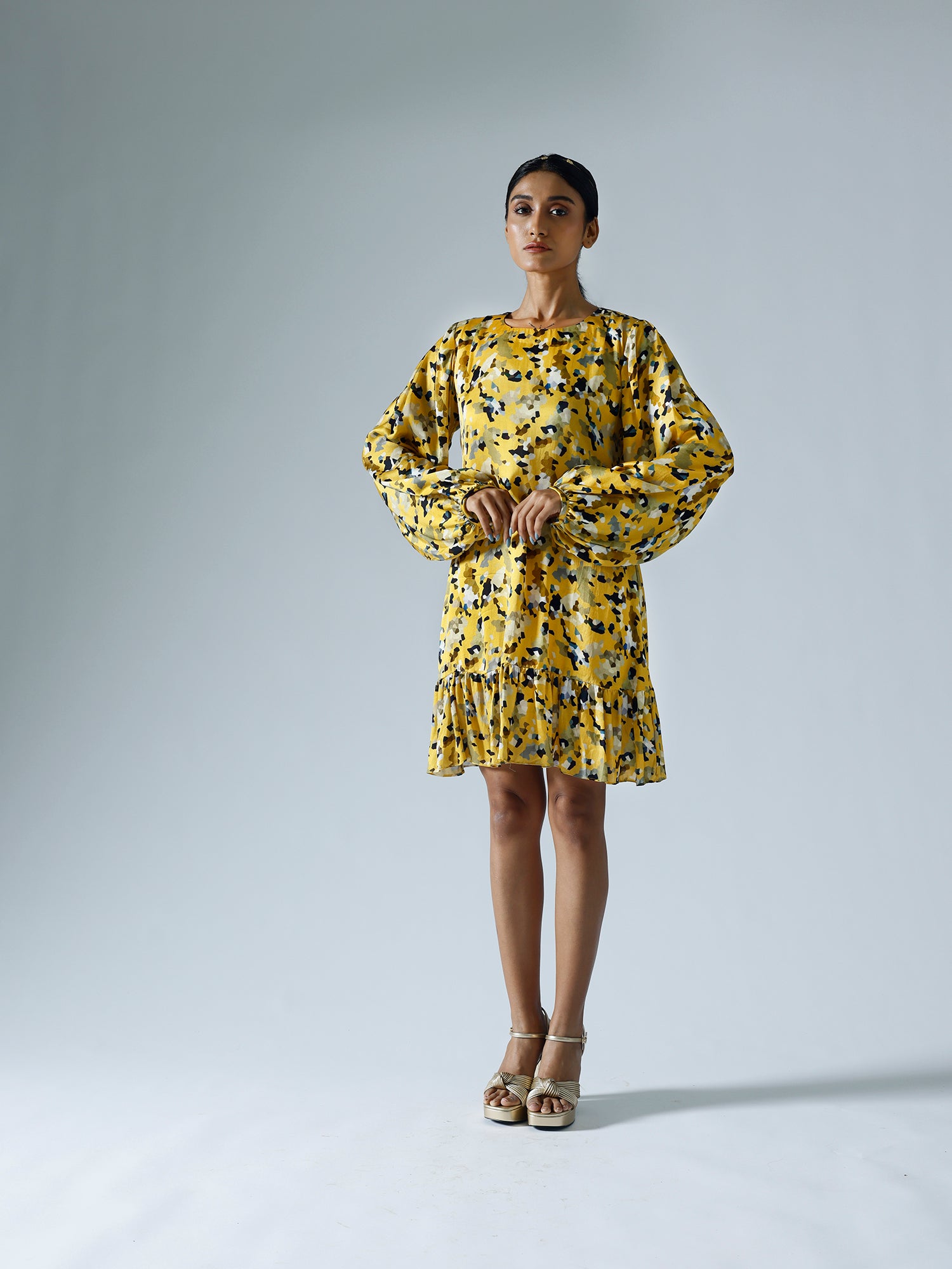 Printed shift dress with pleats detailing on the shoulder, sleeves and body. Sold as one set.