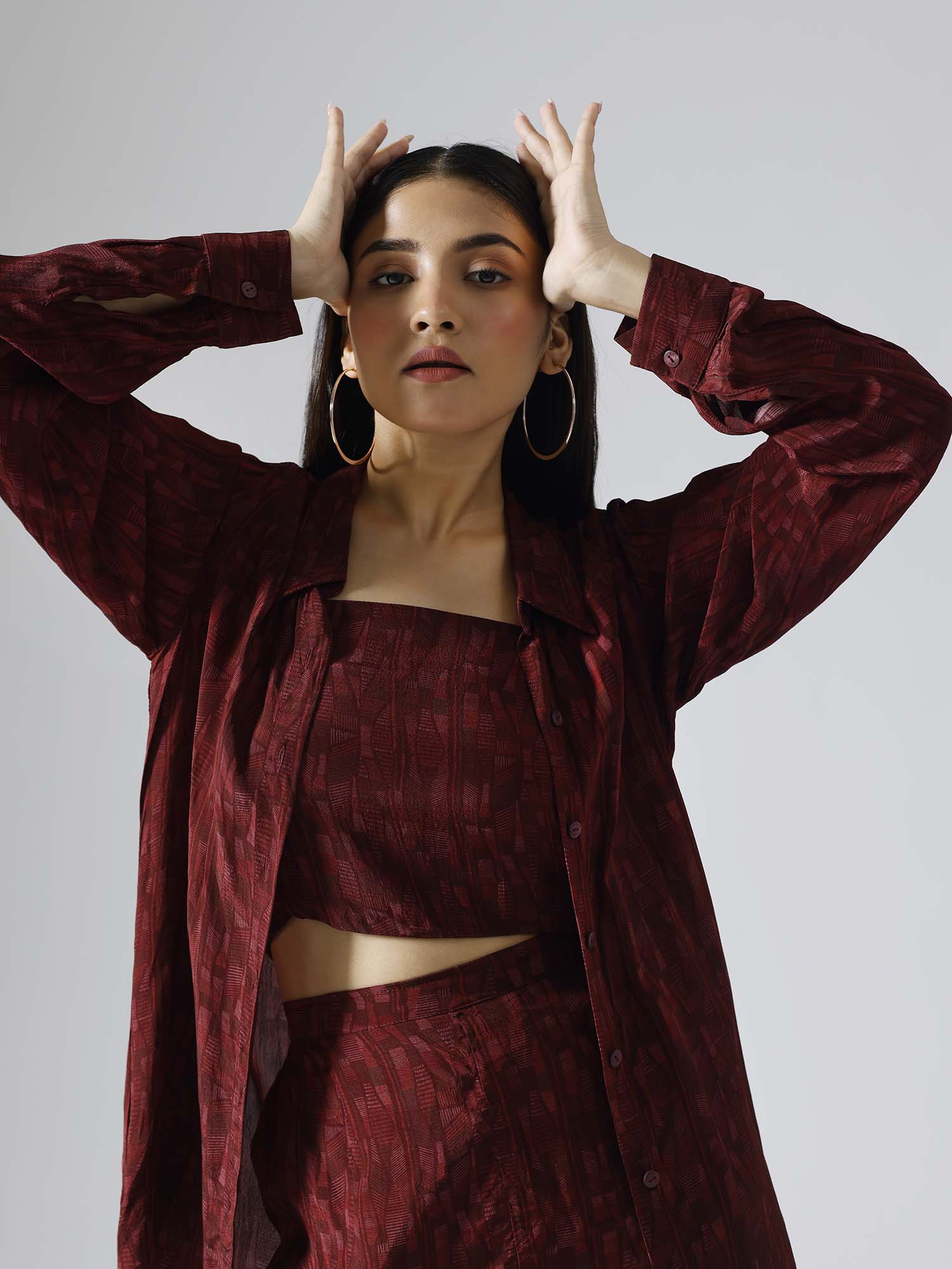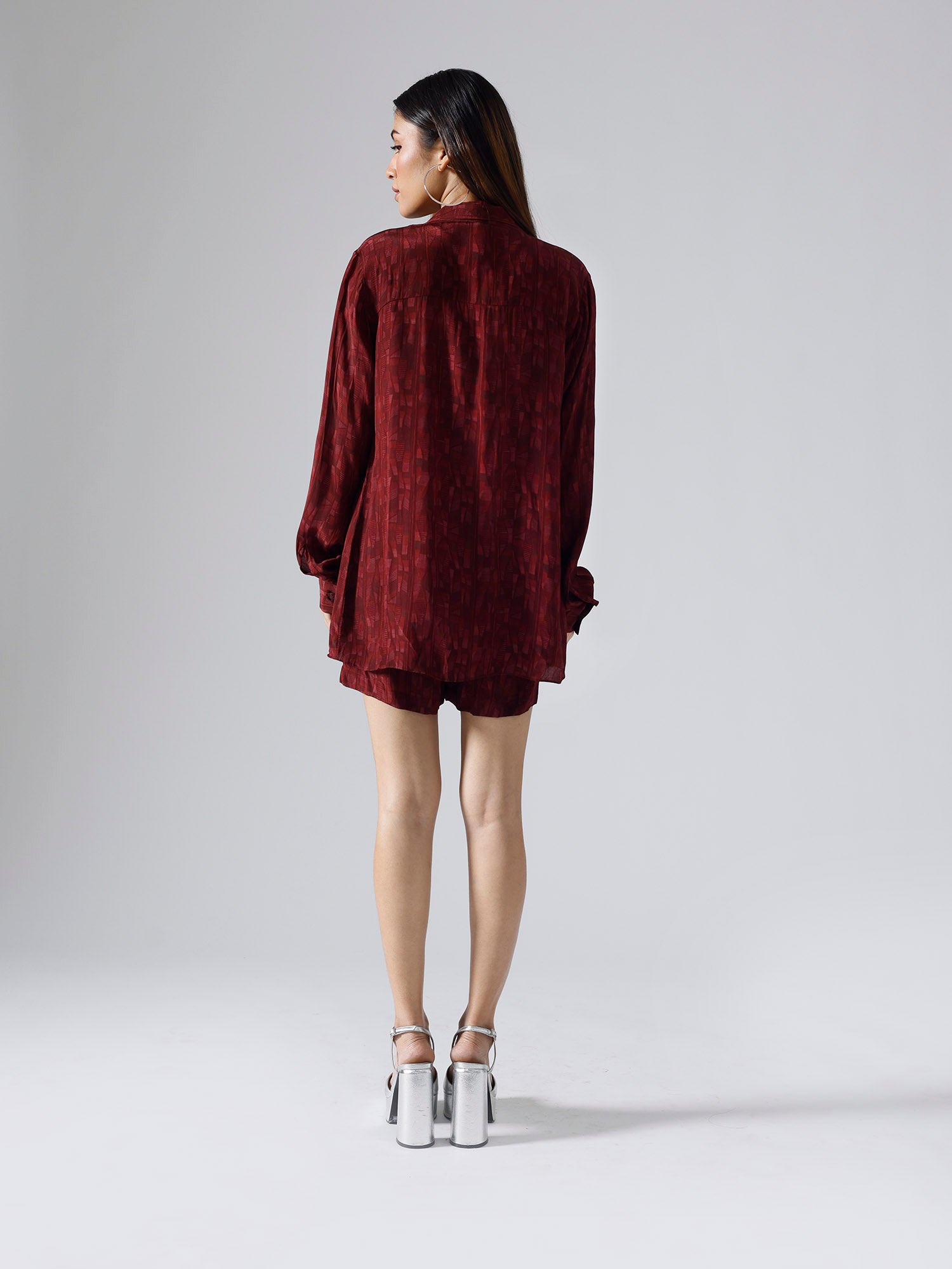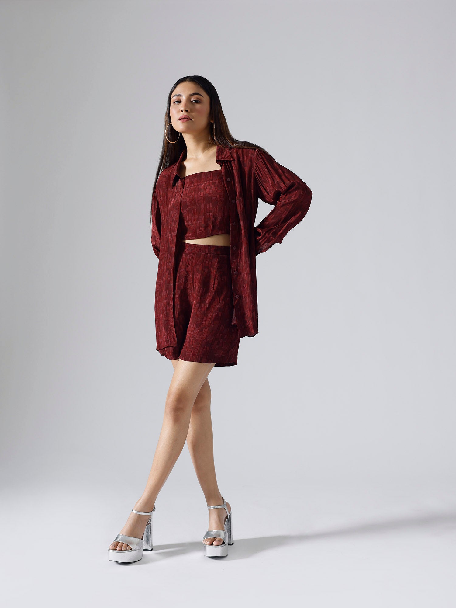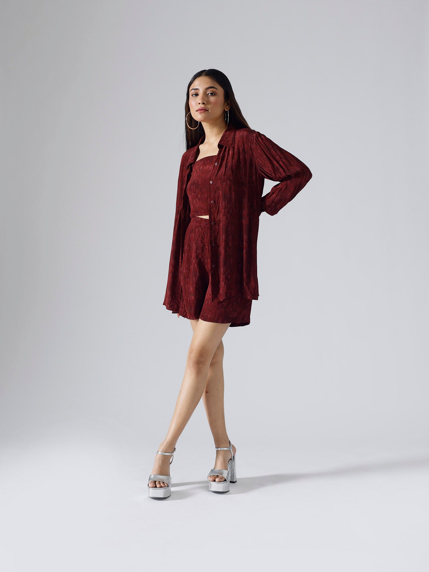 Printed co-ordinated shirt & shorts set with inner. Sold as a set of 3. Full sleeve shirt with front buttons. Shorts with pocket and back elastic. Zip fly fastening with a single hook fastening on one side. Mid rise. Regular fit.
