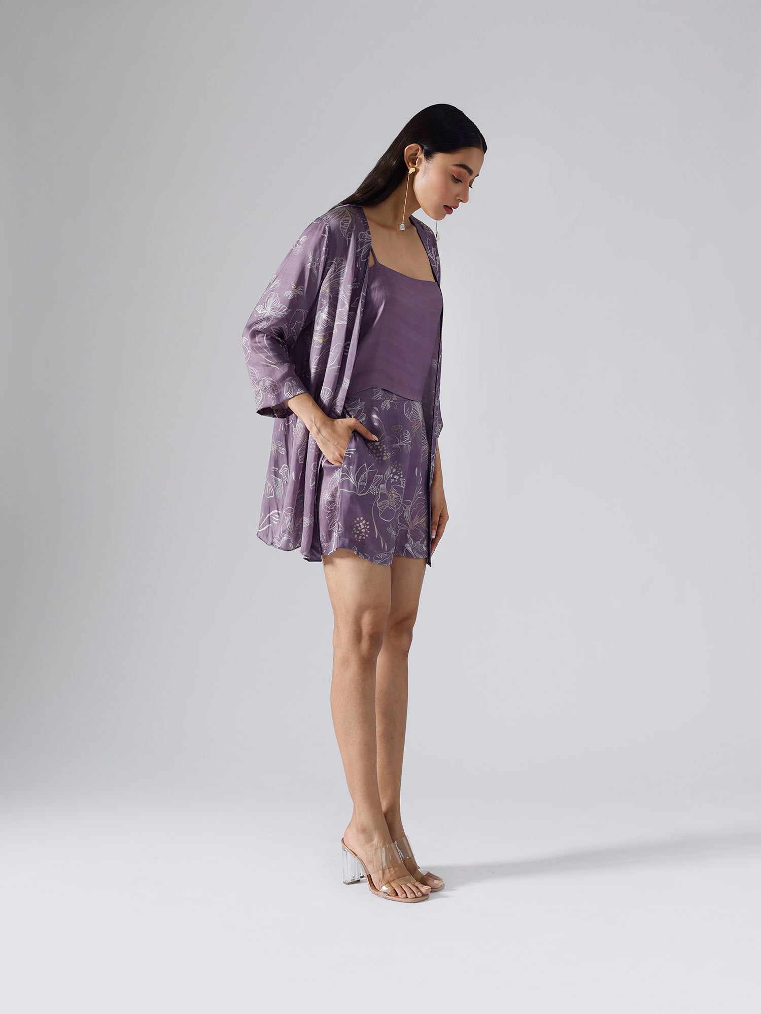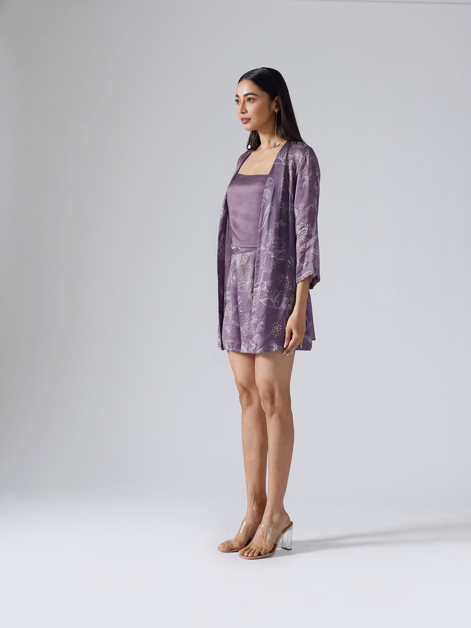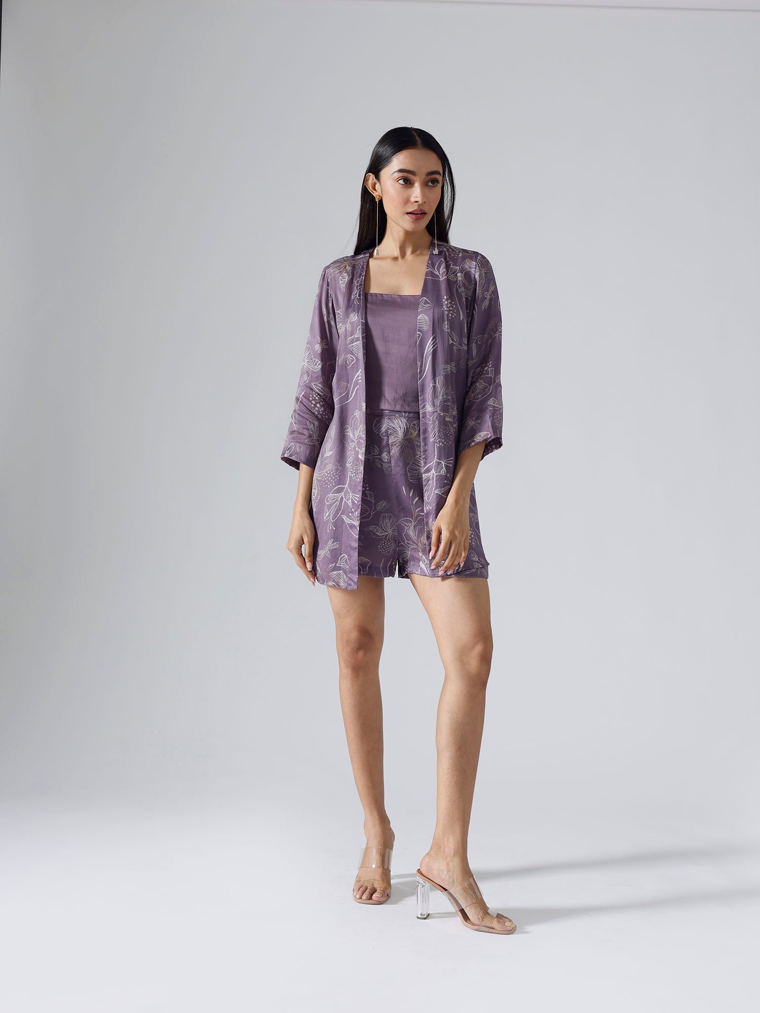 Printed co-ordinated jacket & shorts set with inner & belt. Sold as a set of 3. Three-fourth sleeve jacket. Shorts with pocket and back elastic. Zip fly fastening with a single hook fastening on one side. Mid rise. Regular fit. Belt is separate
