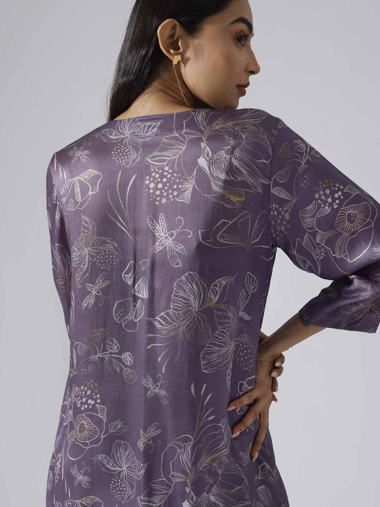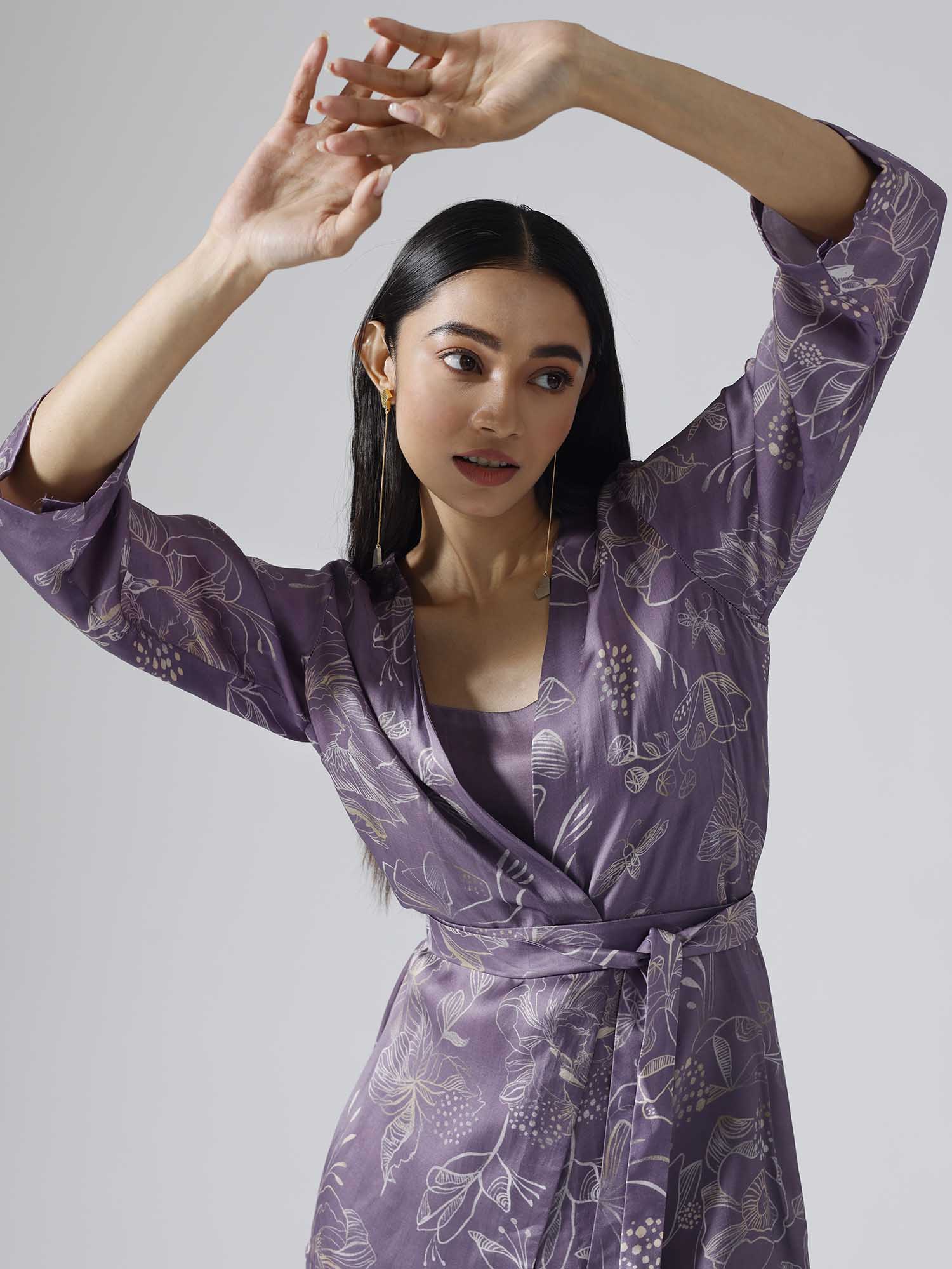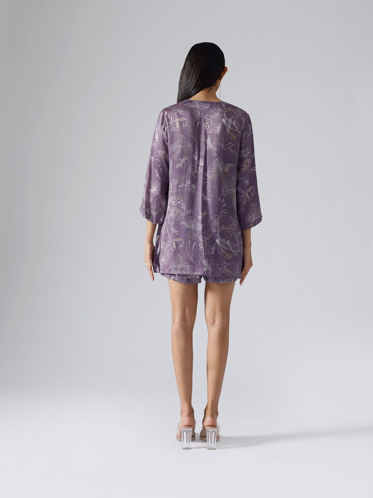Printed co-ordinated jacket & shorts set with inner & belt. Sold as a set of 3. Three-fourth sleeve jacket. Shorts with pocket and back elastic. Zip fly fastening with a single hook fastening on one side. Mid rise. Regular fit. Belt is separate