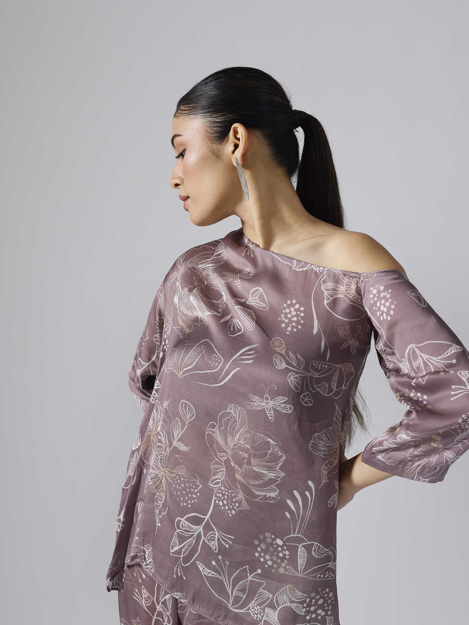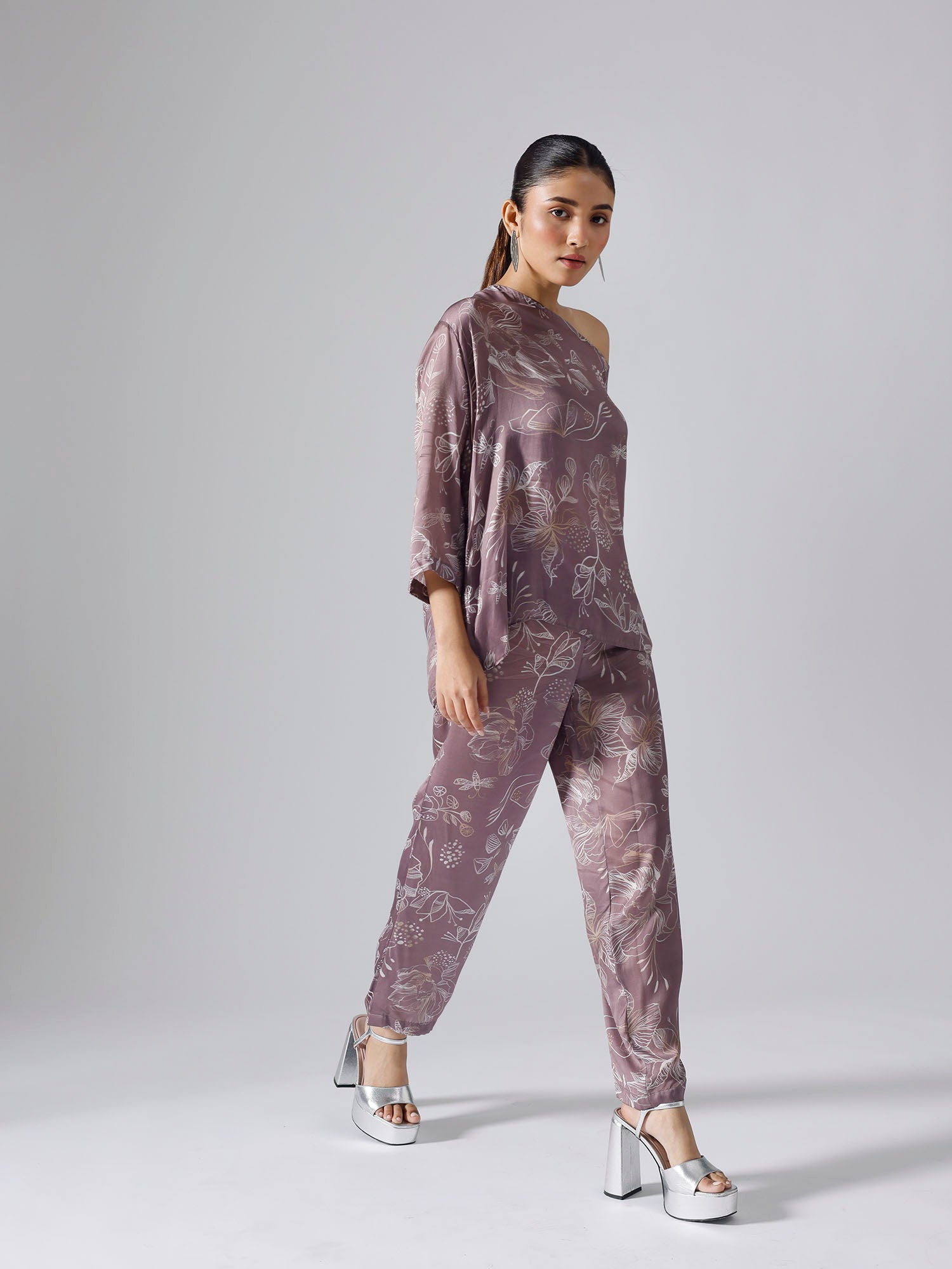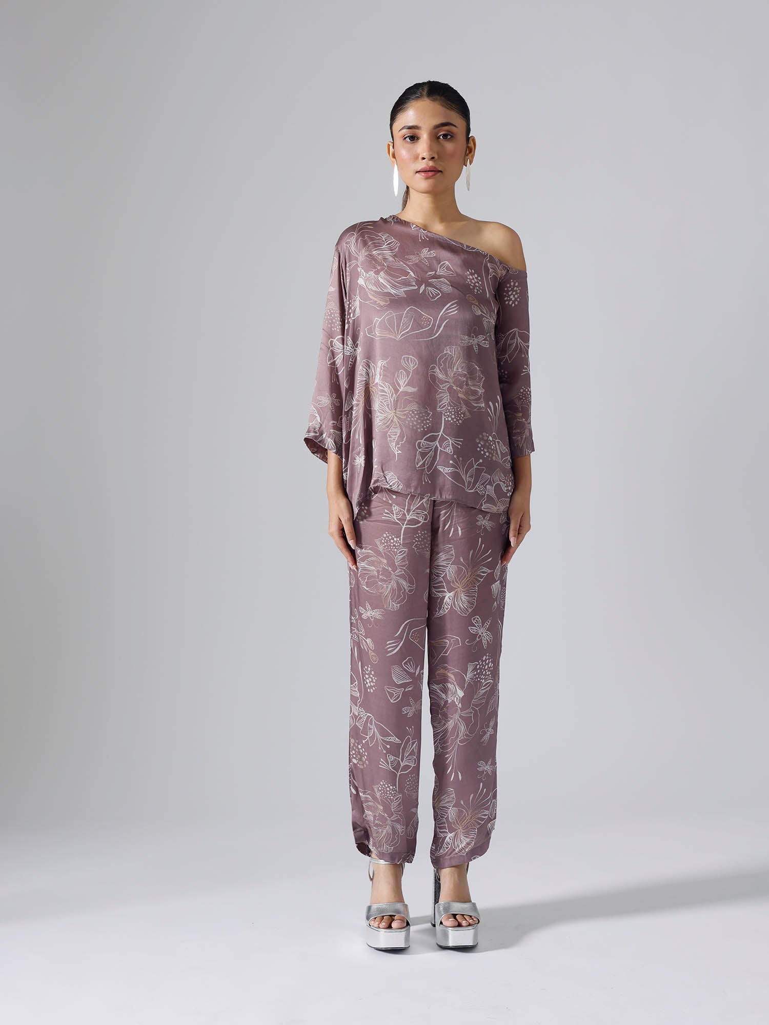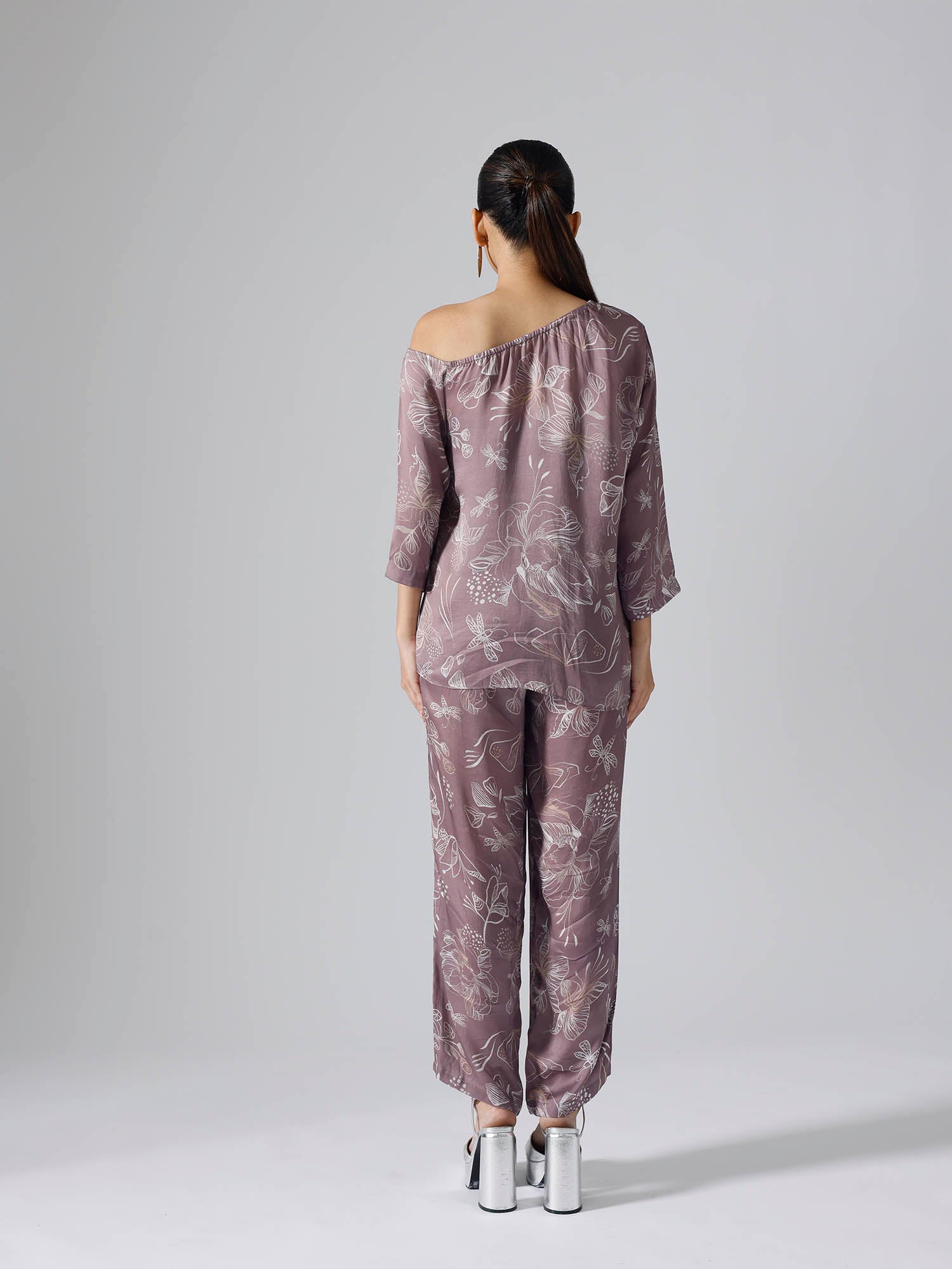 Printed drop shoulder co-ordinated set. Sold as a set of 2. Three fourth sleeve top. Pants with pocket and back elastic. Zip fly fastening with a single hook fastening on one side. Mid rise. Regular fit.