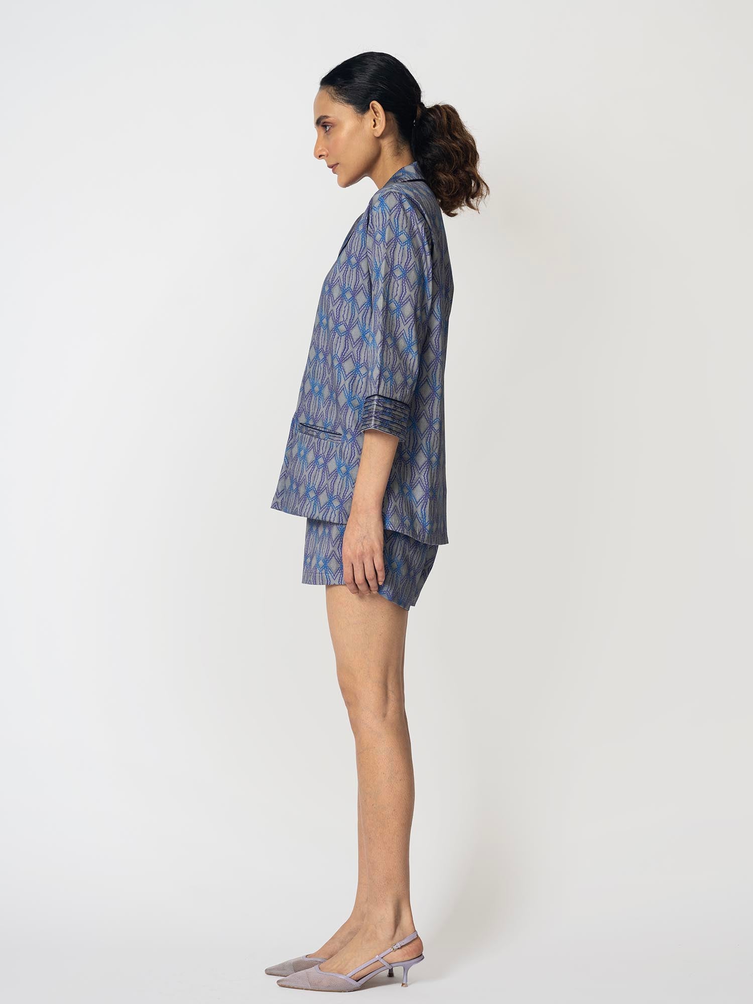 Shirt with blazer collar. Three fourth sleeve with pleated cuff. Shorts with pocket and back elastic. Zip fly fastening with a single hook fastening on one side. Mid rise. Regular fit.