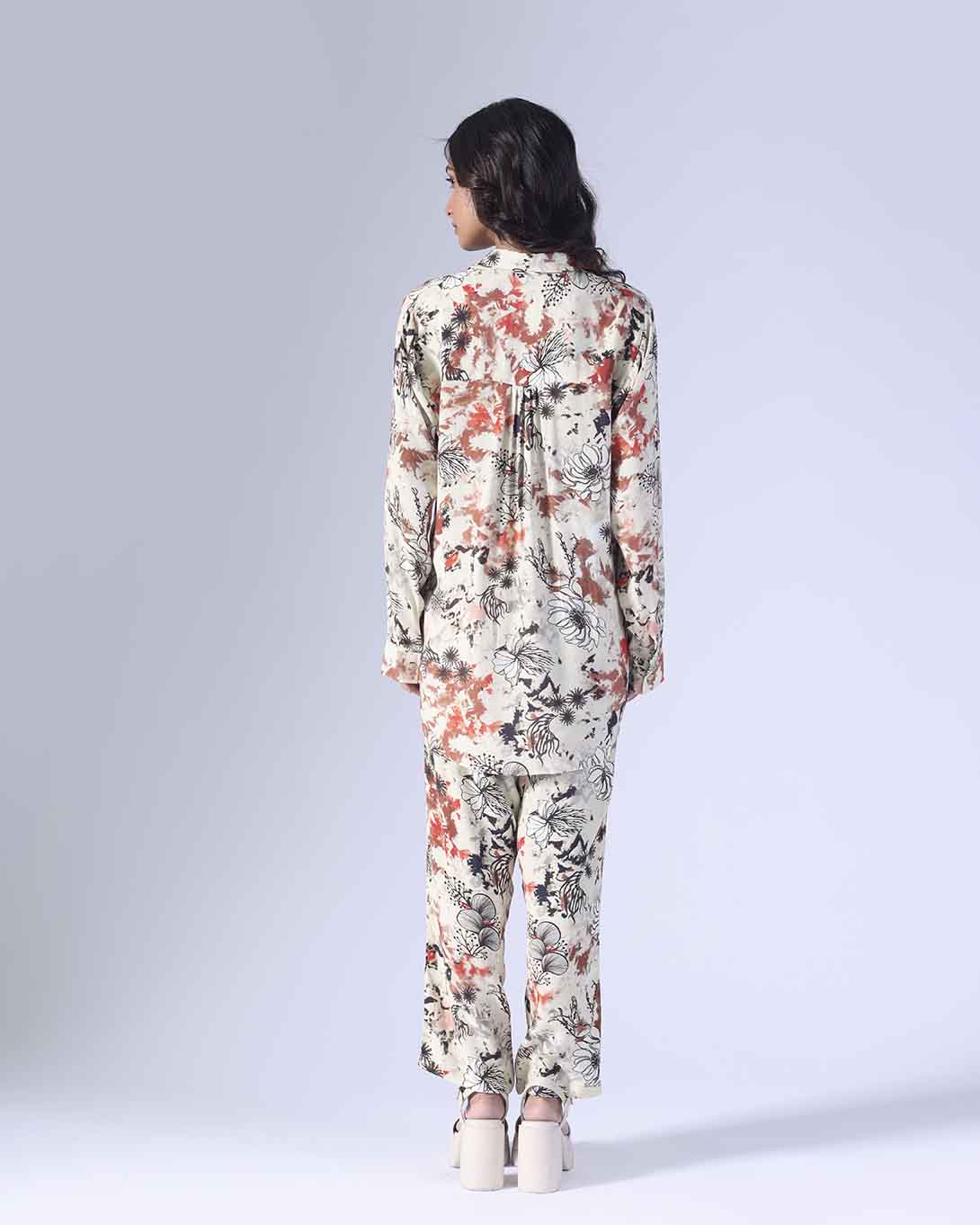 Printed co-ordinated set. Sold as a set of 2. Shirt with full cuff sleeve, with front buttons. Back with thin pleats. Pants with pocket and back elastic. Zip fly fastening with a single hook opening on one side. Mid rise. Regular fit.