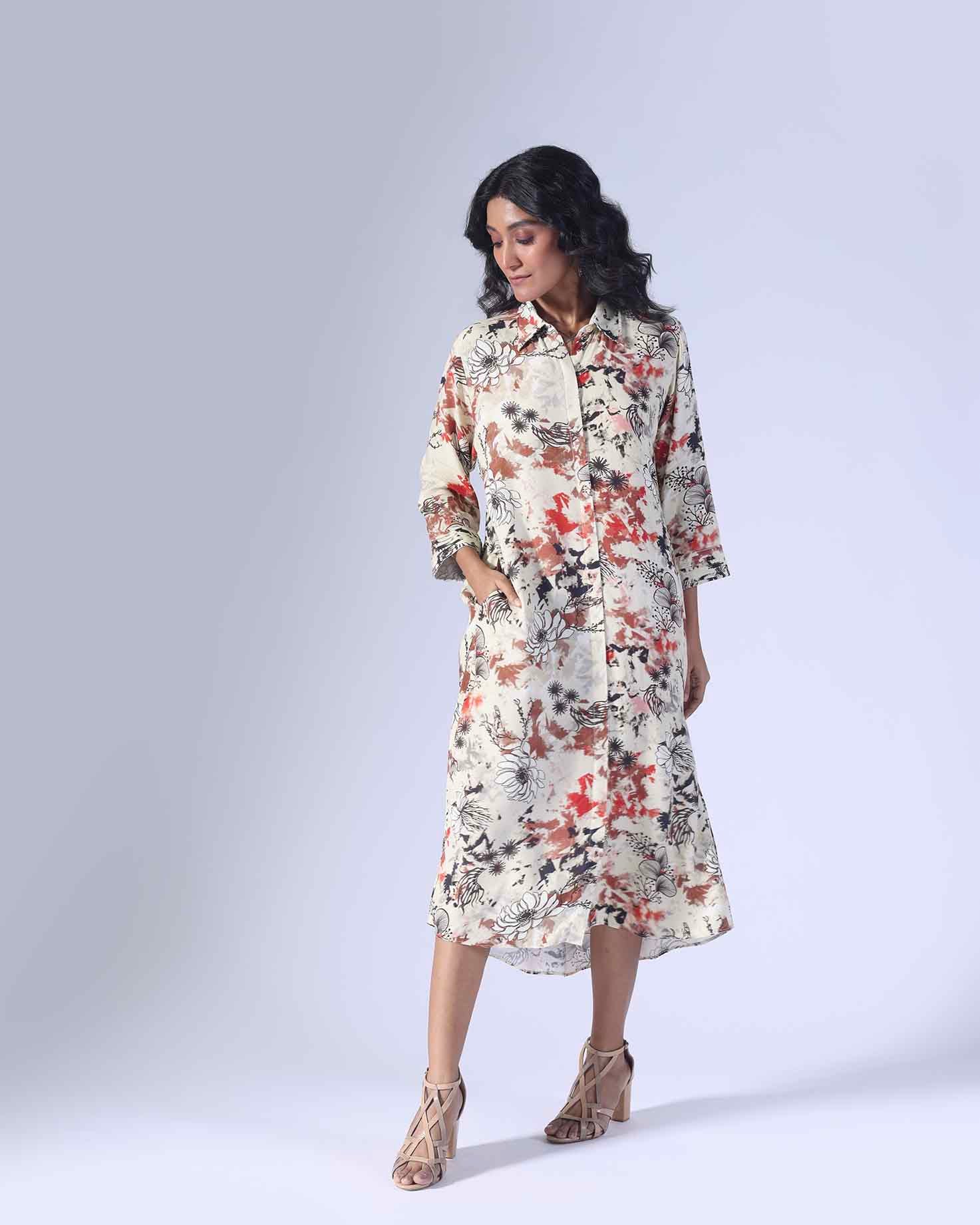 Printed long co-ordinated set. Sold as a set of 2. Shirt collar with front concelaed buttons. Three fourth pleated sleeves. Back with thin pleats. Pants with pocket and back elastic. Zip fly fastening with a single hook opening on one side. Mid rise. Regular fit.