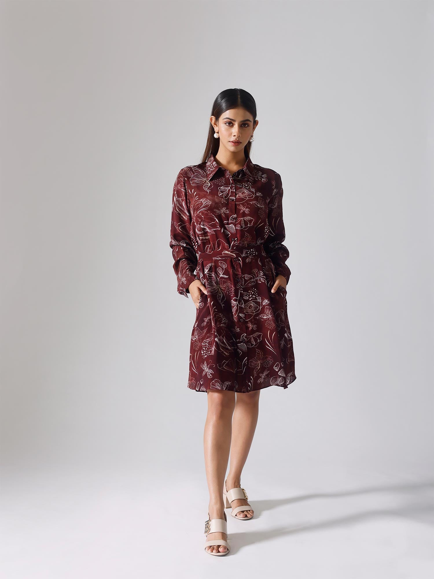 Printed shirt dress with belt and pockets. Sold as one set. Full sleeves.