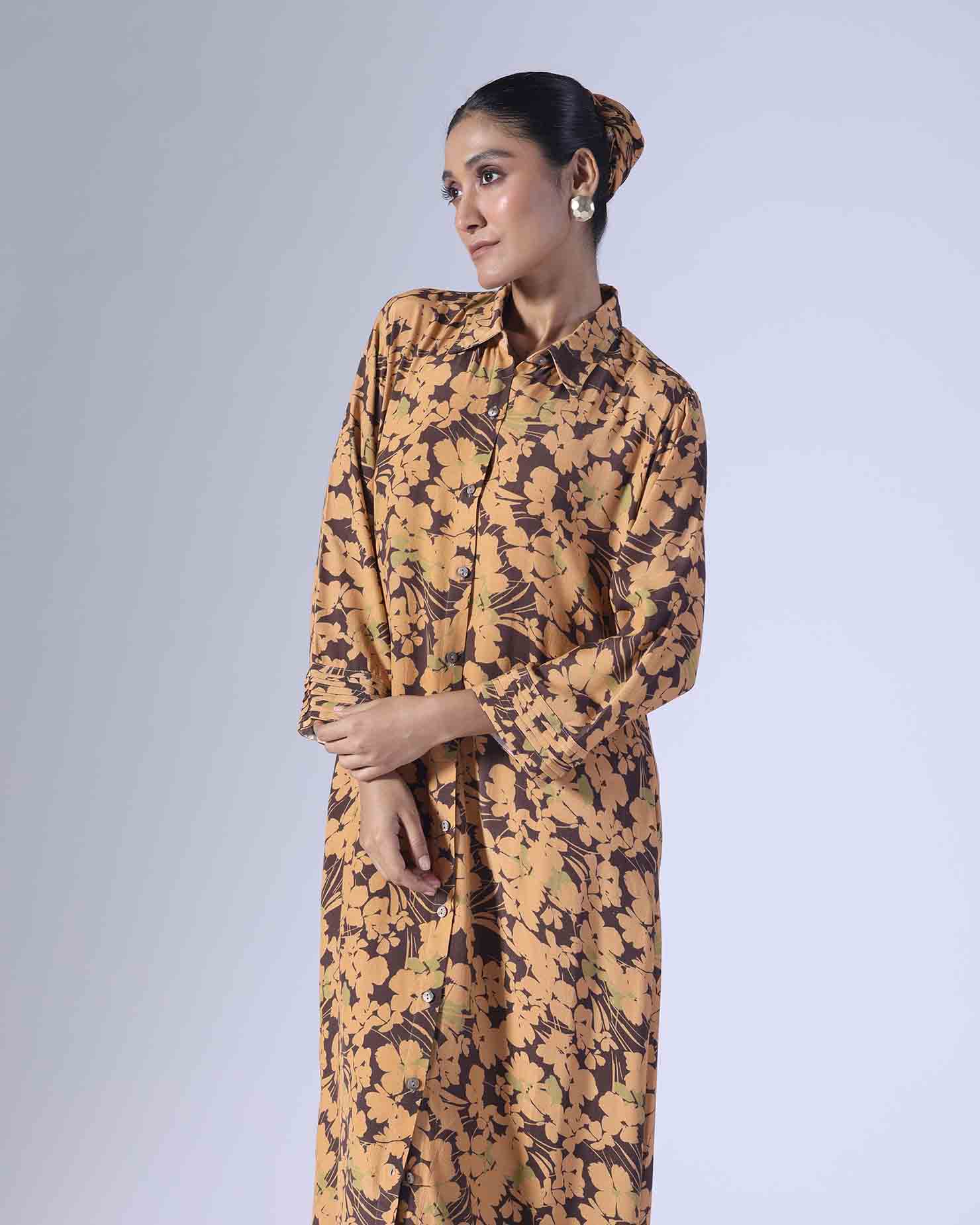 Printed long dress with belt and pockets. Sold as one set. Three-fourth pleated sleeves. Front open with buttons. Belt is separate. Regular fit.