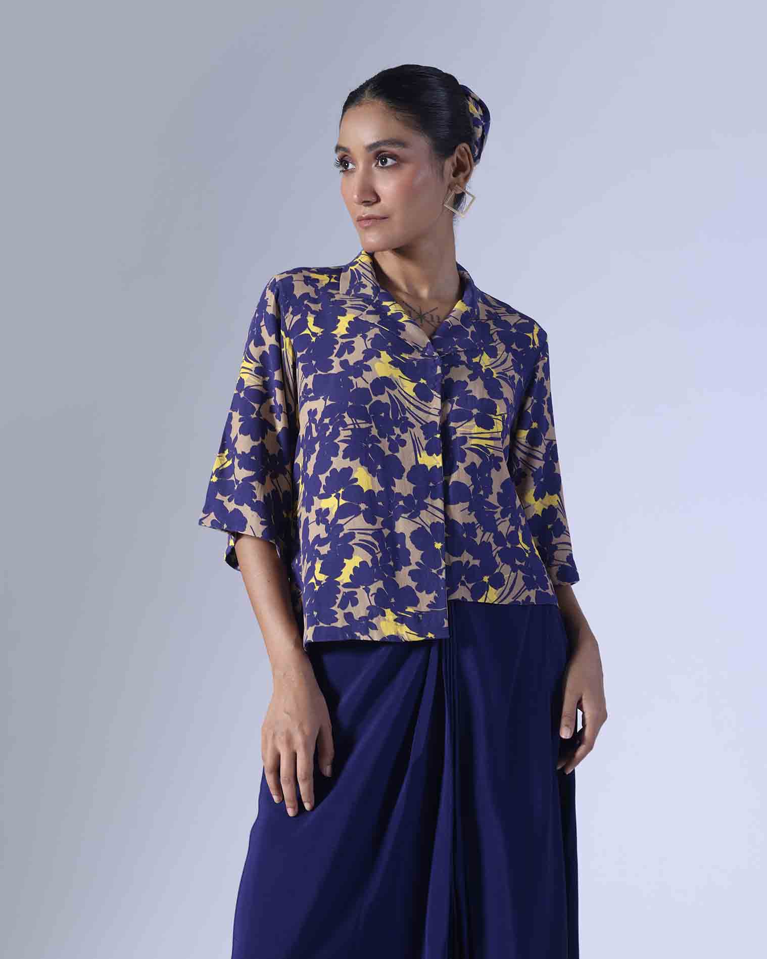 Printed co-ordinated set. Sold as a set of 2. Assymetrical front open top. Draped skirt, with side slit and back elastic. Zip fly fastening with a single hook opening on one side. Mid rise. Regular fit.